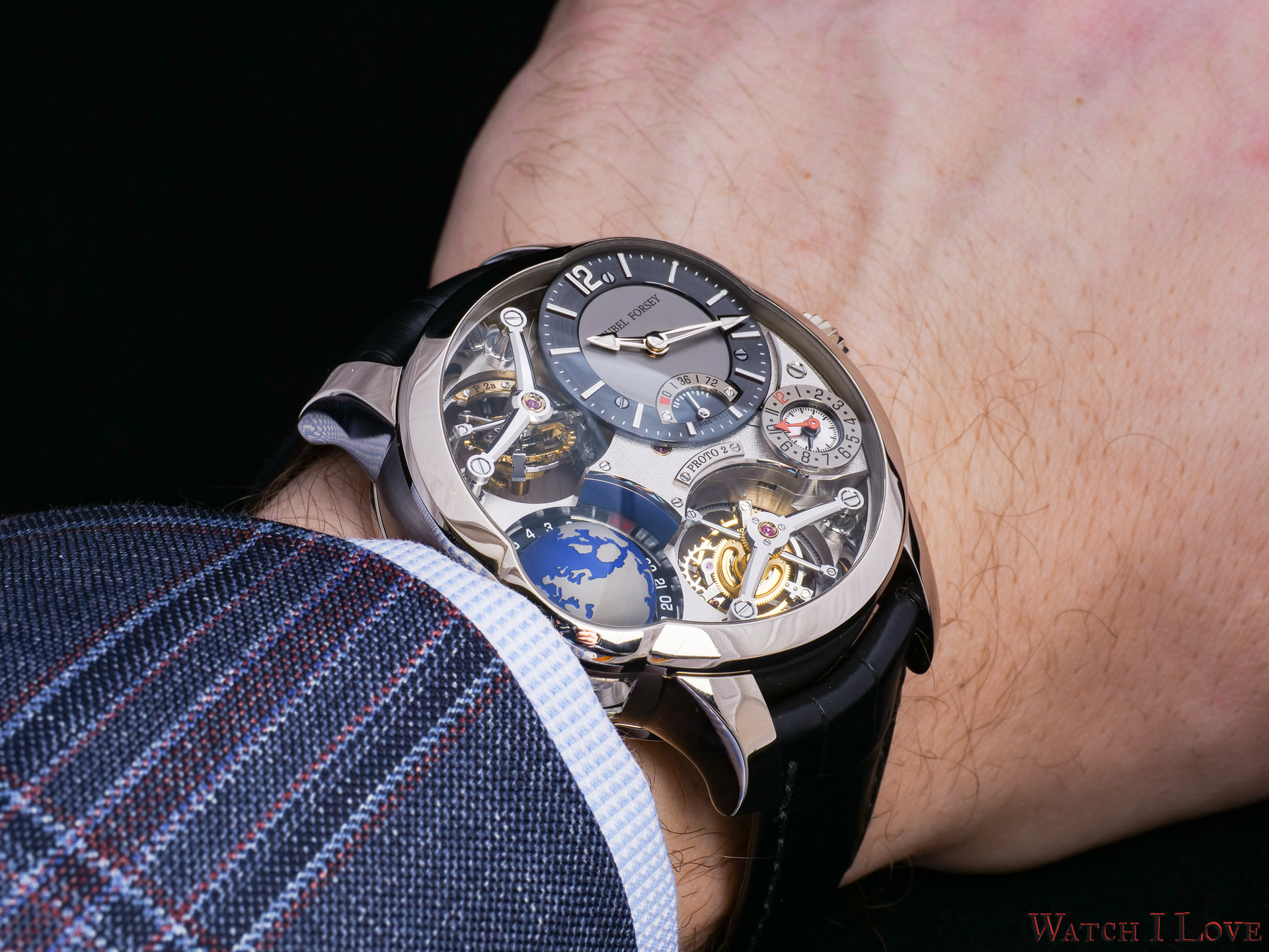 On my small wrist, the Greubel Forsey GMT Quadruple Tourbillon is a large but exceptional good looking presence. I usually stop at 41 mm when considering comfortable pieces. But somehow, the “greatness” (metaphoric sense) of this piece overwhelms the greatness of seise and weight. Anyway, if you are used to a platinum or gold bracelet watch, this will not feel different. Somehow, it feels very right on the wrist.