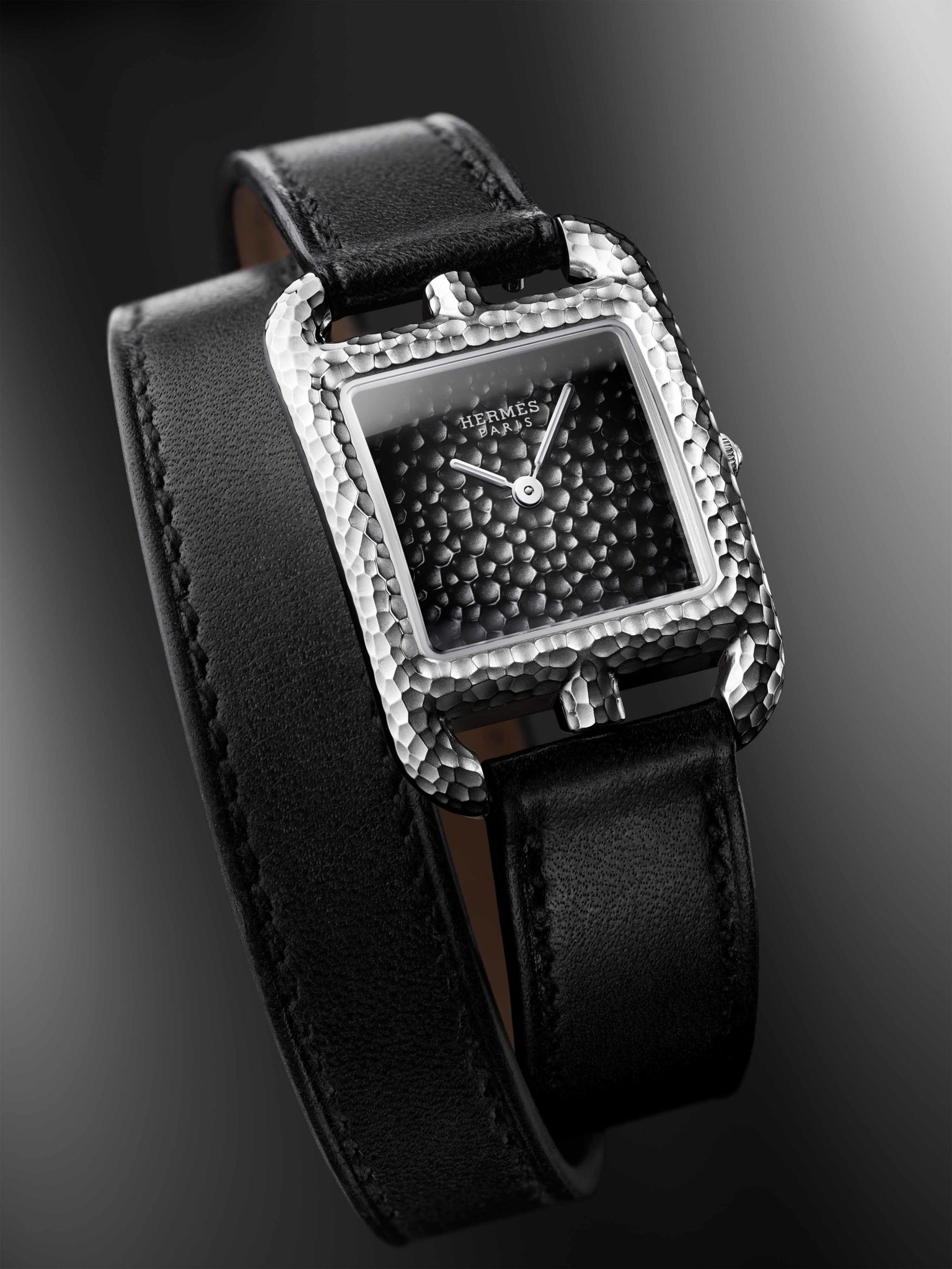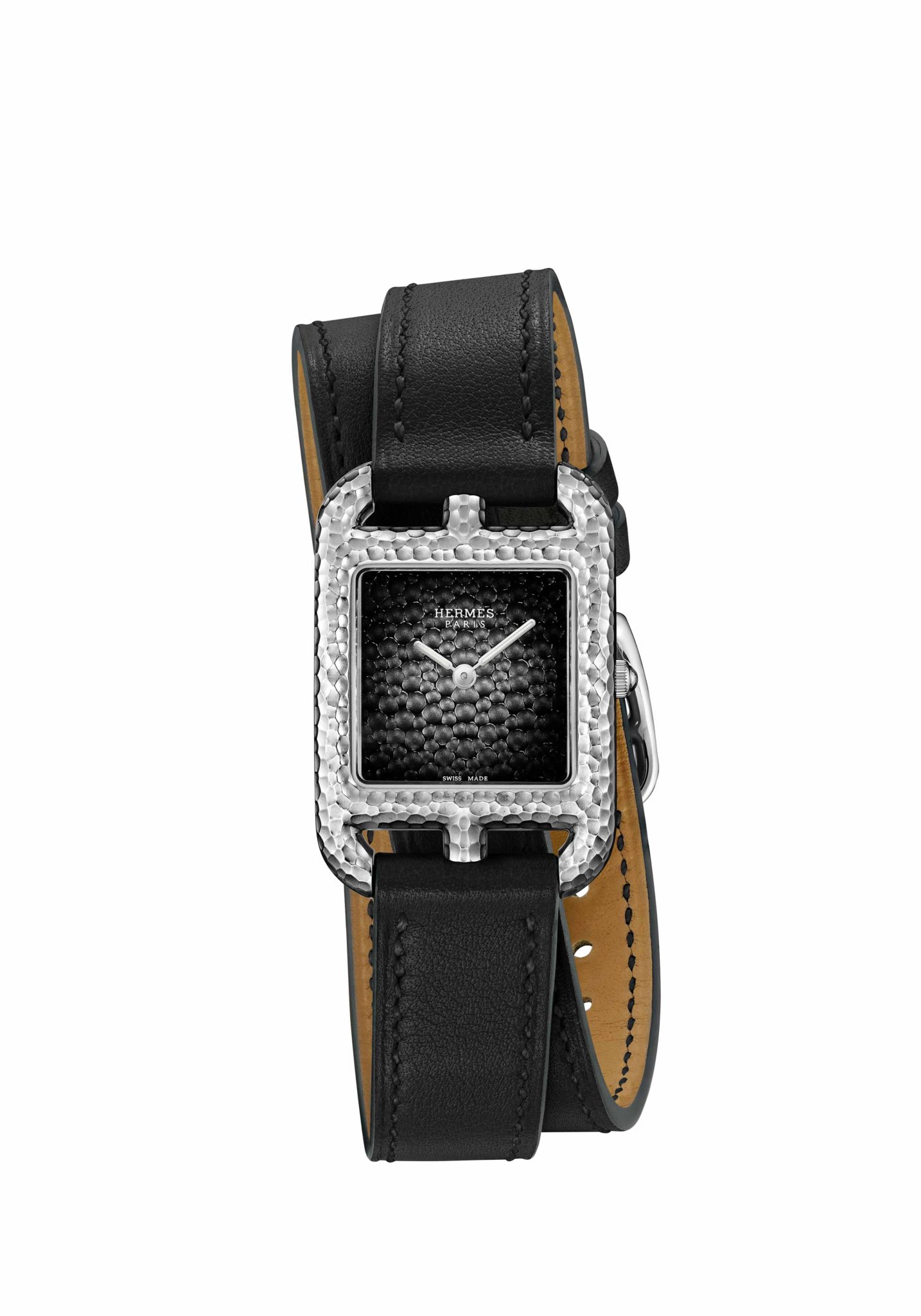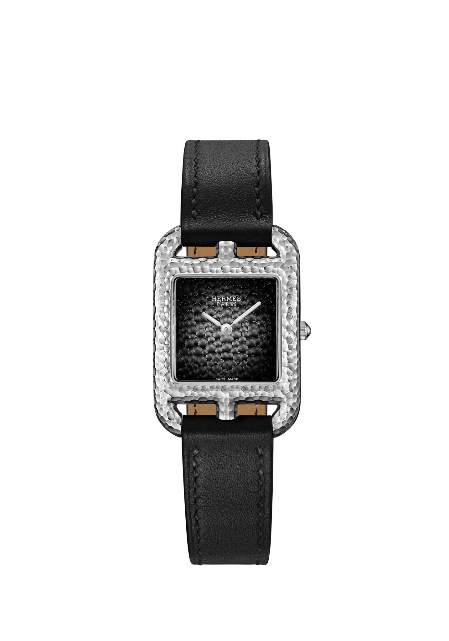 Today, this ever-evolving classic lends its finely balanced shapes to the excellent jeweller’s skill known as hammering. This complex and sophisticated technique enhances the steel case with a unique patina-type effect. The likewise hammered dial is coated with a thin layer of translucent lacquer, in graded shades ranging from anthracite to black. The raw yet crafted material, with all its depth and roughness, results in an object with an entirely unexpected look. Finally, the Cape Cod Martelée combines its offbeat temperament with an understated black calf strap in single or double tour versions.