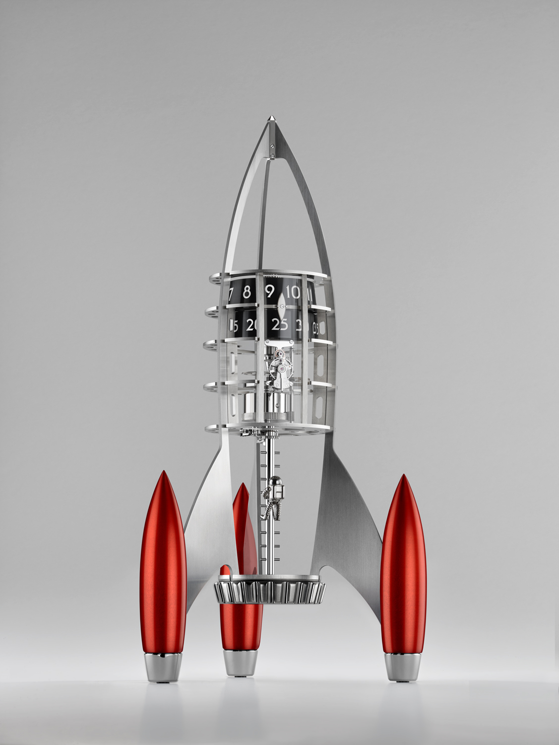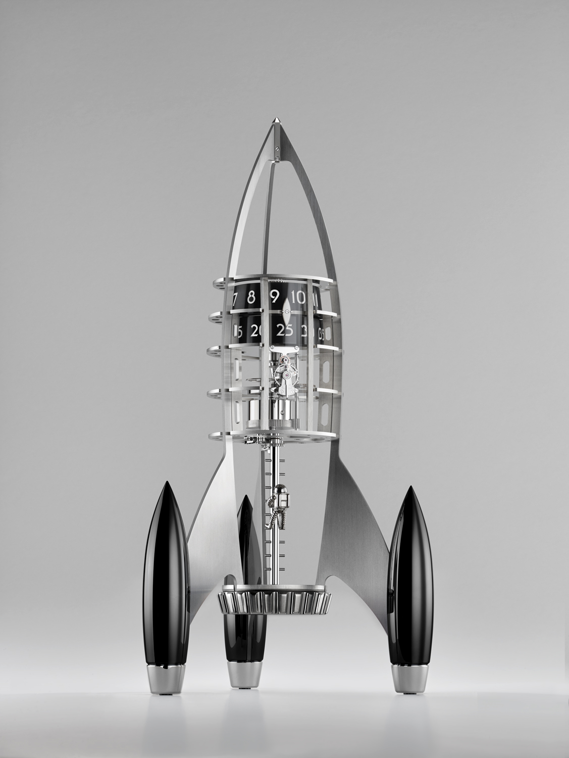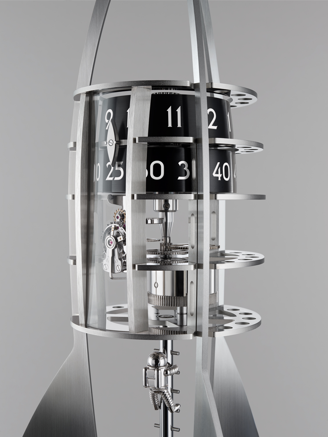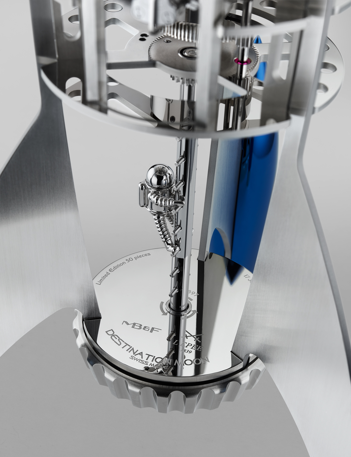 Conceived by MB&F and built by L’Epée 1839, Switzerland’s premier clock maker, Destination Moon is the quintessential torpedo-shaped rocket of childhood dreams. But look more closely and you will see that its minimalistic form is evocative rather than definitive.