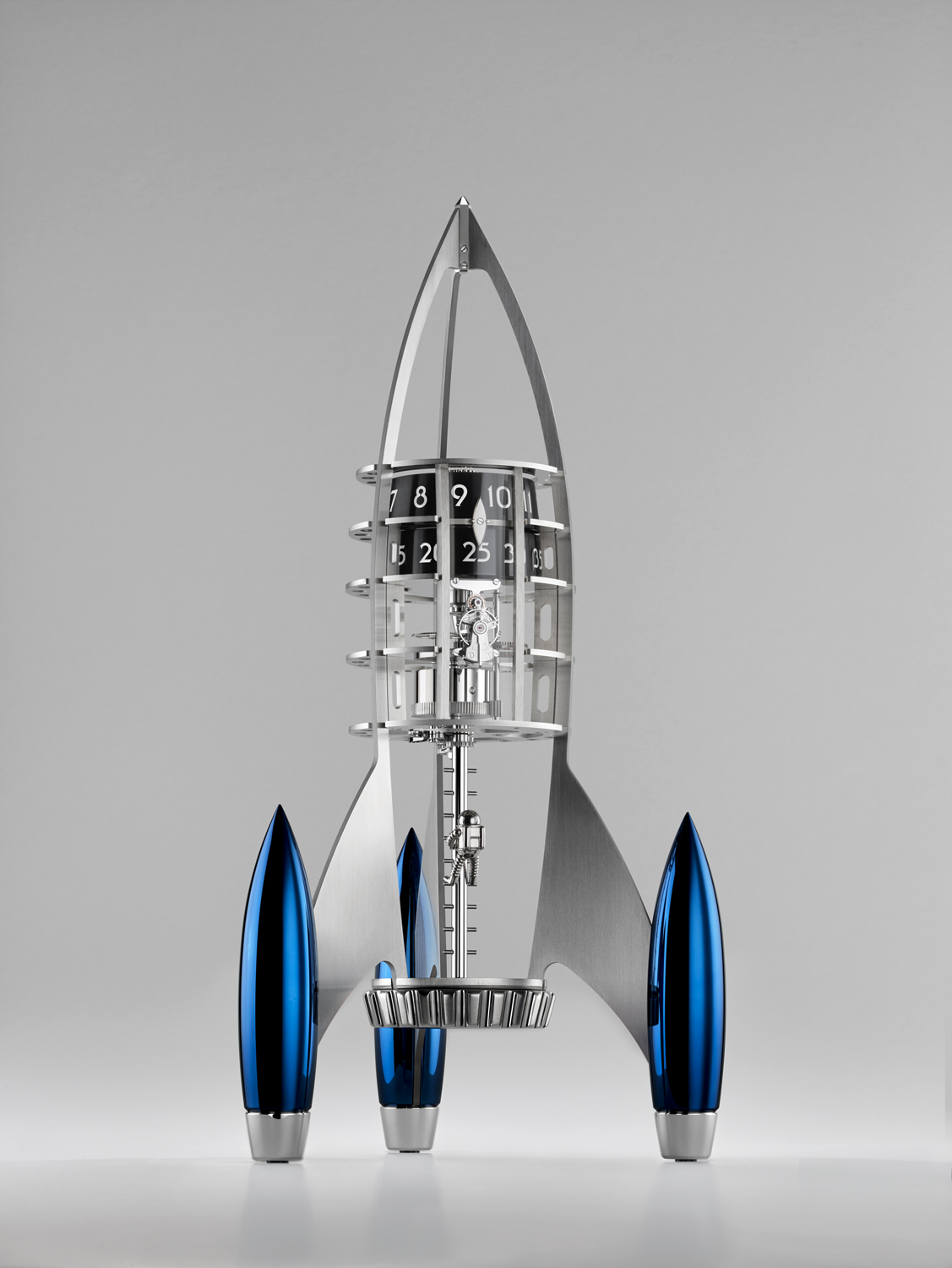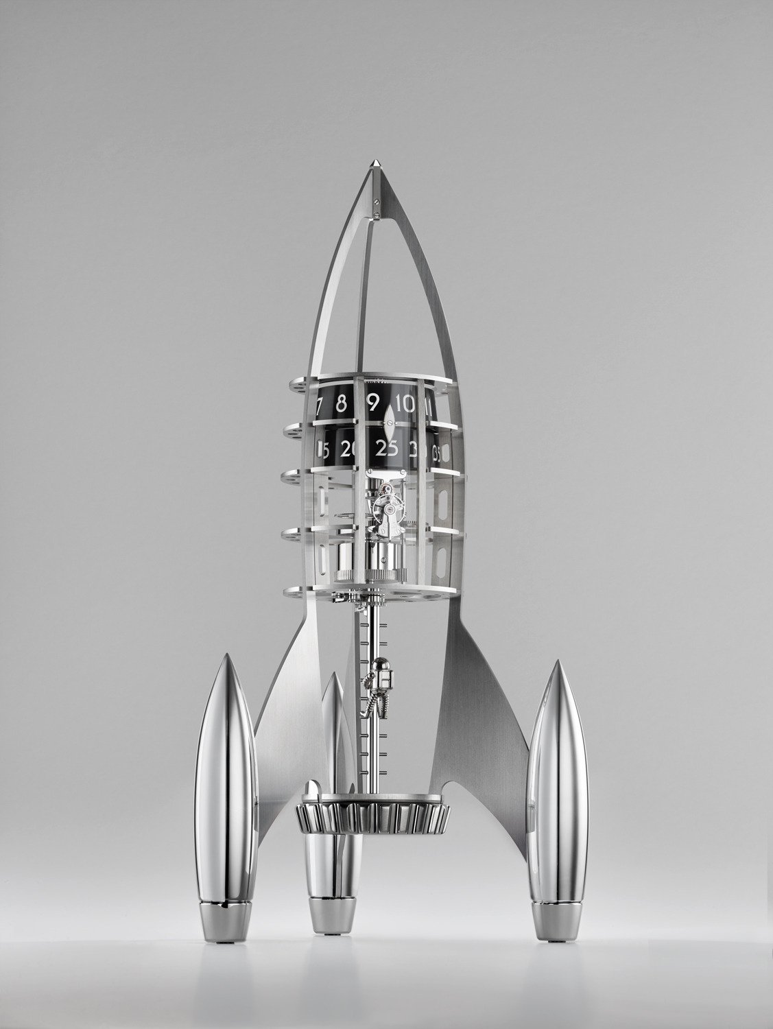 Perhaps the crowning jewel of Destination Moon – its apogee if you will – is the small figure on the ladder at its base: Neil. Constructed of solid sterling silver with a stainless steel helmet and wearing a 1960s-style spacesuit, Neil brings a playful human element to the engineering of the Meccano-style openwork of the spaceship and its clockwork. Neil magnetically attaches anywhere along Destination Moon’s boarding ladder. Whether he is embarking to take off for an adventure in space, or disembarking for an adventure on the moon’s surface is up to the individual viewer’s imagination.