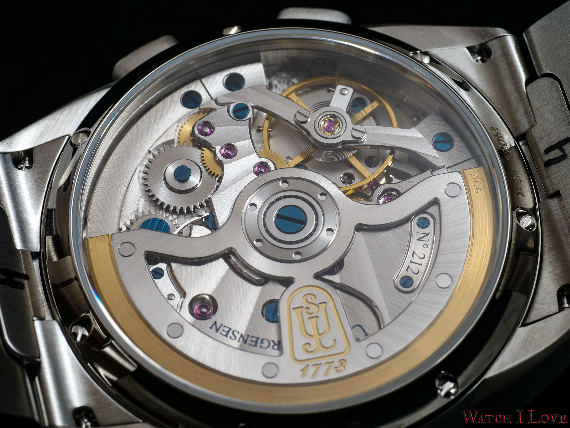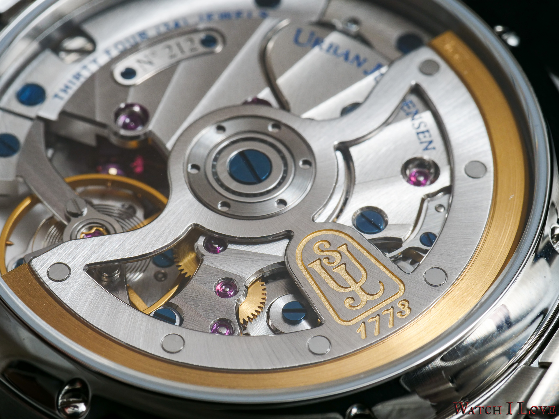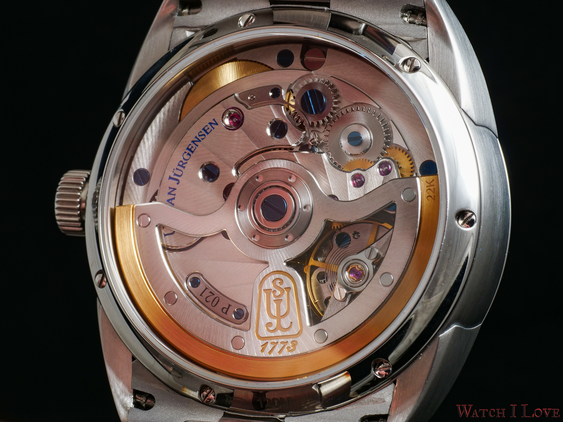 • Open worked rotor with gold inlayed UJ Shield and 22 ct. solid gold oscillating weight.