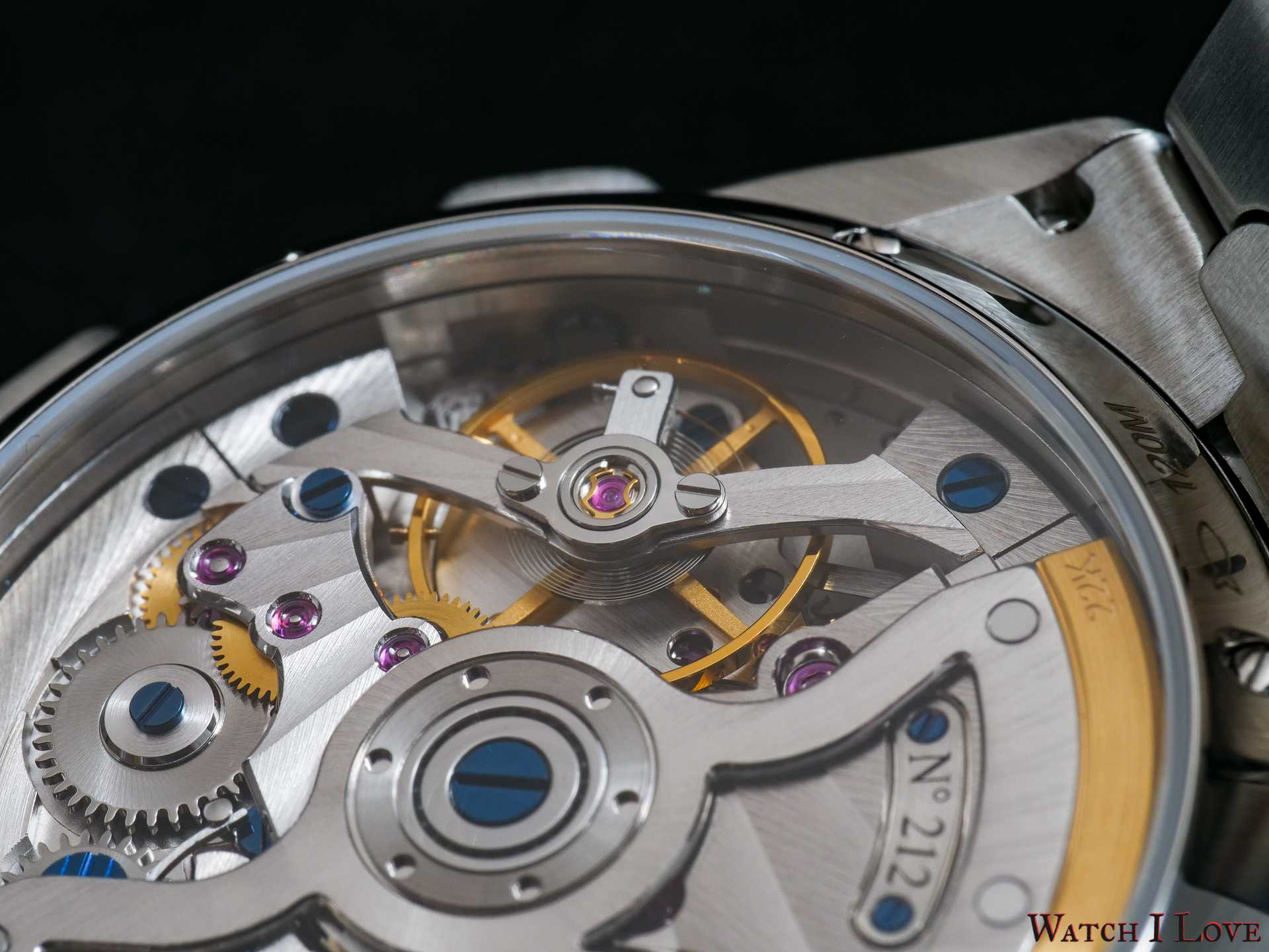 Some added elements serve as decoration and information: engraved and lacquered text, metal plate with the piece’s number, blued screws, bevelled and polished bridge edges, polished sinks and so on. The screw-fixed case-back bears the 120m water resistance engraving.