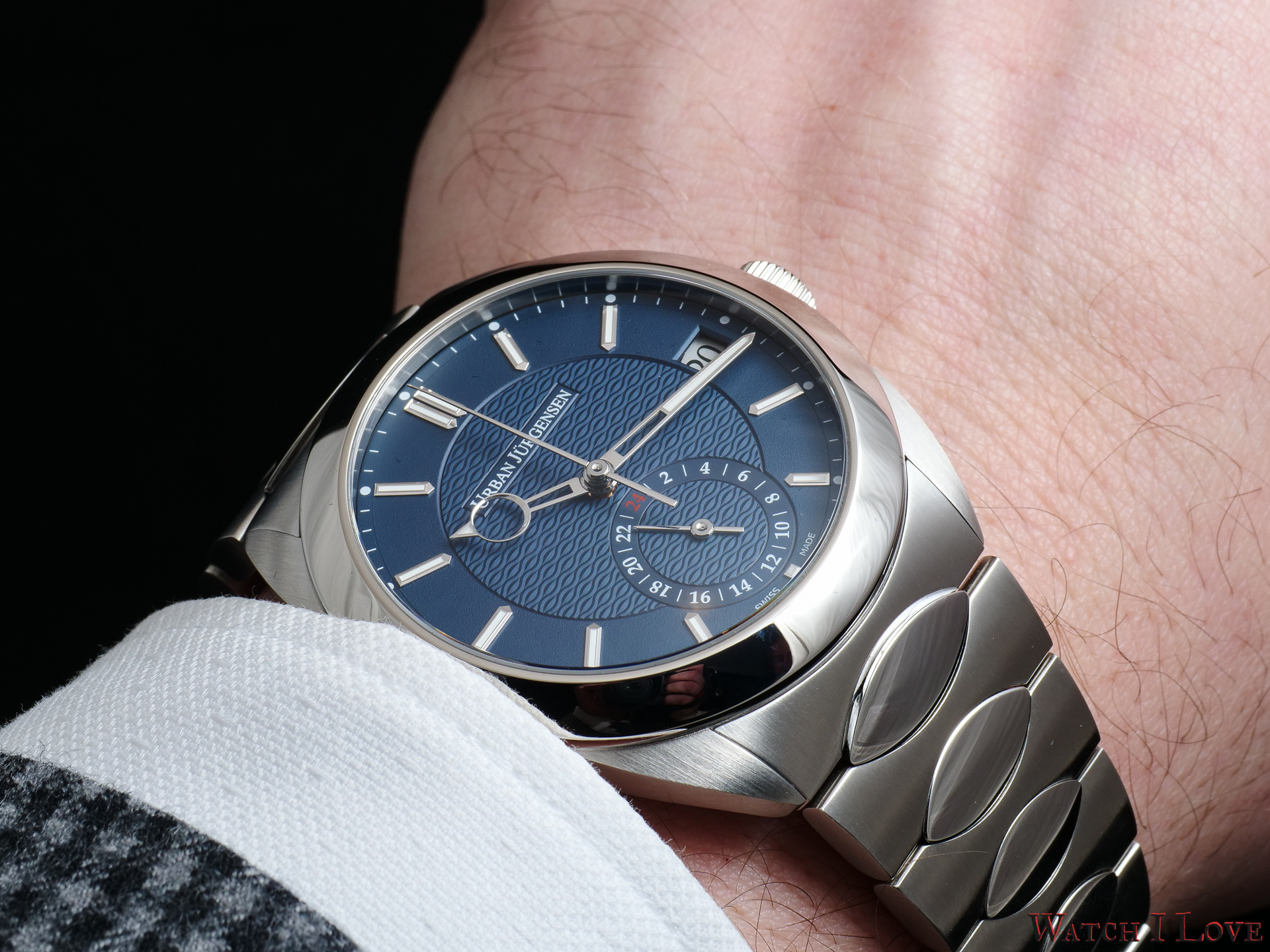 Urban Jürgensen One is the first sports watch of the brand. The three-hands watch was launched with three dial colour variations: Soft White, Charcoal Grey and Urban Blue. There is available a GMT model but only in Urban Blue scheme. A first impression can be made viewing the wrist-roll video below with the blue GMT and the three-hands white dial.