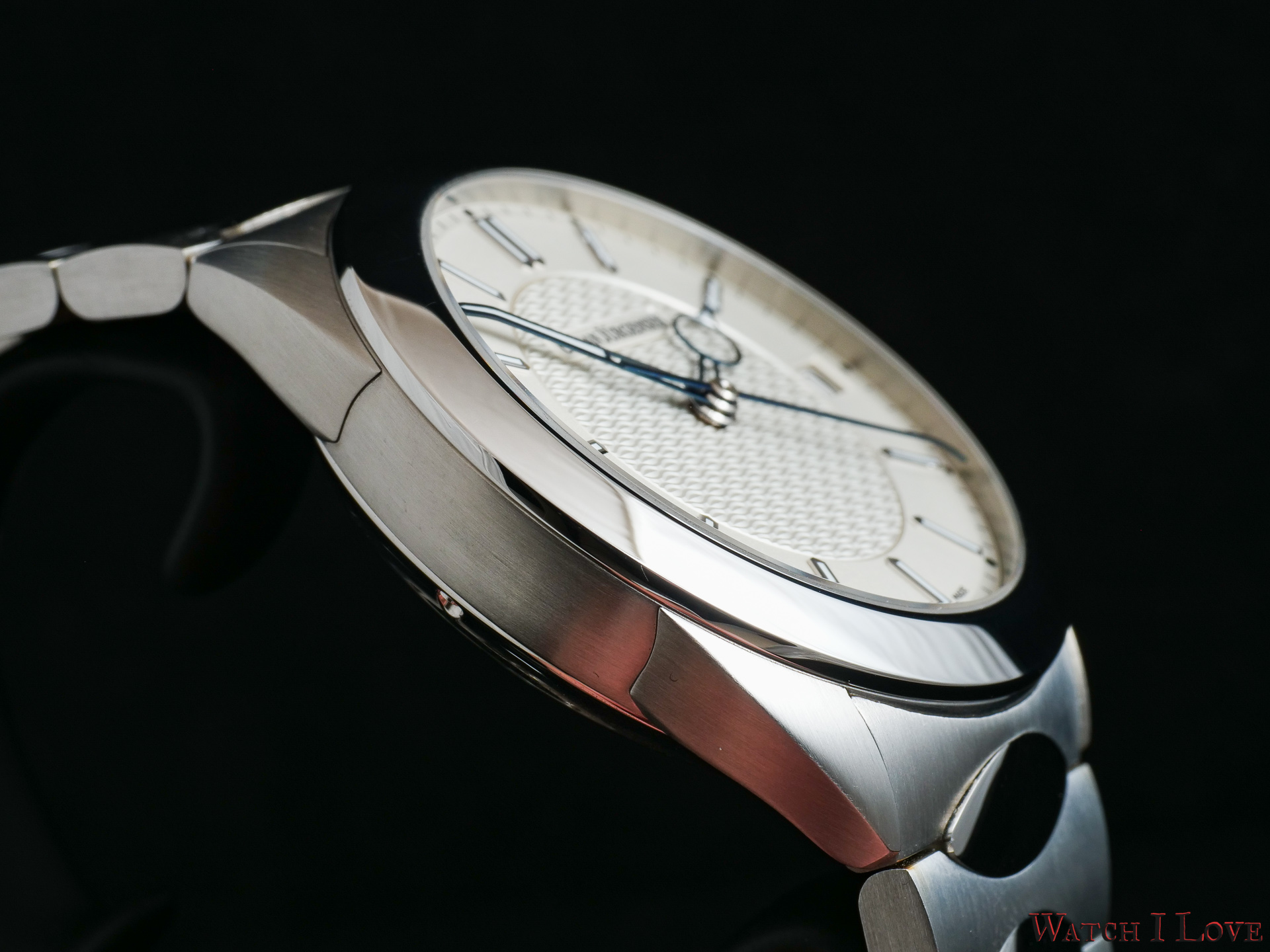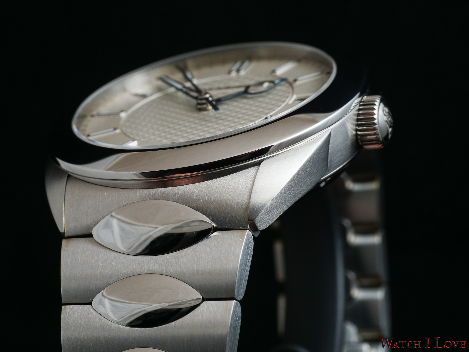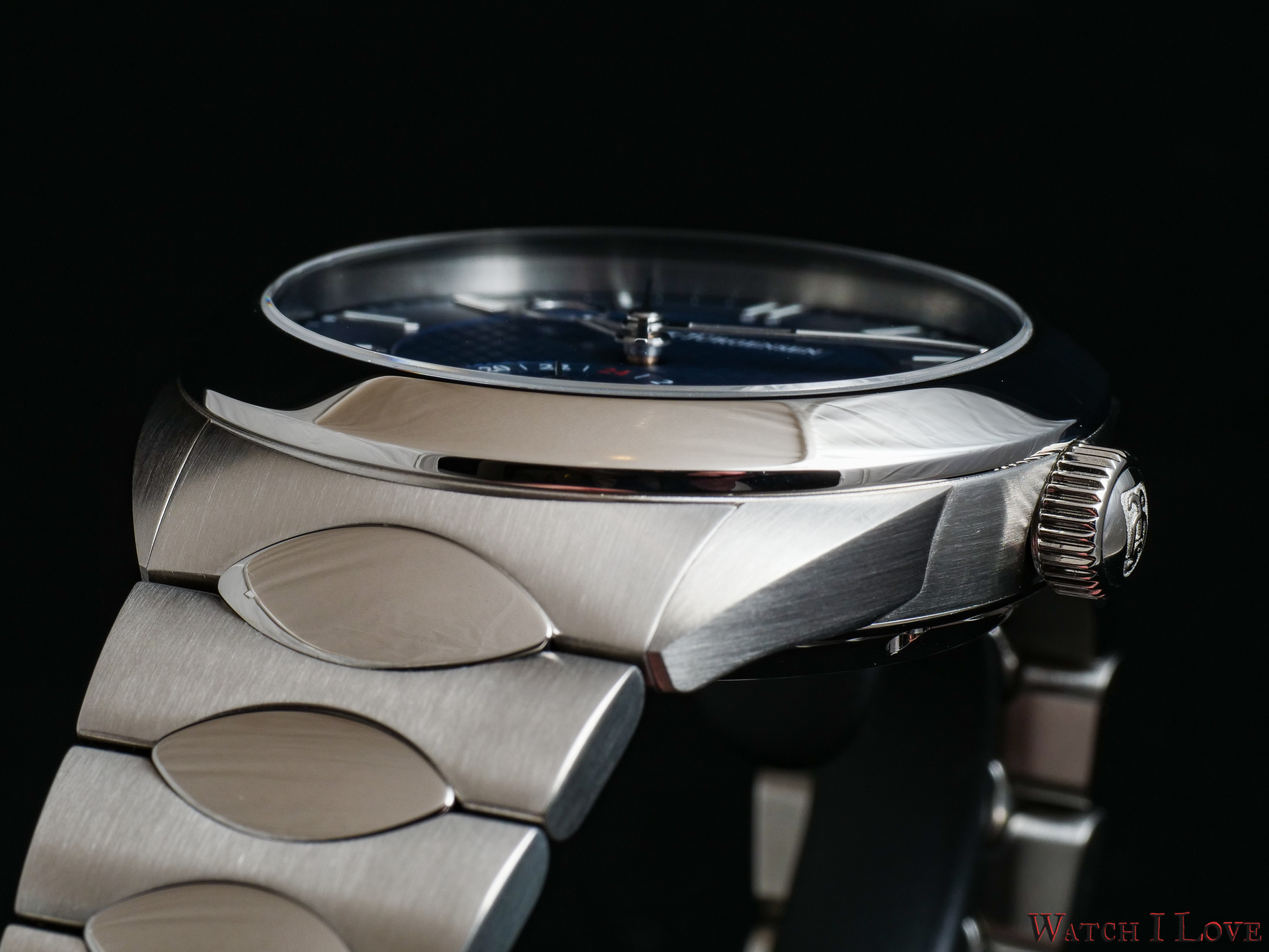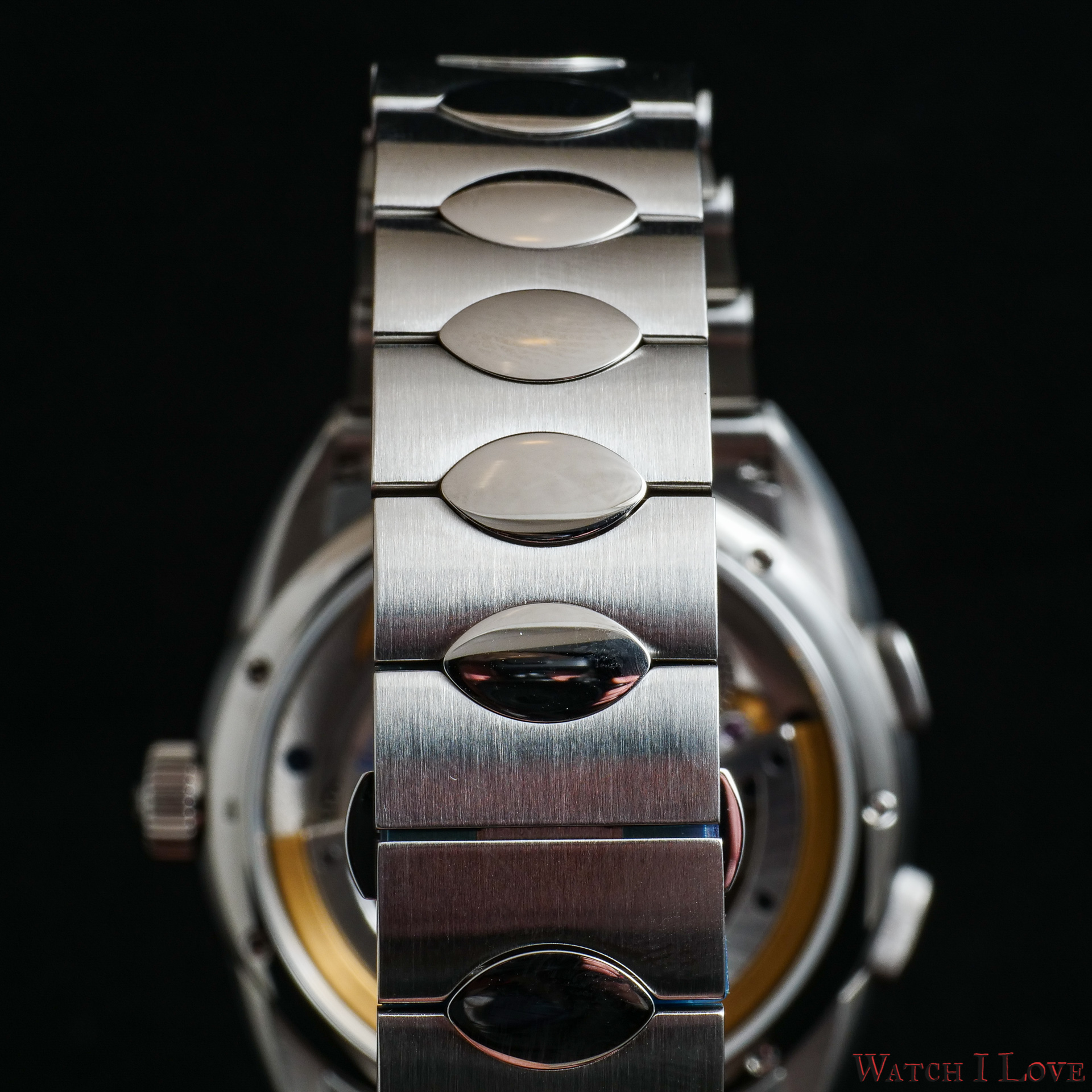 The interhorn space accommodates the integrated bracelet. Made from the same medical alloy, the bracelet’s brushed links and oval polished elements are intertwined nicely. The bracelet is very good looking. It comes with a butterfly safety folding clasp.