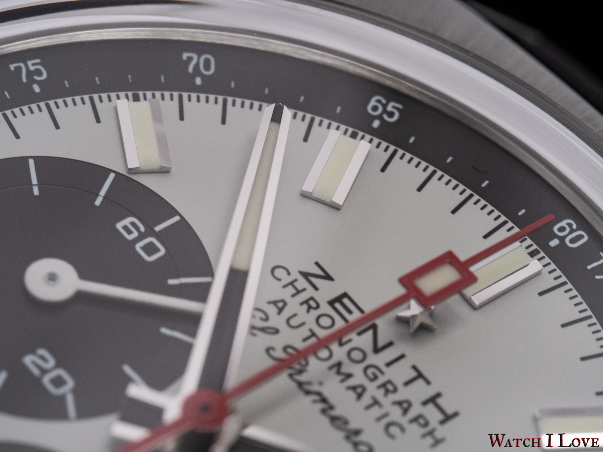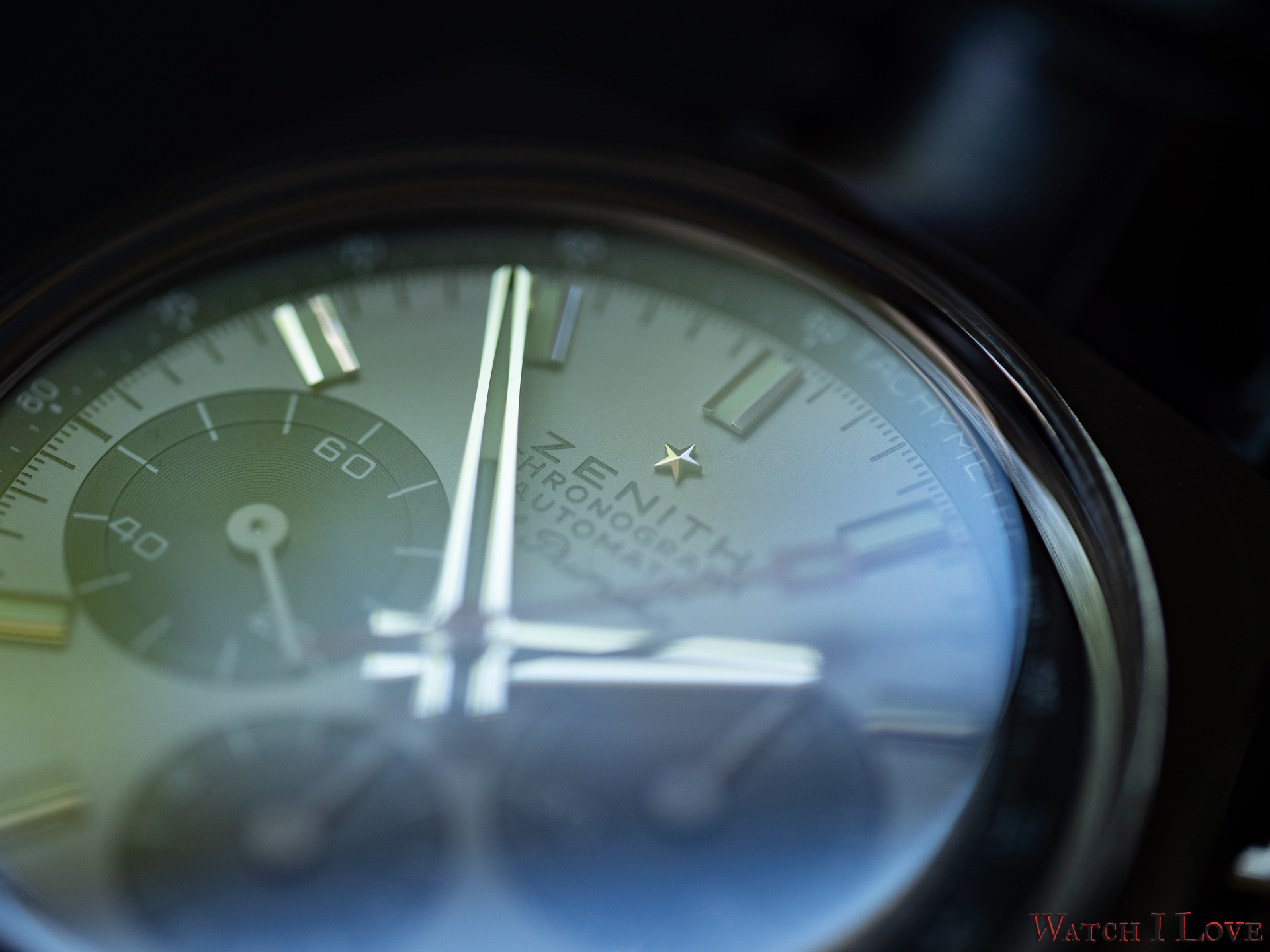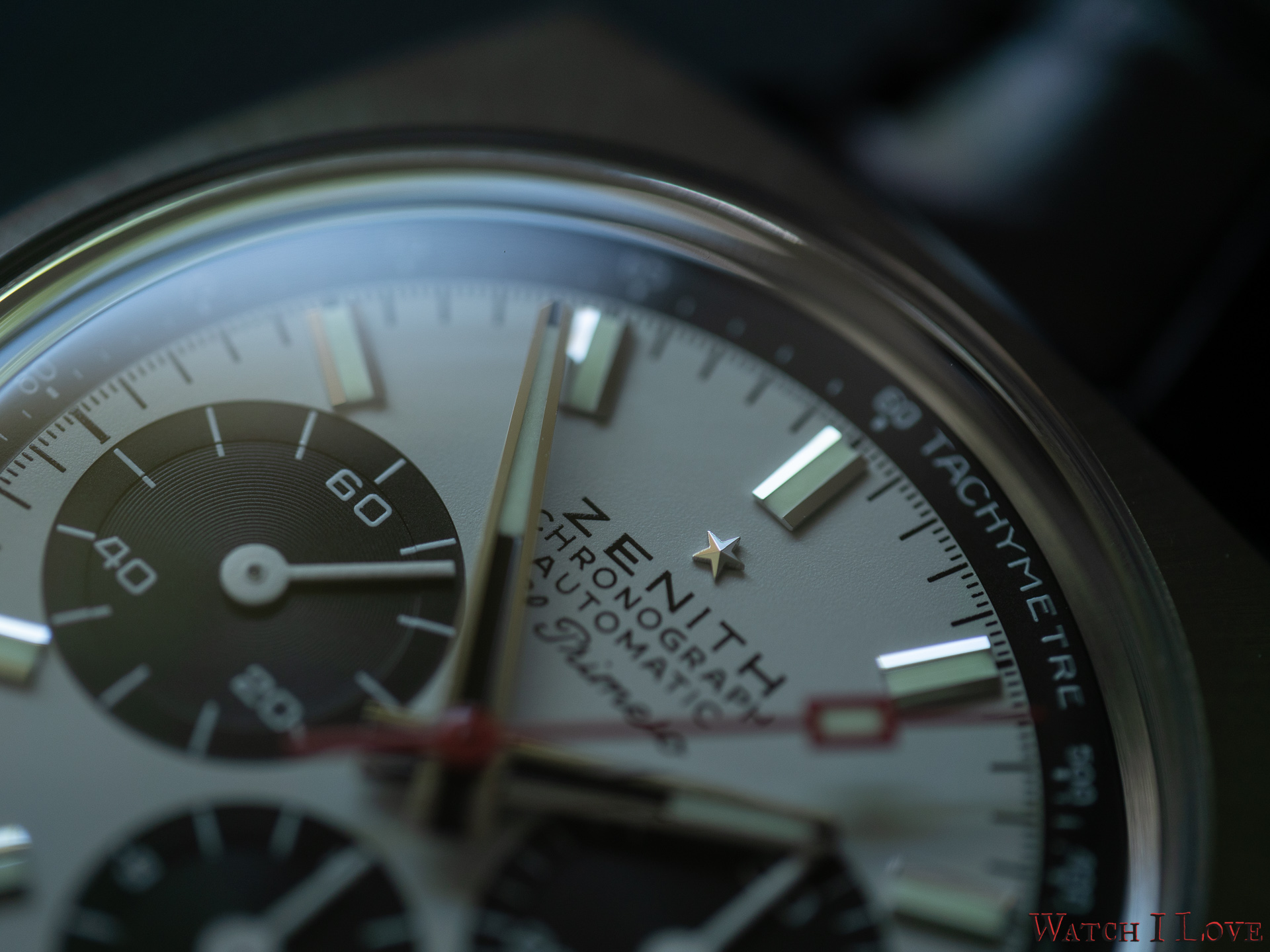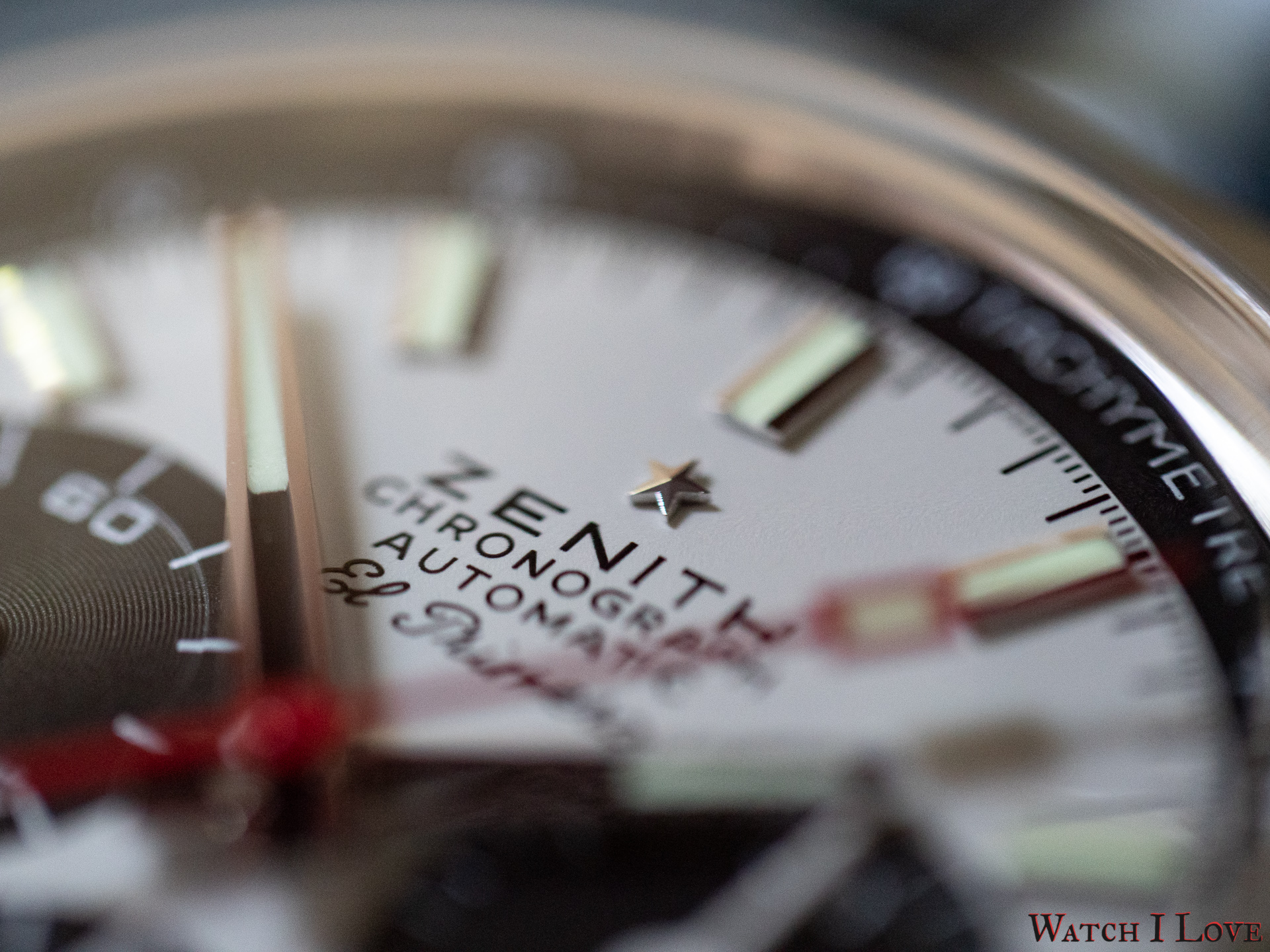 On of the cutest detail of the dial, besides the red varnished chrono hand is the Zenith star. Together with the hand-written style El Primero, it governs the top of the dial.