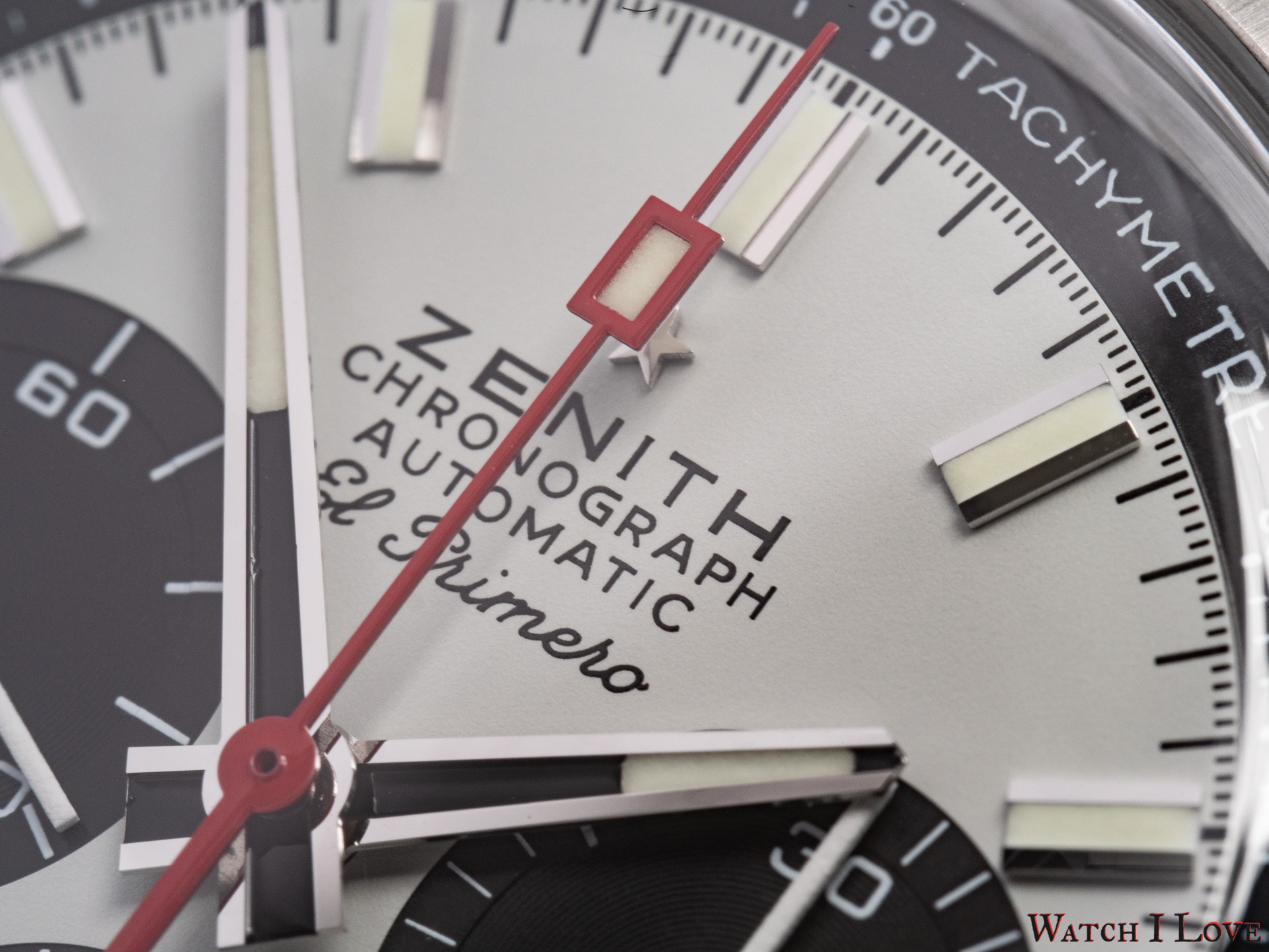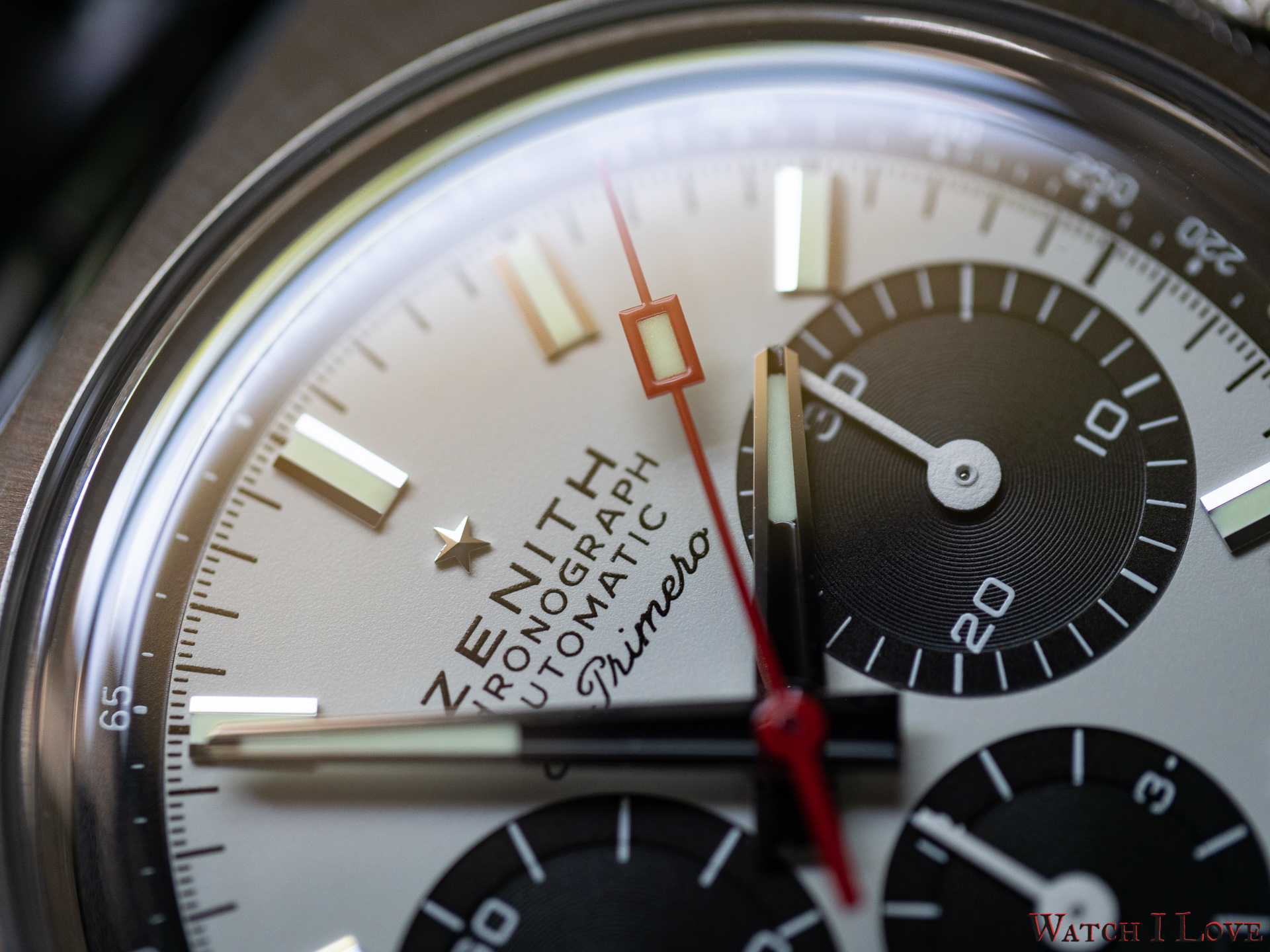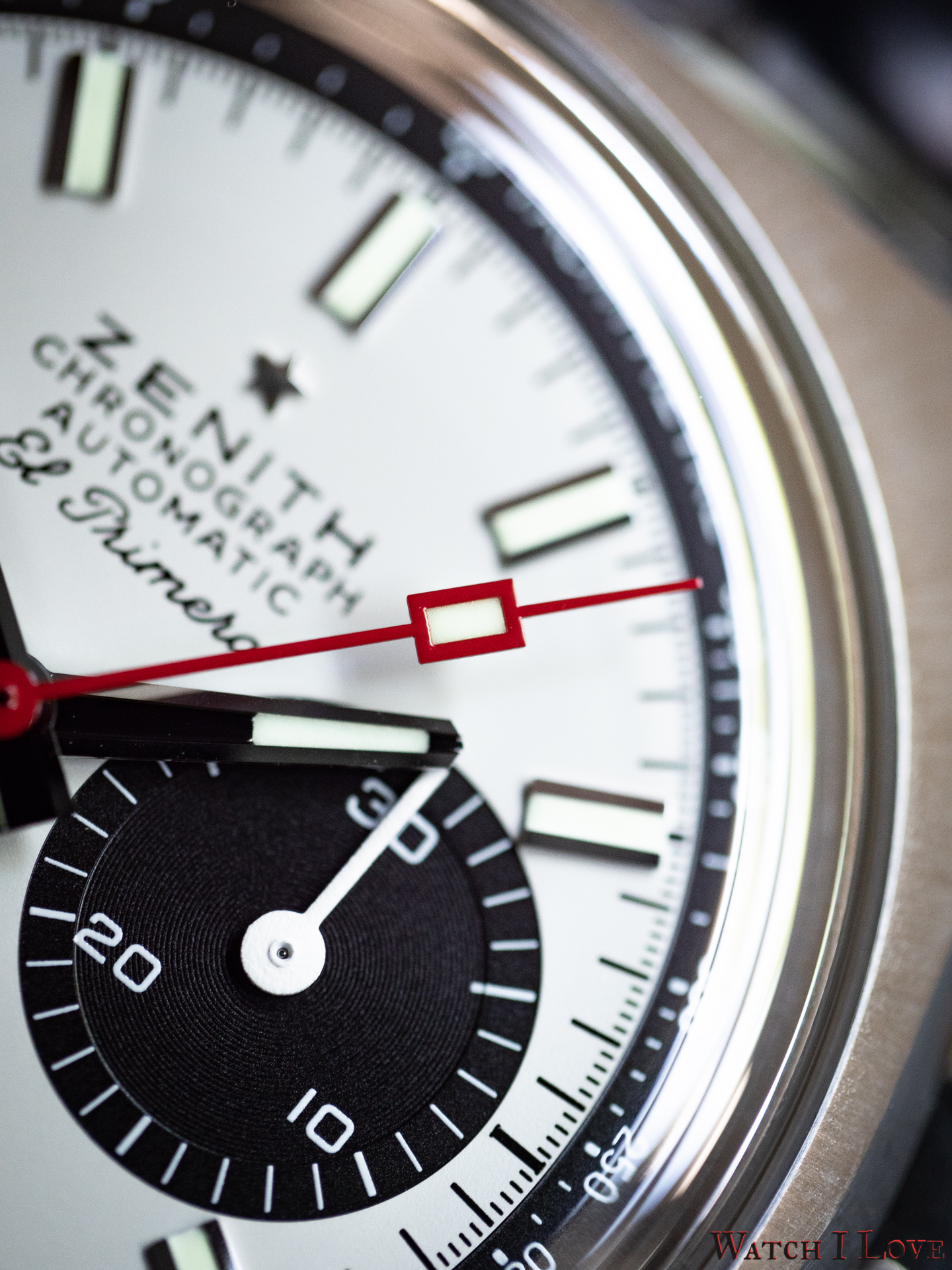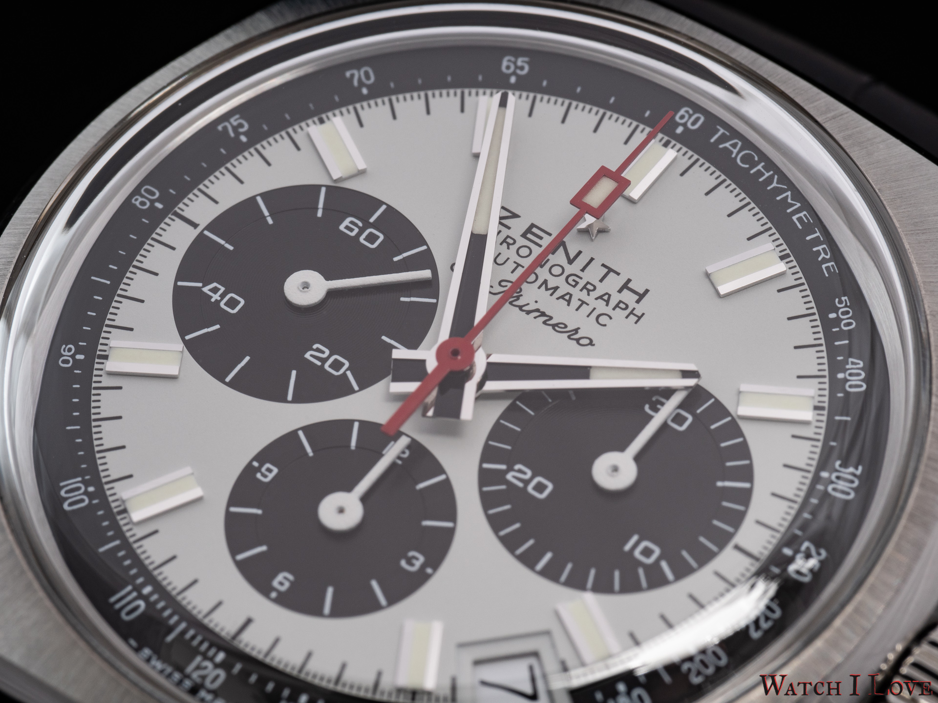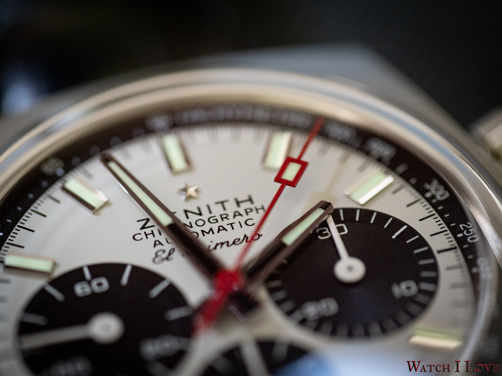 On of the cutest detail of the dial, besides the red varnished chrono hand is the Zenith star. Together with the hand-written style El Primero, it governs the top of the dial.