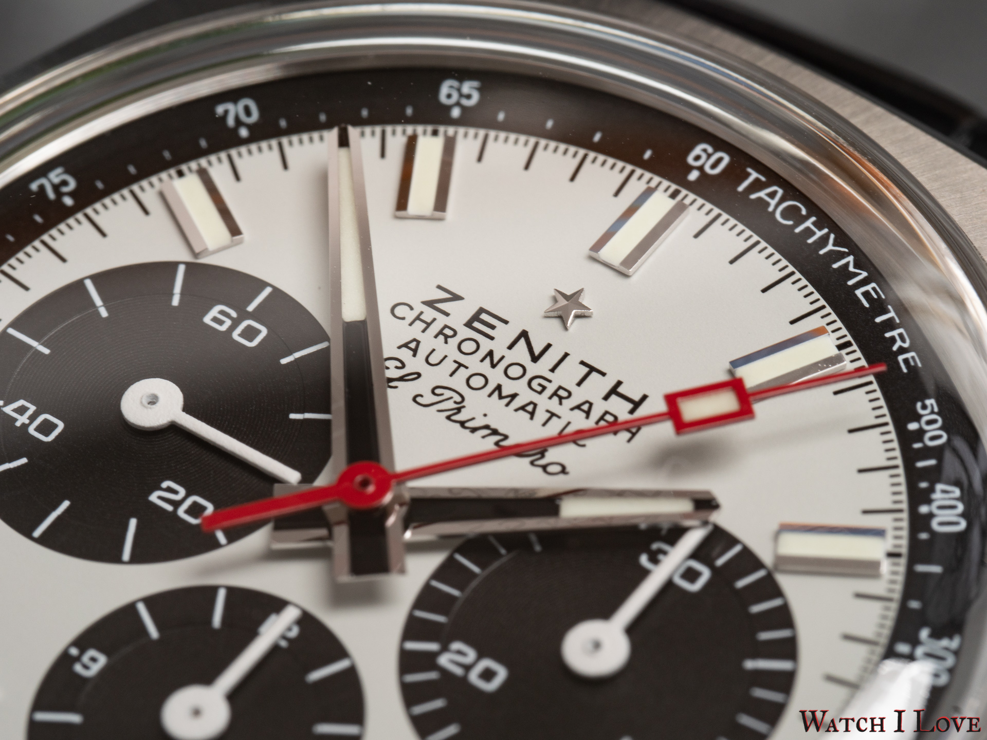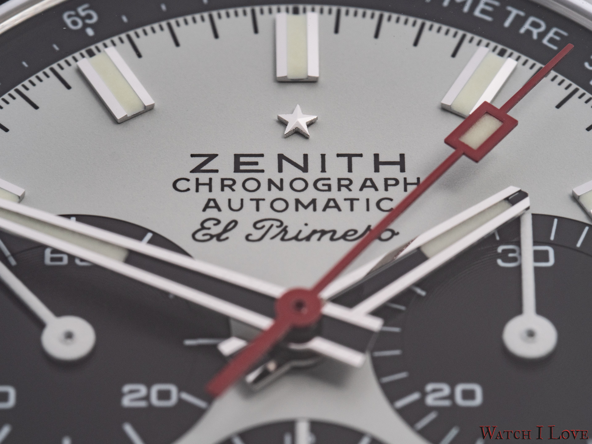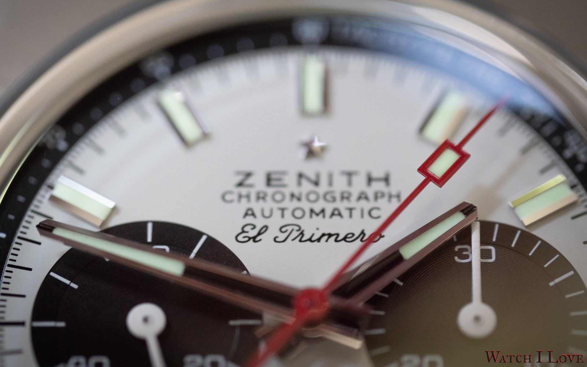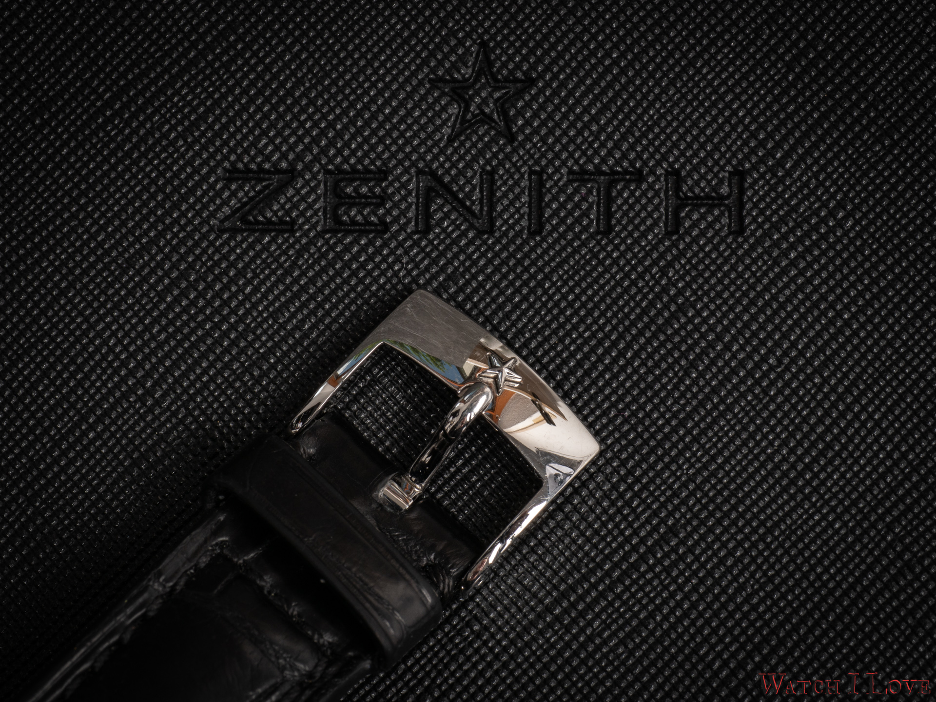 On of the cutest detail of the dial, besides the red varnished chrono hand is the Zenith star. Together with the hand-written style El Primero, it governs the top of the dial.