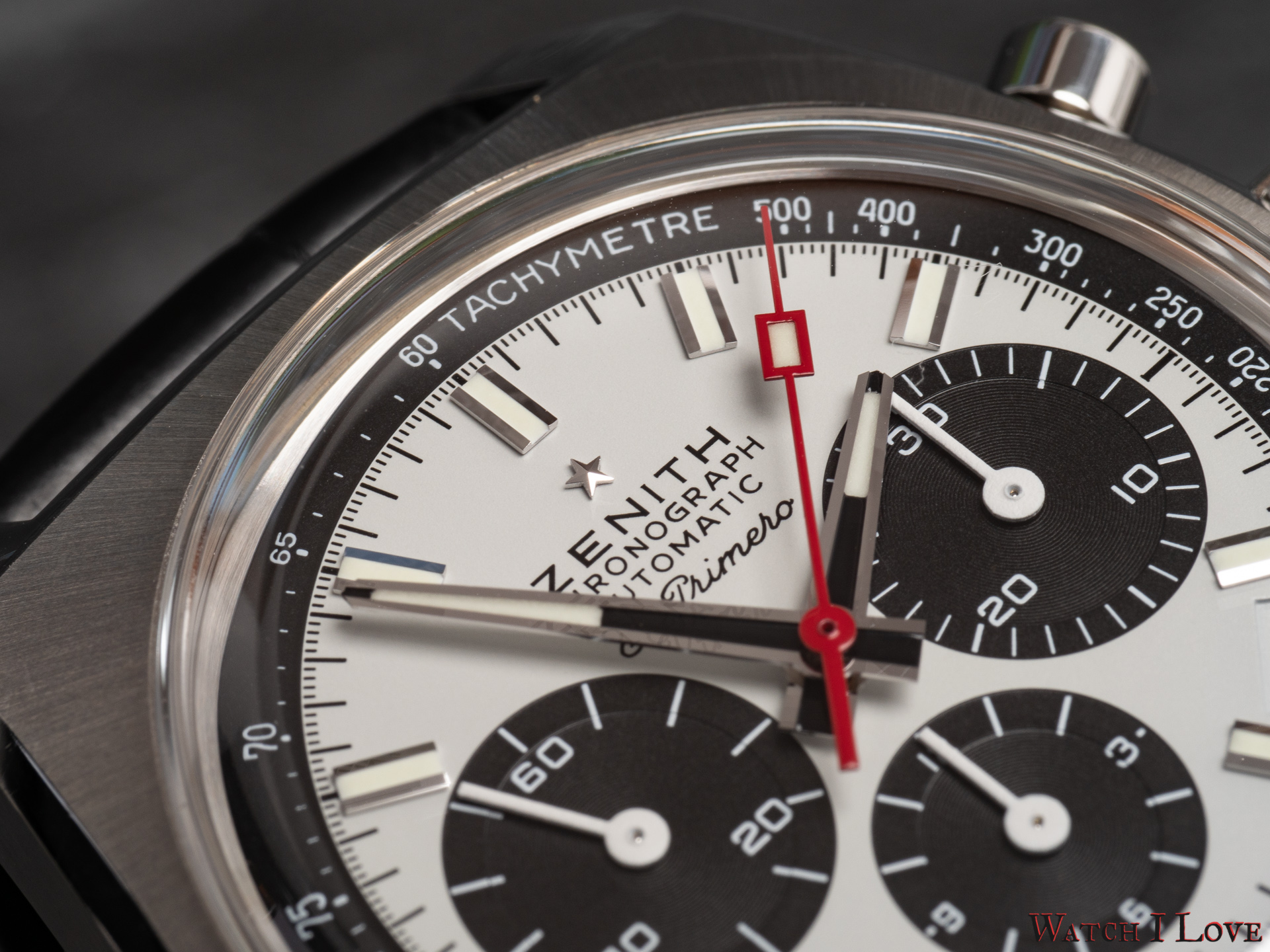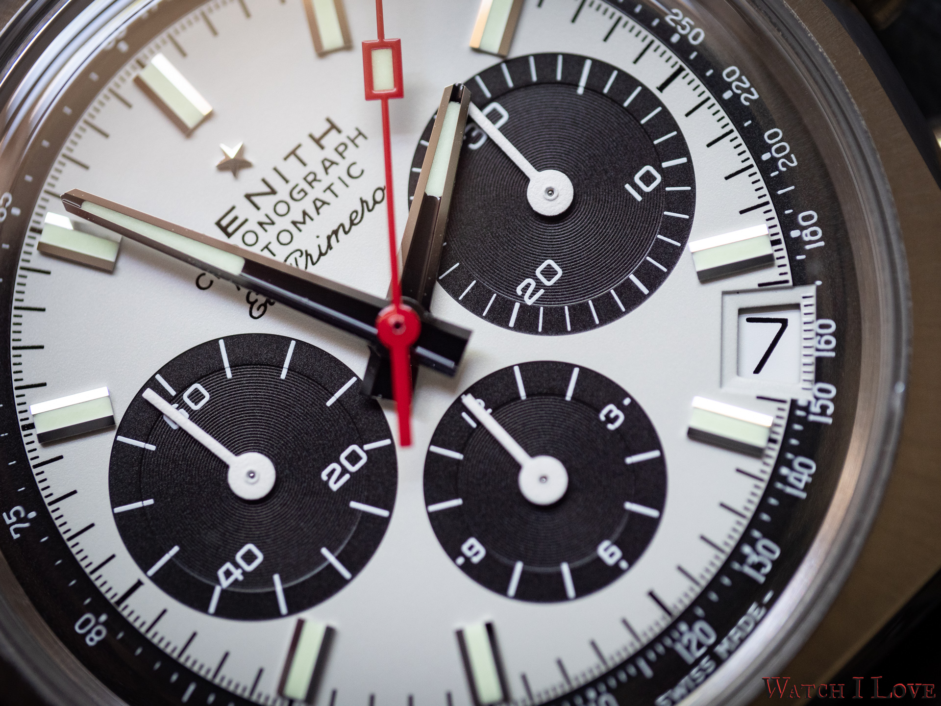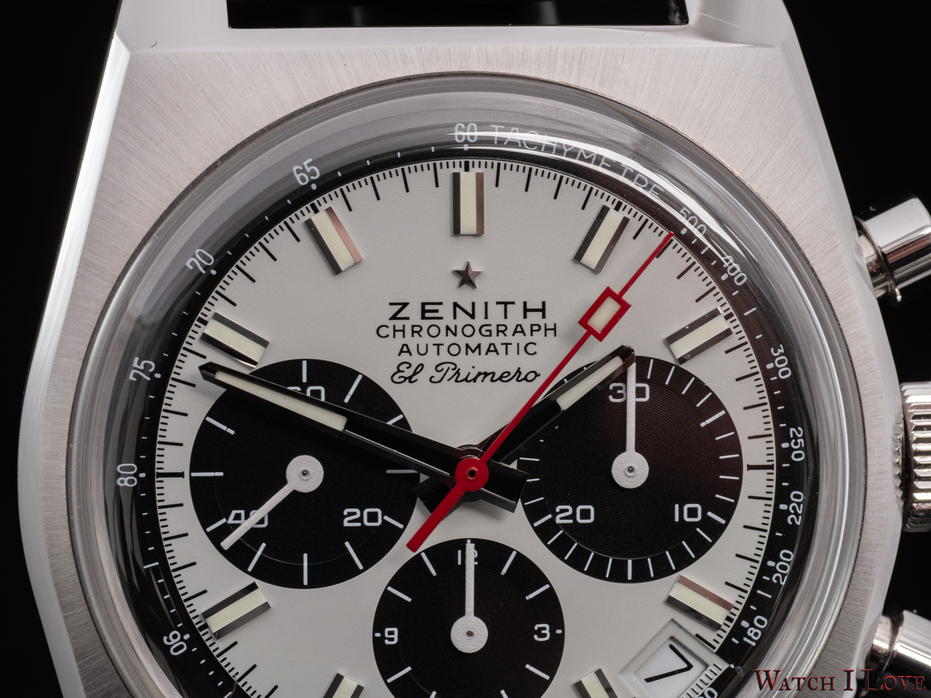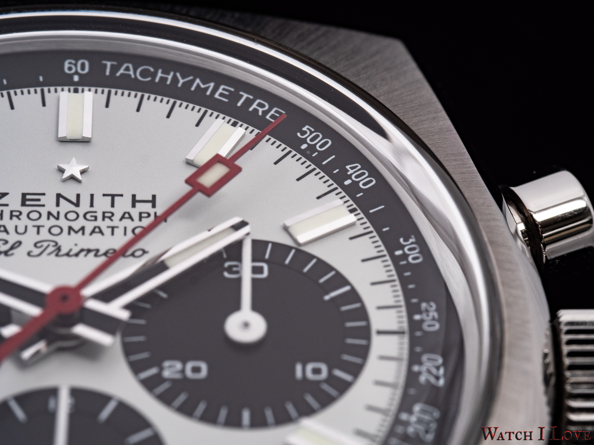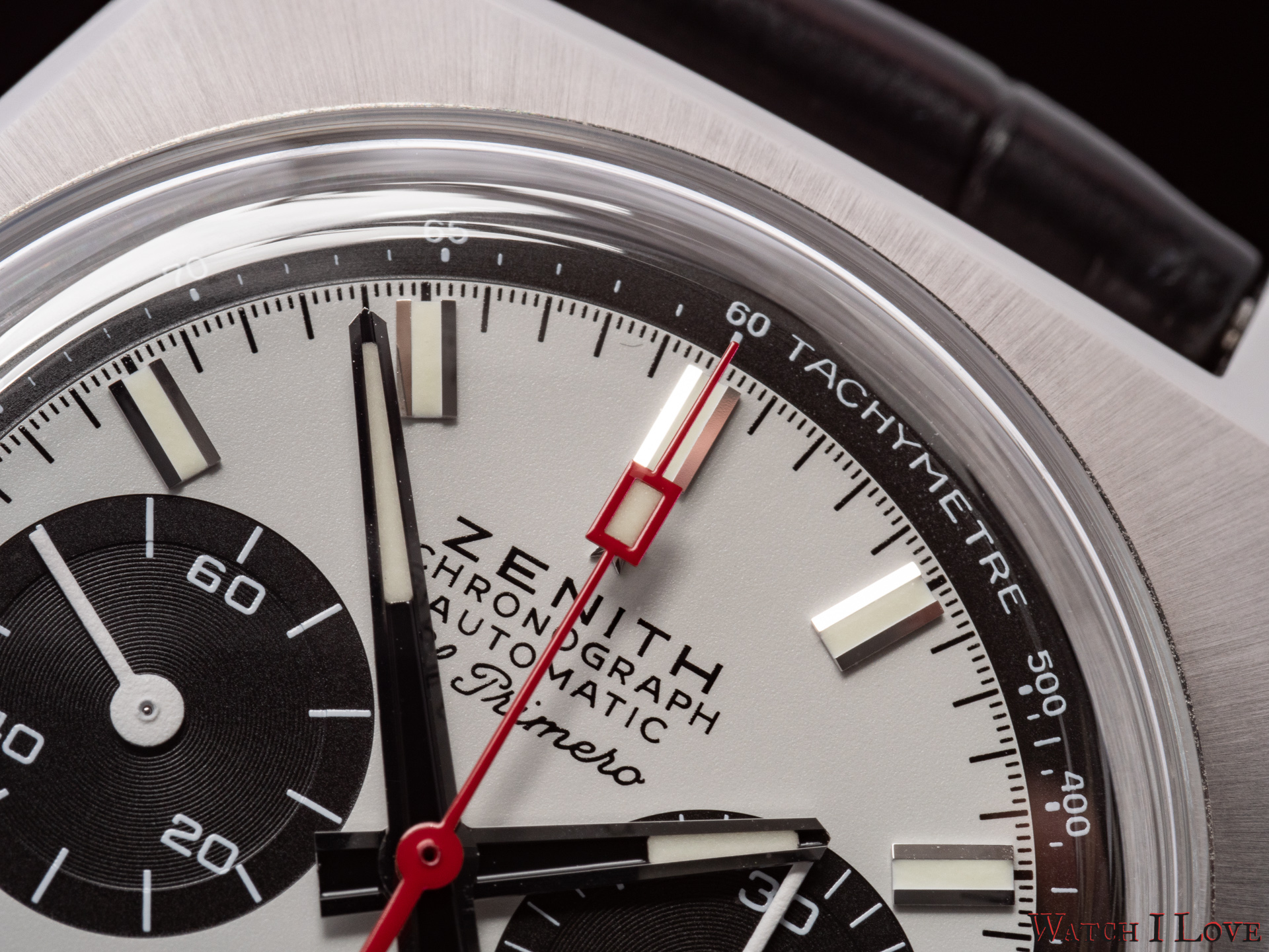 On of the cutest detail of the dial, besides the red varnished chrono hand is the Zenith star. Together with the hand-written style El Primero, it governs the top of the dial.