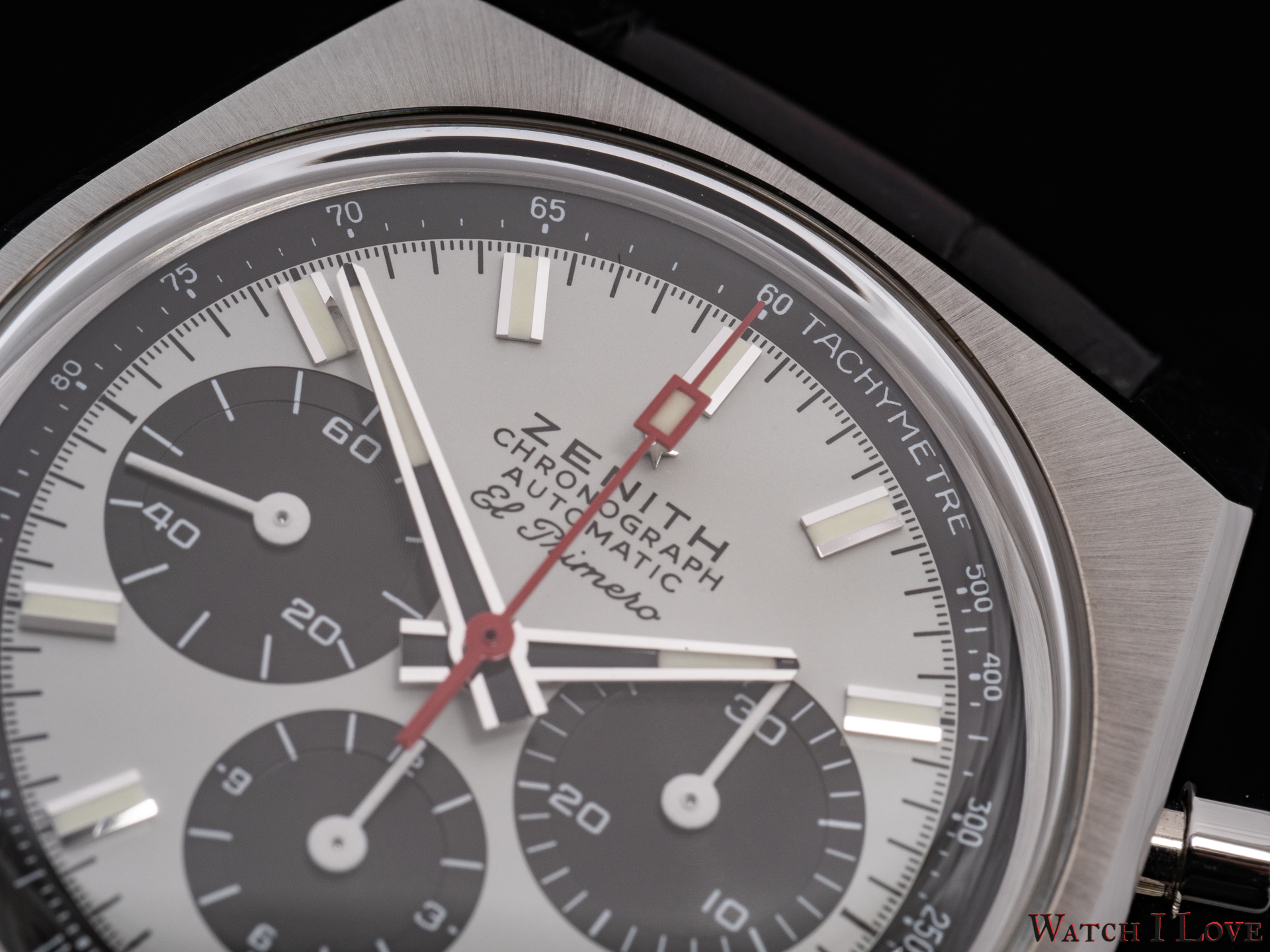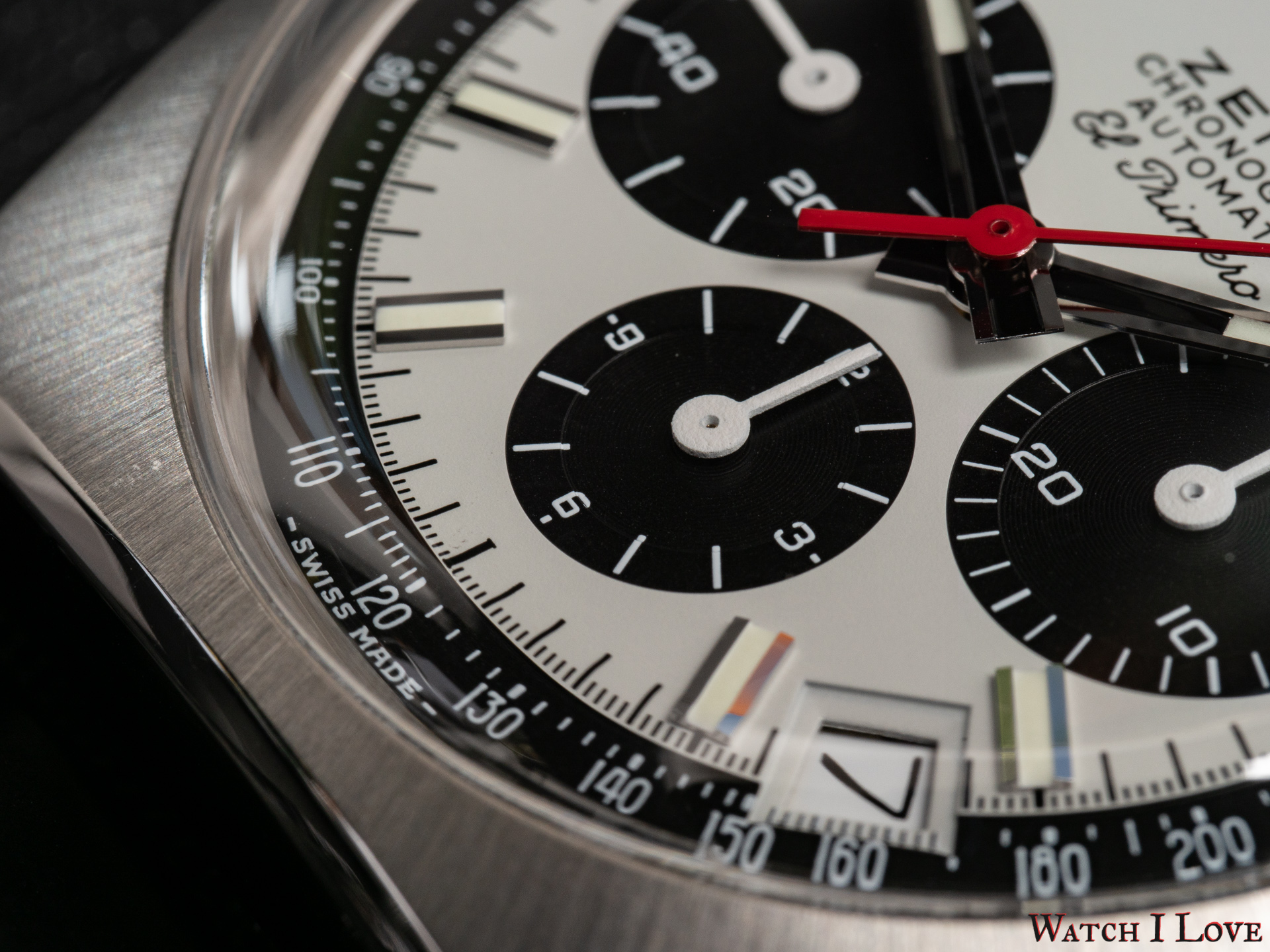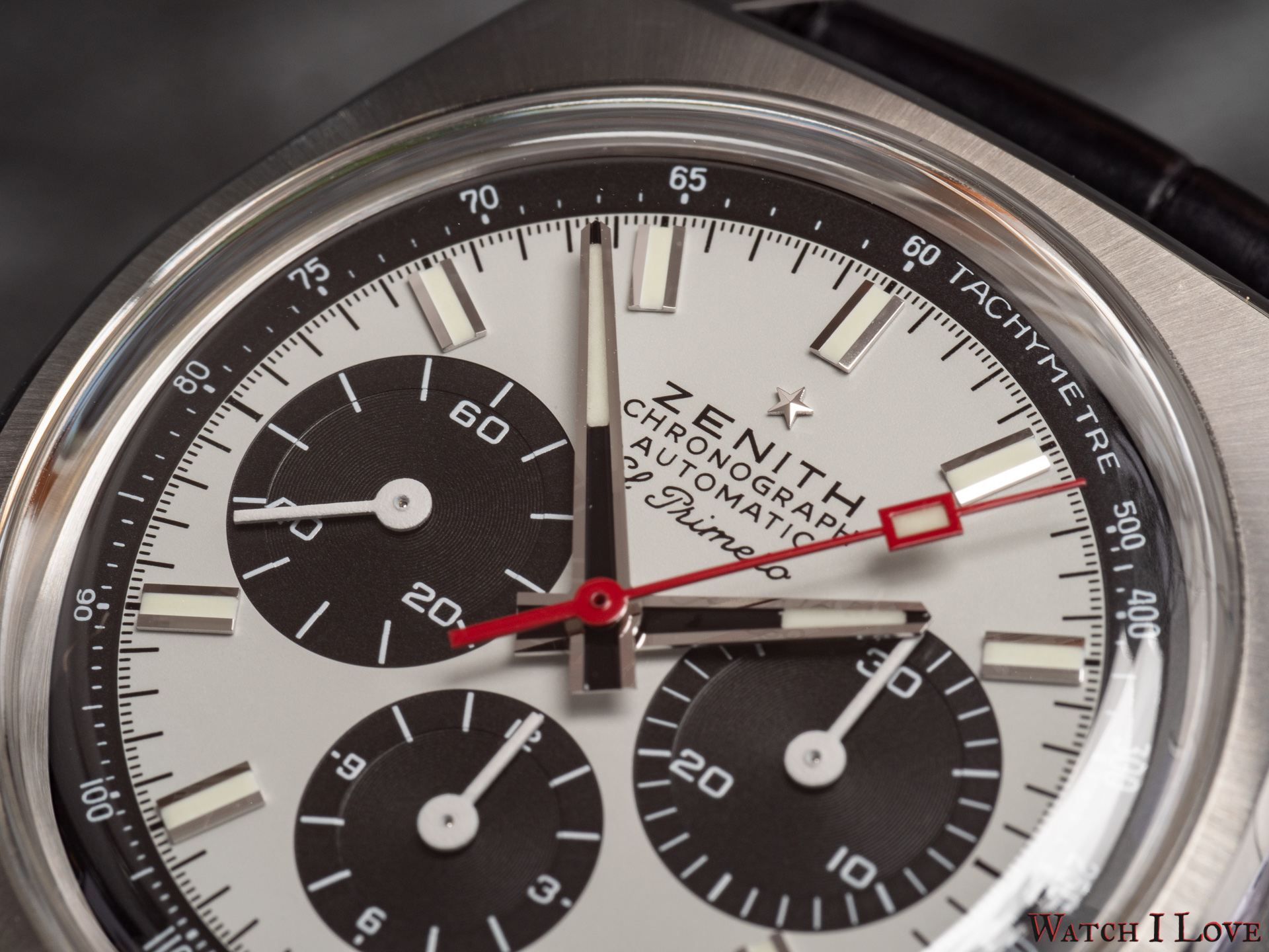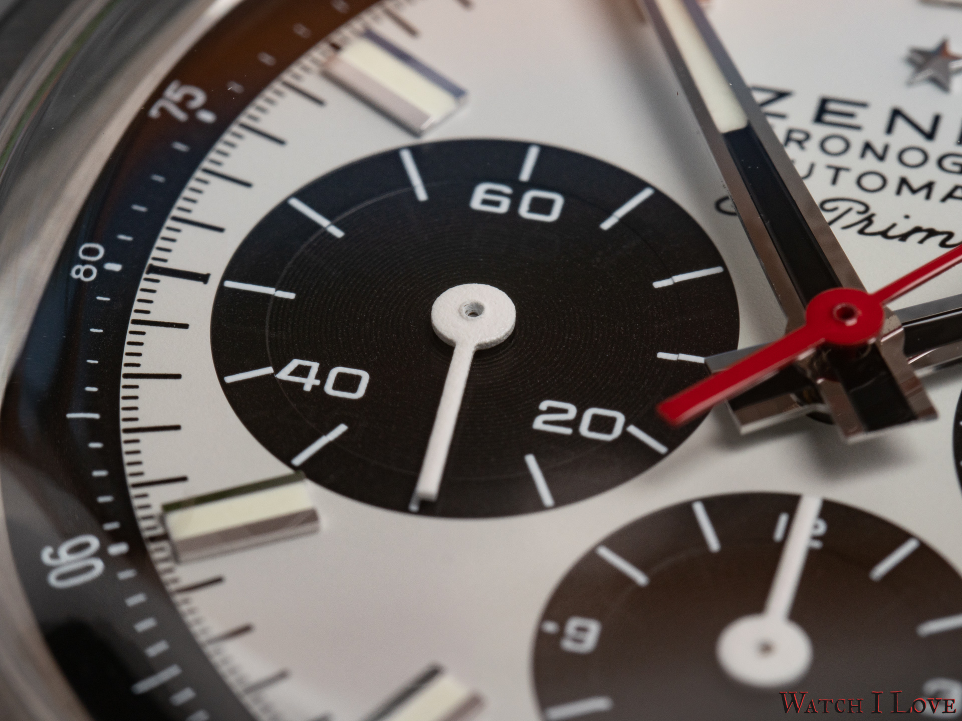 On of the cutest detail of the dial, besides the red varnished chrono hand is the Zenith star. Together with the hand-written style El Primero, it governs the top of the dial.