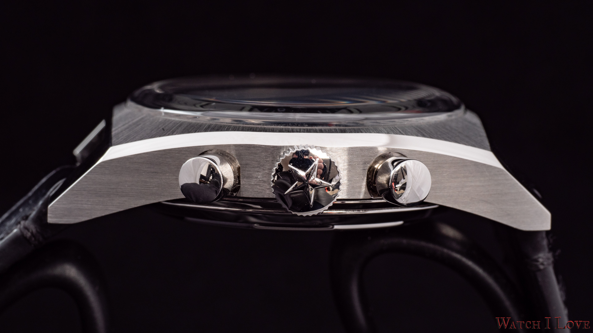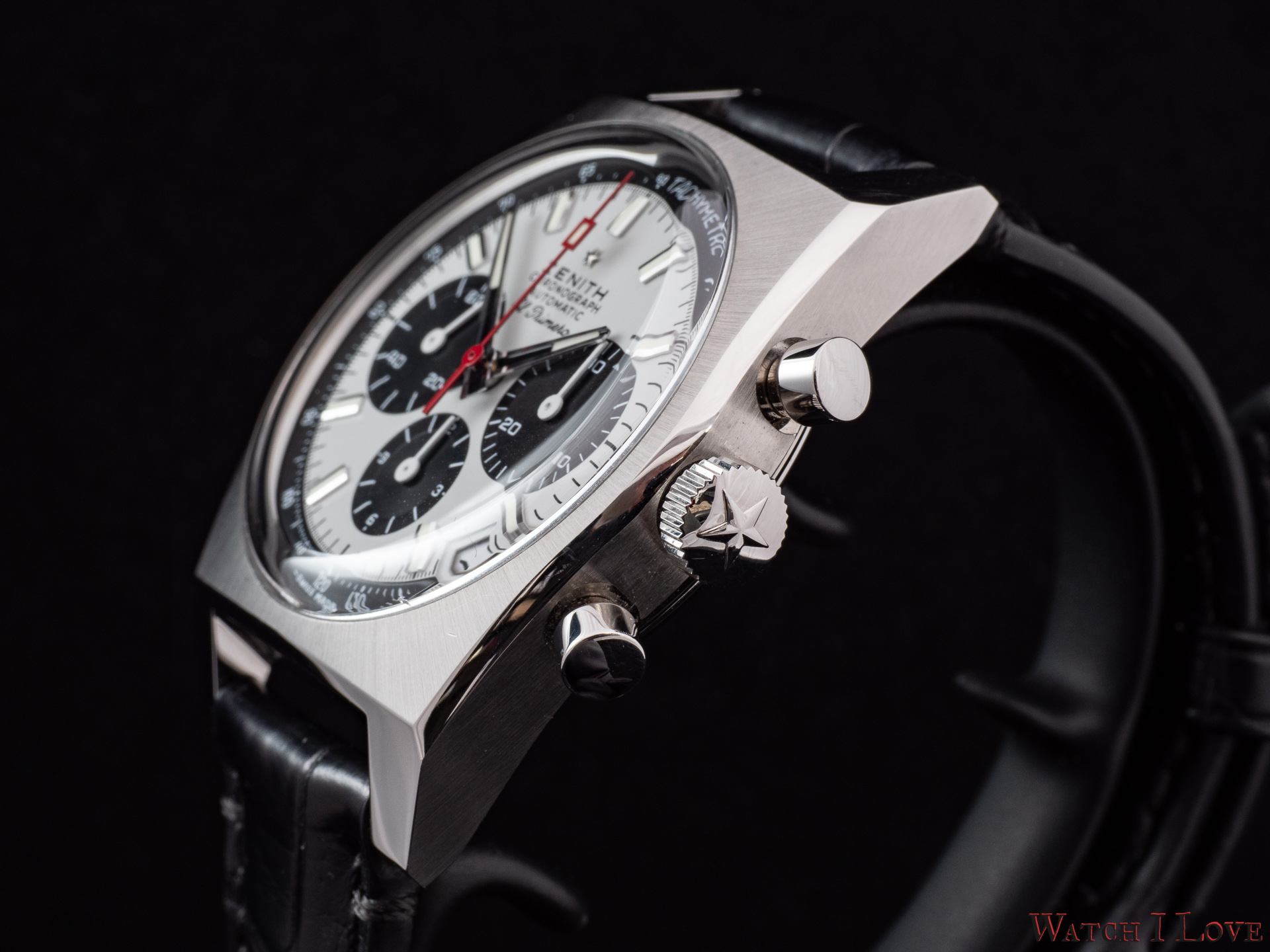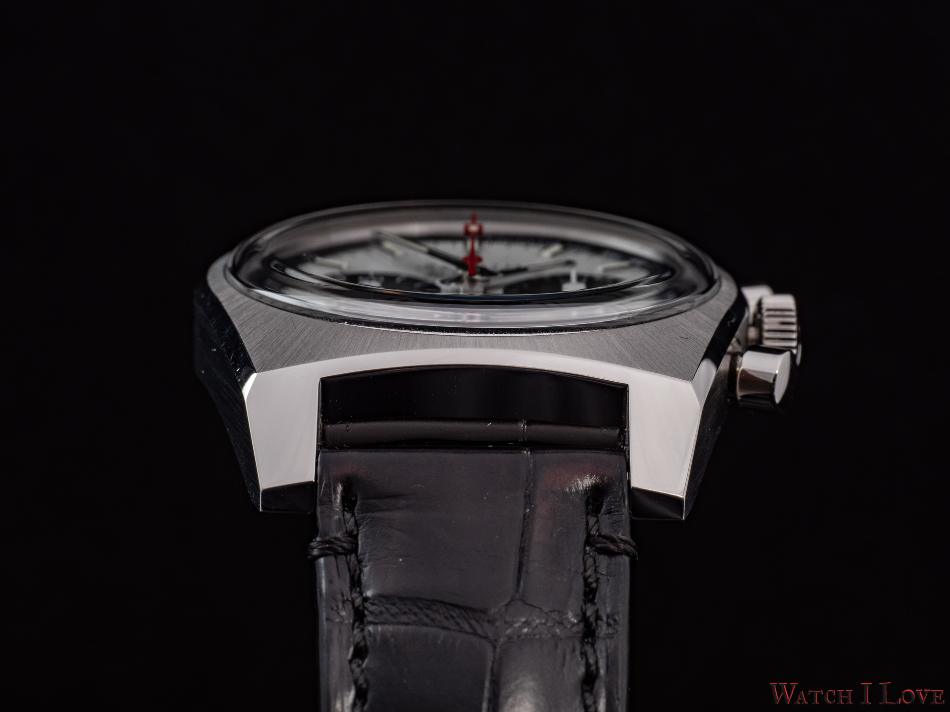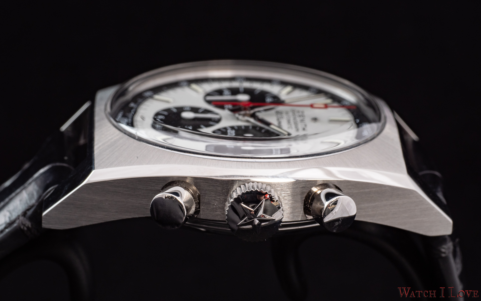 El Primero A384 comes with generous pushers and a relative flat crown. The polished details are lovely and the Zenith star on the crown steals the show. The view is balanced and pleasant by all standards. The handling is exceptional. The hands-on video above can offer a glimpse of how easy is to set and use.