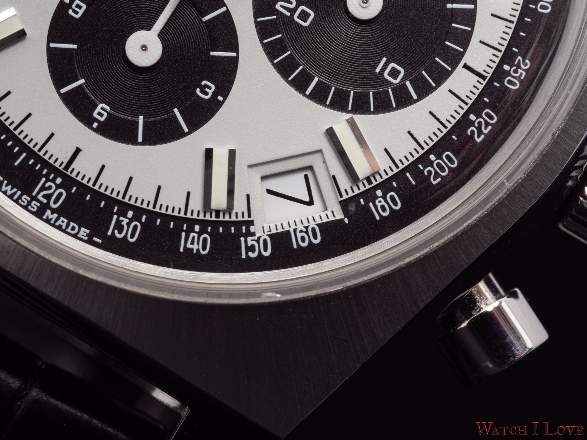 The date window is placed between 4 and 5 o’clock. It uses a “black on white” configuration. Since the date window bites from the chronograph’s register, the outer side of the window was decorated with silver indexes. In this way, the chrono readout is not compromised in that area.