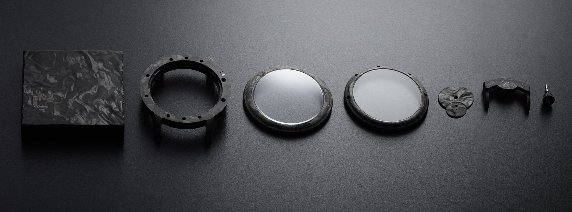 To make each of the Carbonium® elements for this timepiece, Lavoisier Composites creates Carbonium® blocks which are then finely shaped on a 5-axis machining centre before being matte-finished for a slightly silky surface appearance. In accordance with Romain’s wishes, Lavoisier chose a long fibre length of 50mm, in their eyes the sweet spot between mouldability, aesthetics and mechanical properties.