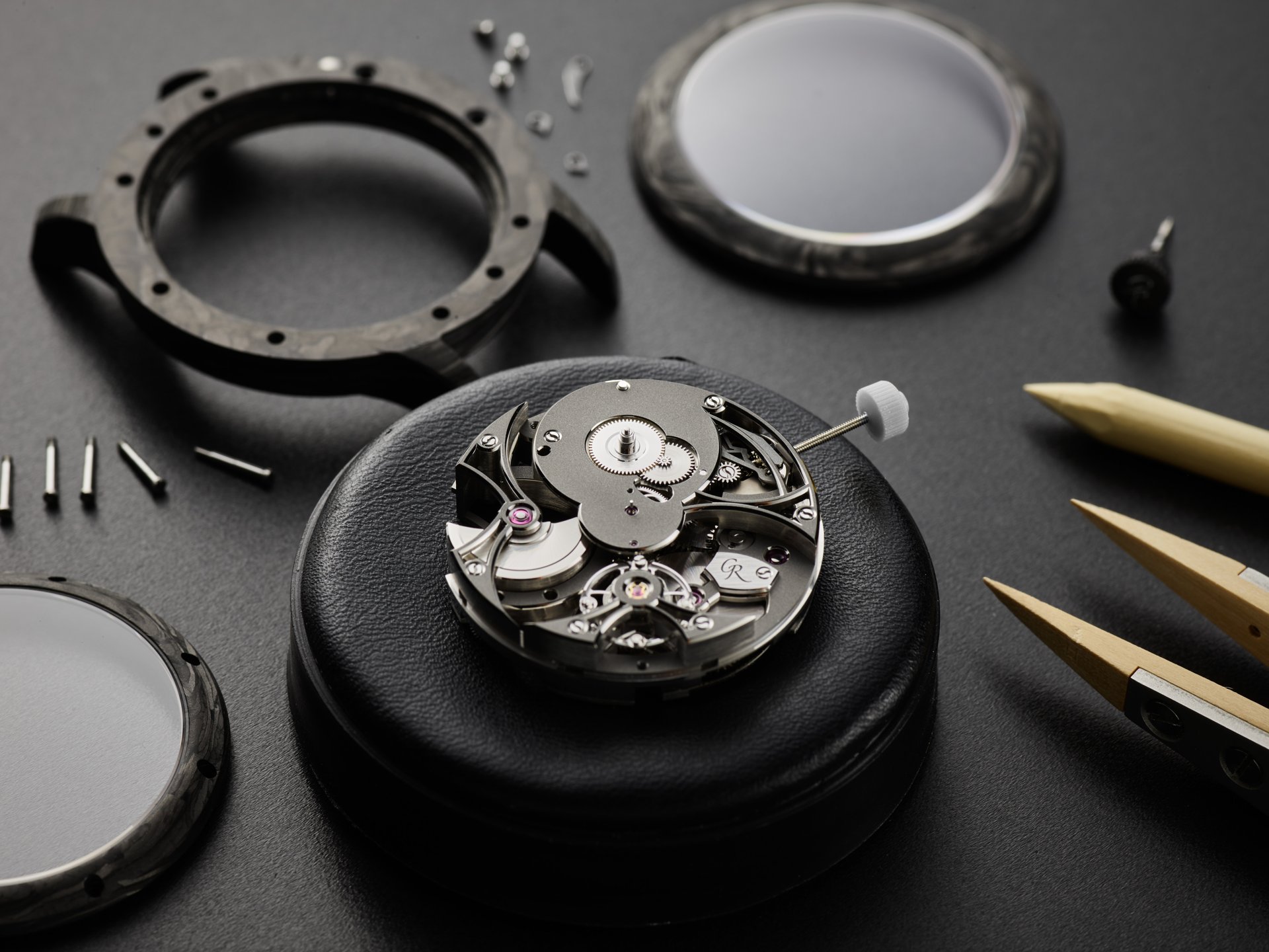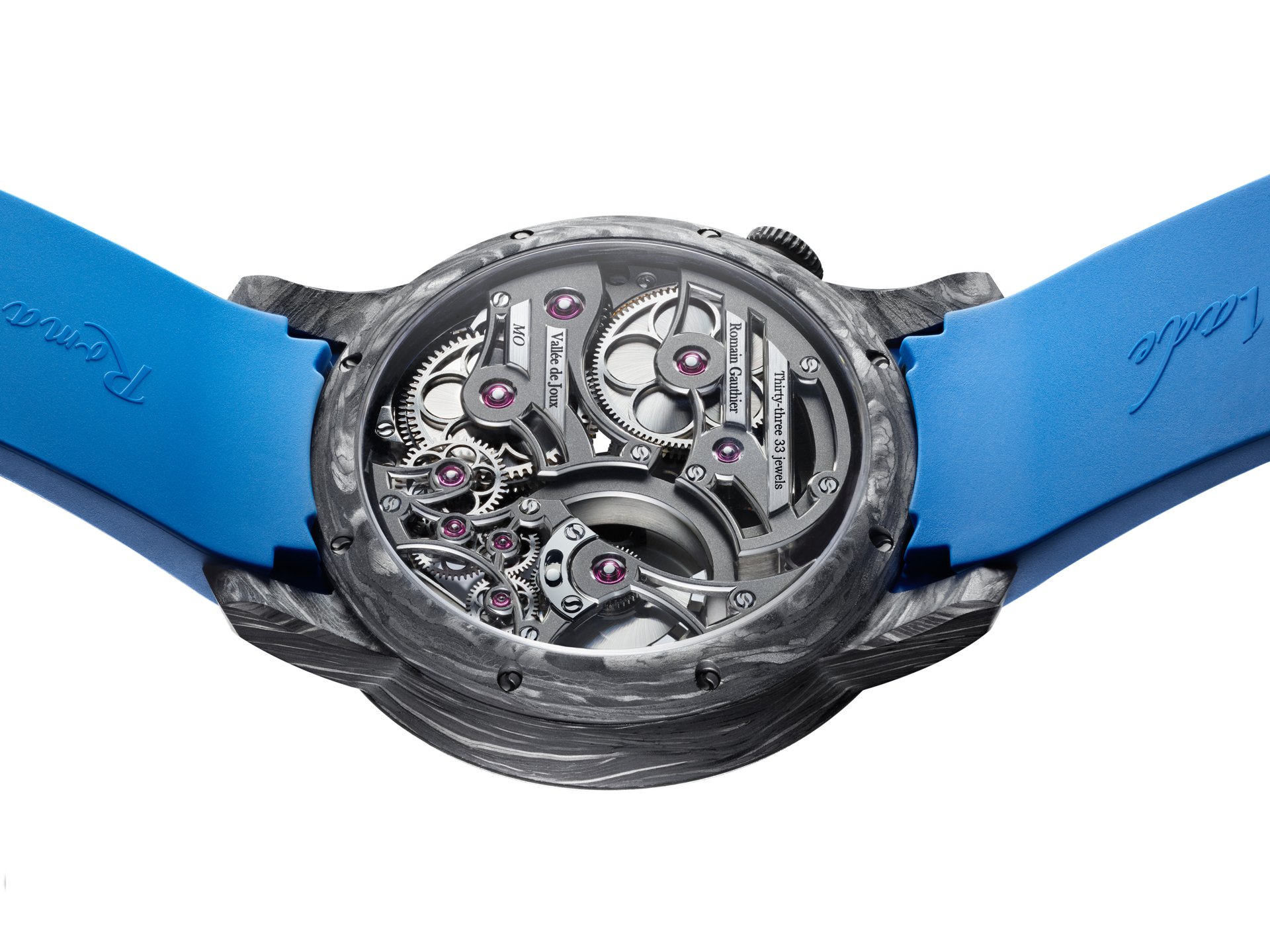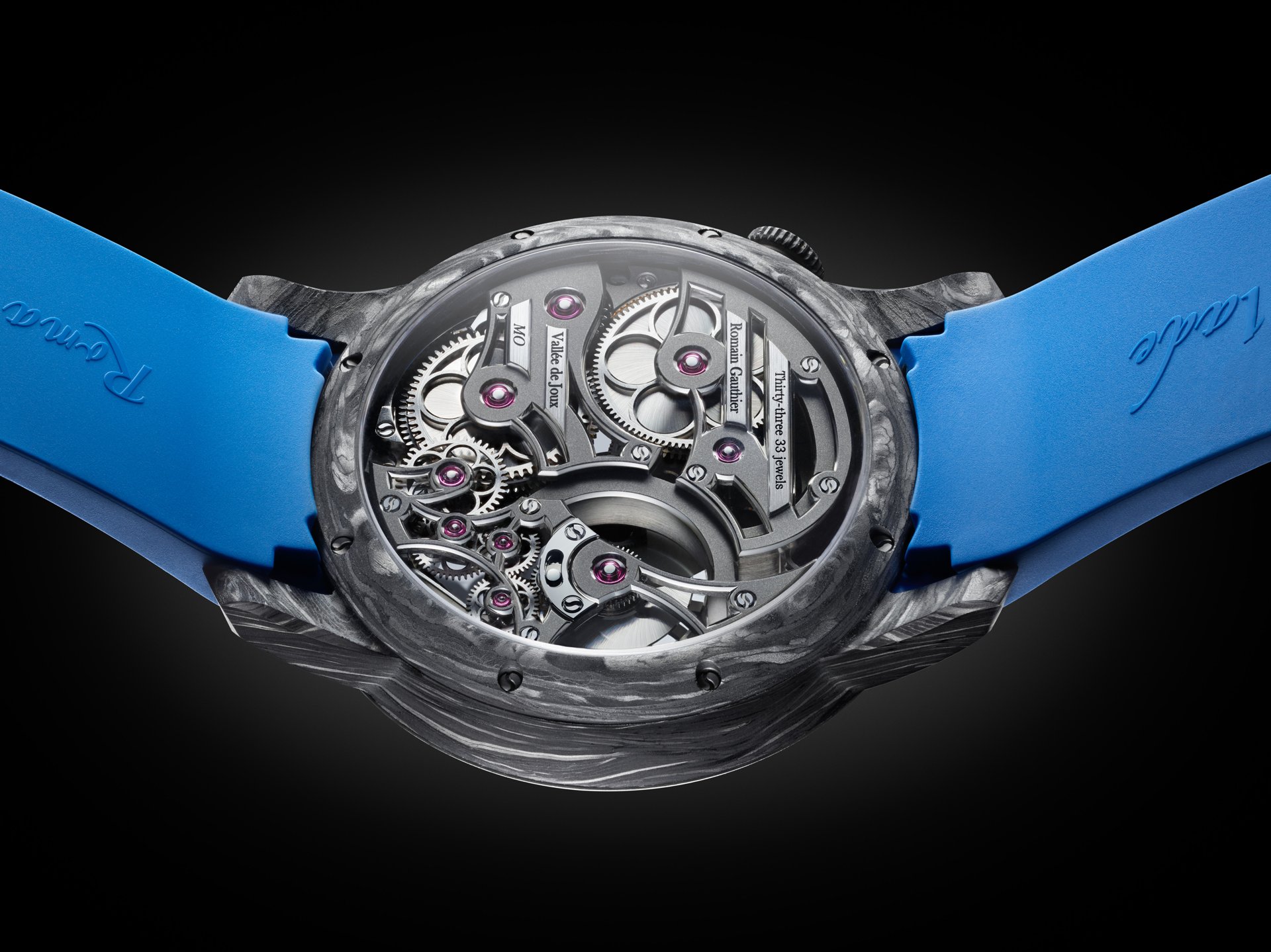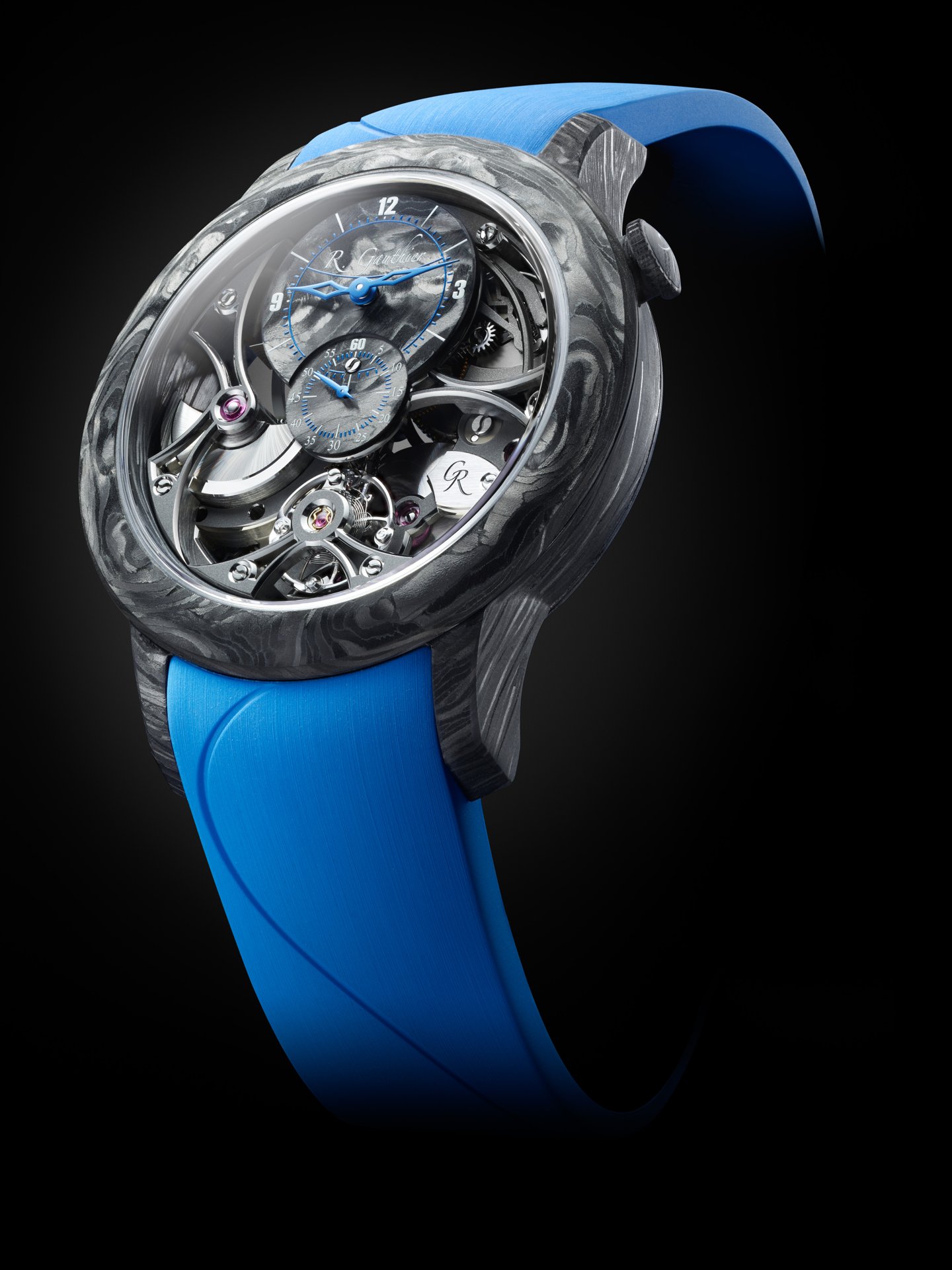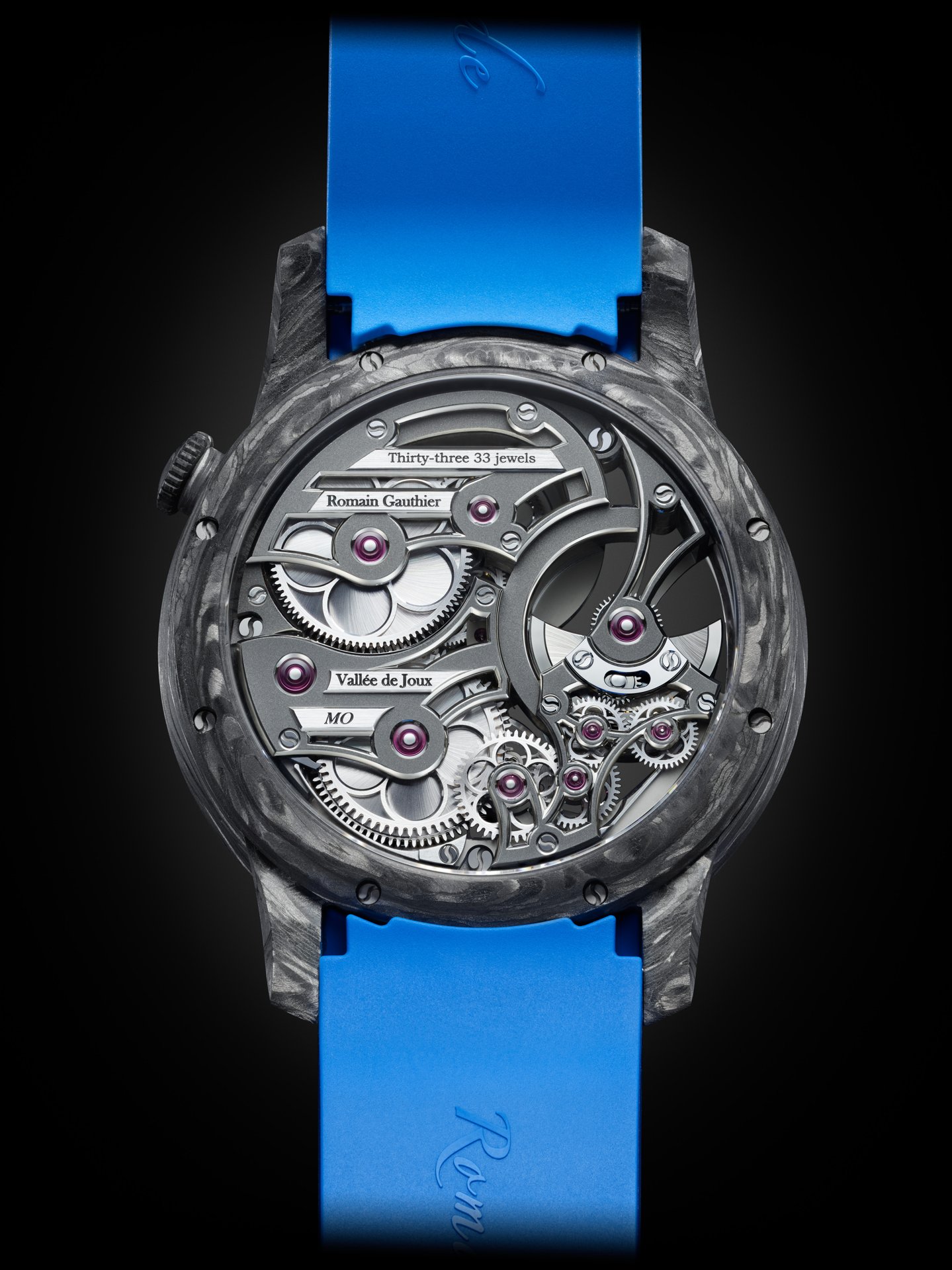 With carbon fibre watches, often the movement is placed in a watertight cylinder within an unwaterproofed case. Romain was keen to avoid this ‘hack’ and instead wanted the skeletonised movement to be protected from humidity by the Carbonium® case itself. To that end, Lavoisier Composites performed a multi-step waterproofing process developed especially for this Romain Gauthier case, that saw resin injected into the micropores – invisible to the naked eye – on the inside of the case to prevent water from entering it.