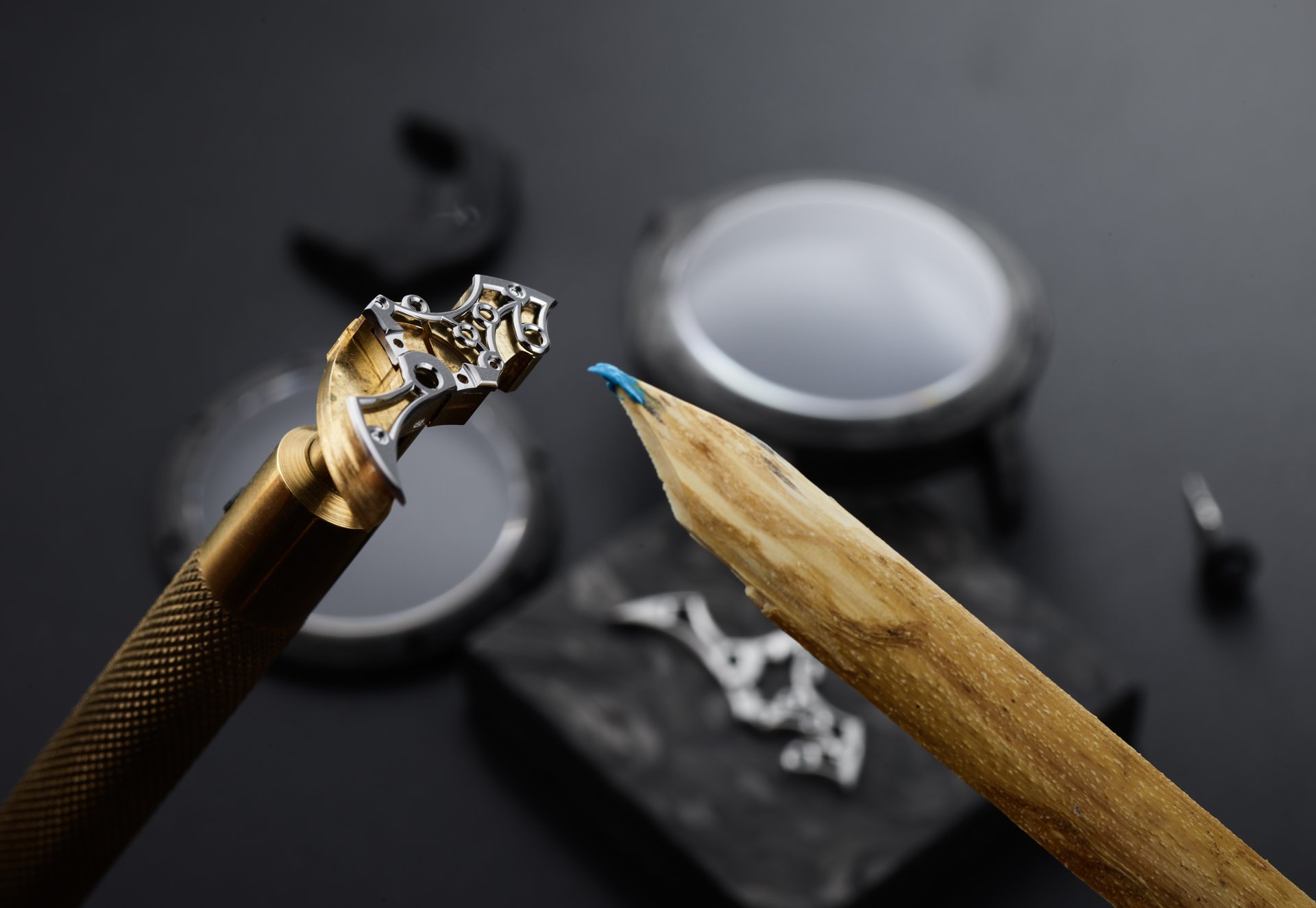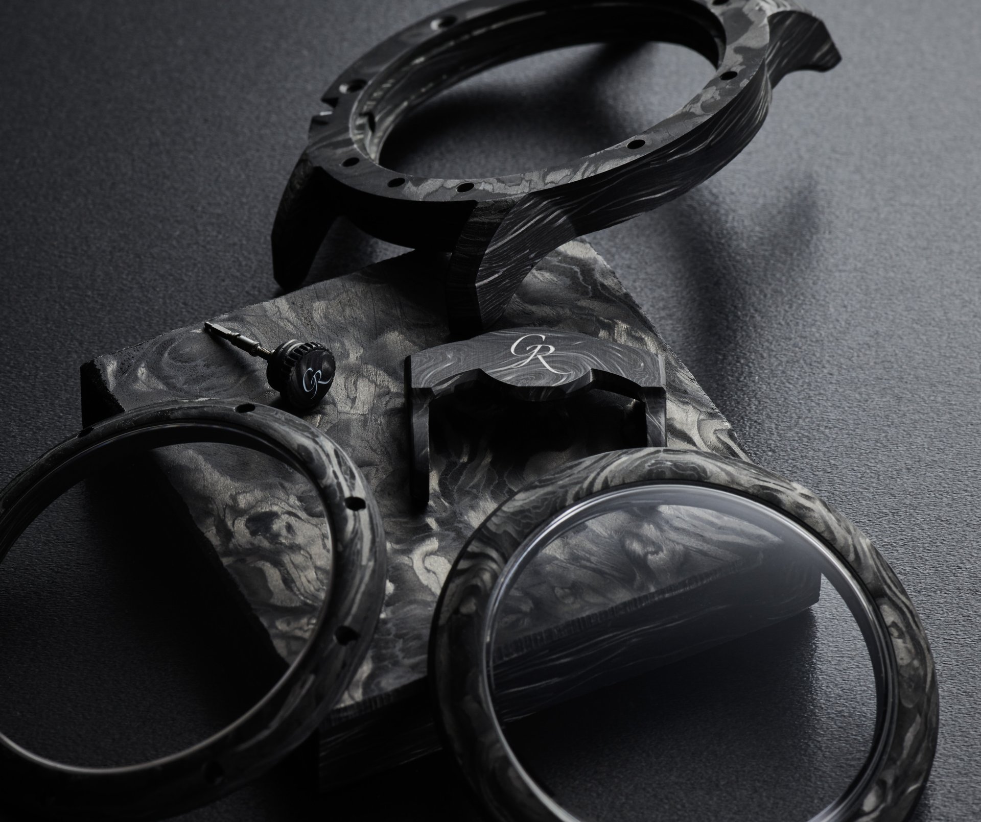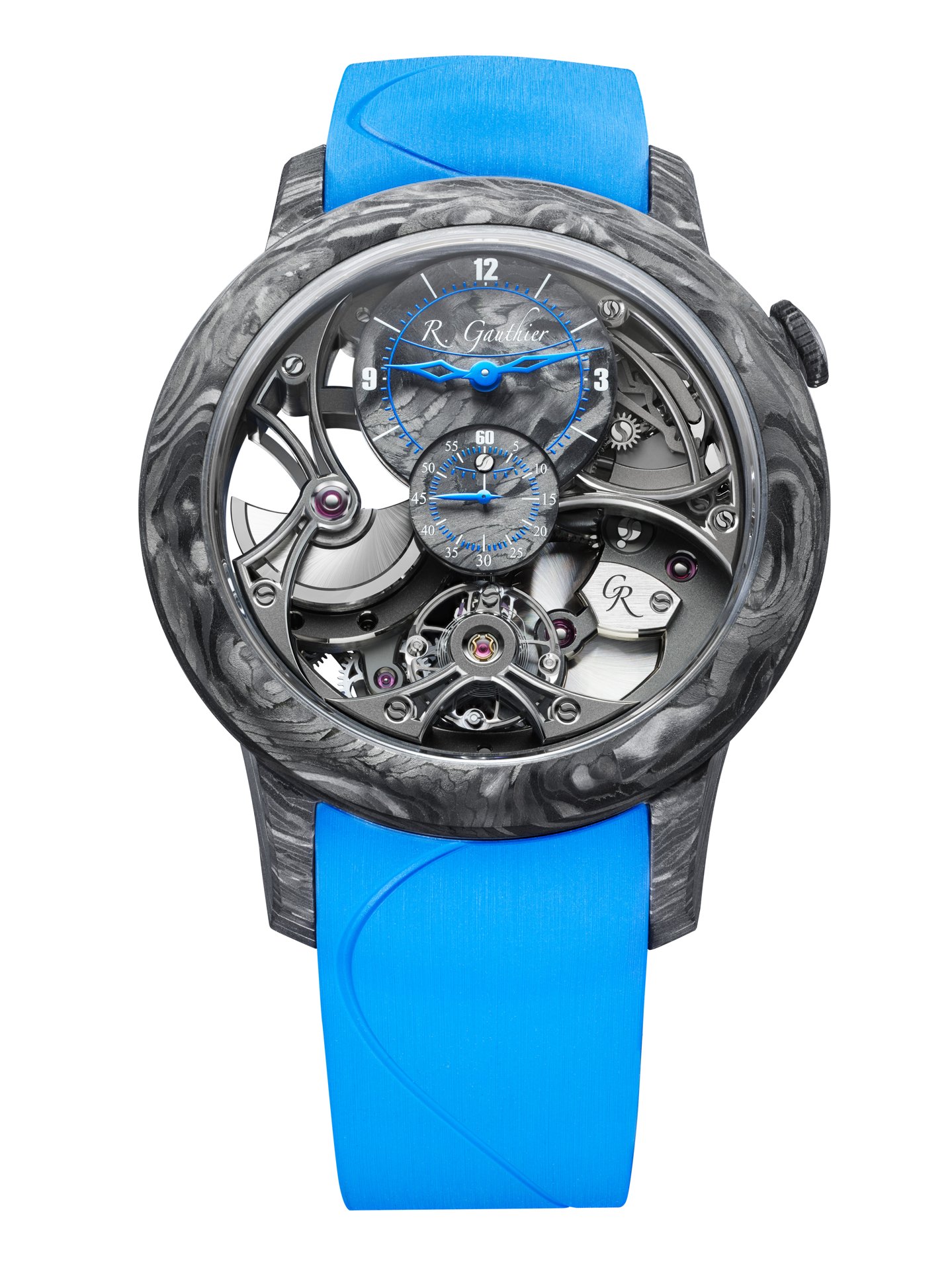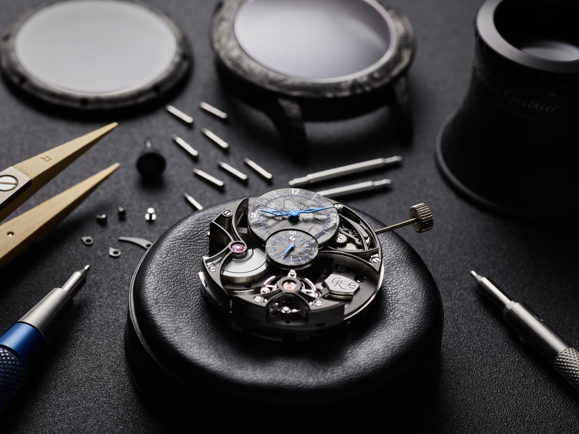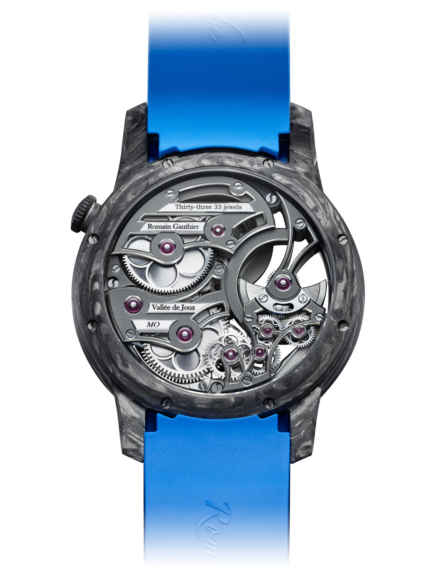 With carbon fibre watches, often the movement is placed in a watertight cylinder within an unwaterproofed case. Romain was keen to avoid this ‘hack’ and instead wanted the skeletonised movement to be protected from humidity by the Carbonium® case itself. To that end, Lavoisier Composites performed a multi-step waterproofing process developed especially for this Romain Gauthier case, that saw resin injected into the micropores – invisible to the naked eye – on the inside of the case to prevent water from entering it.