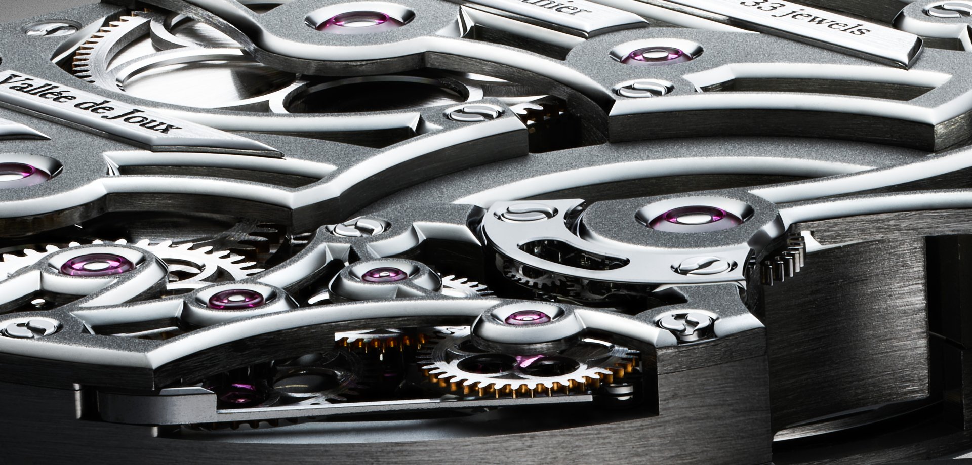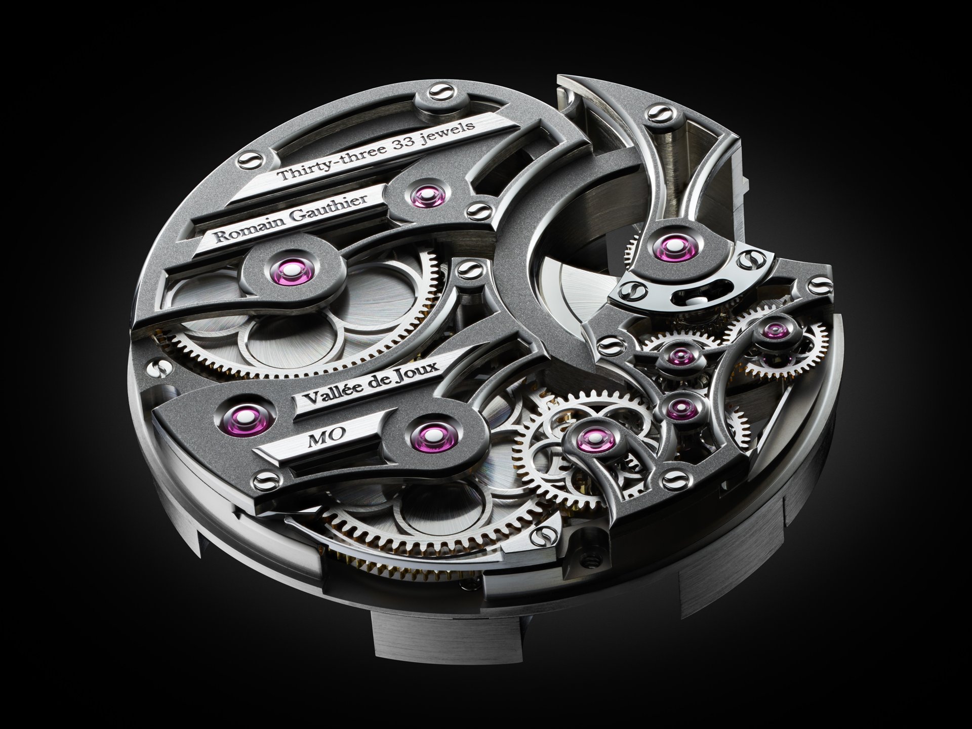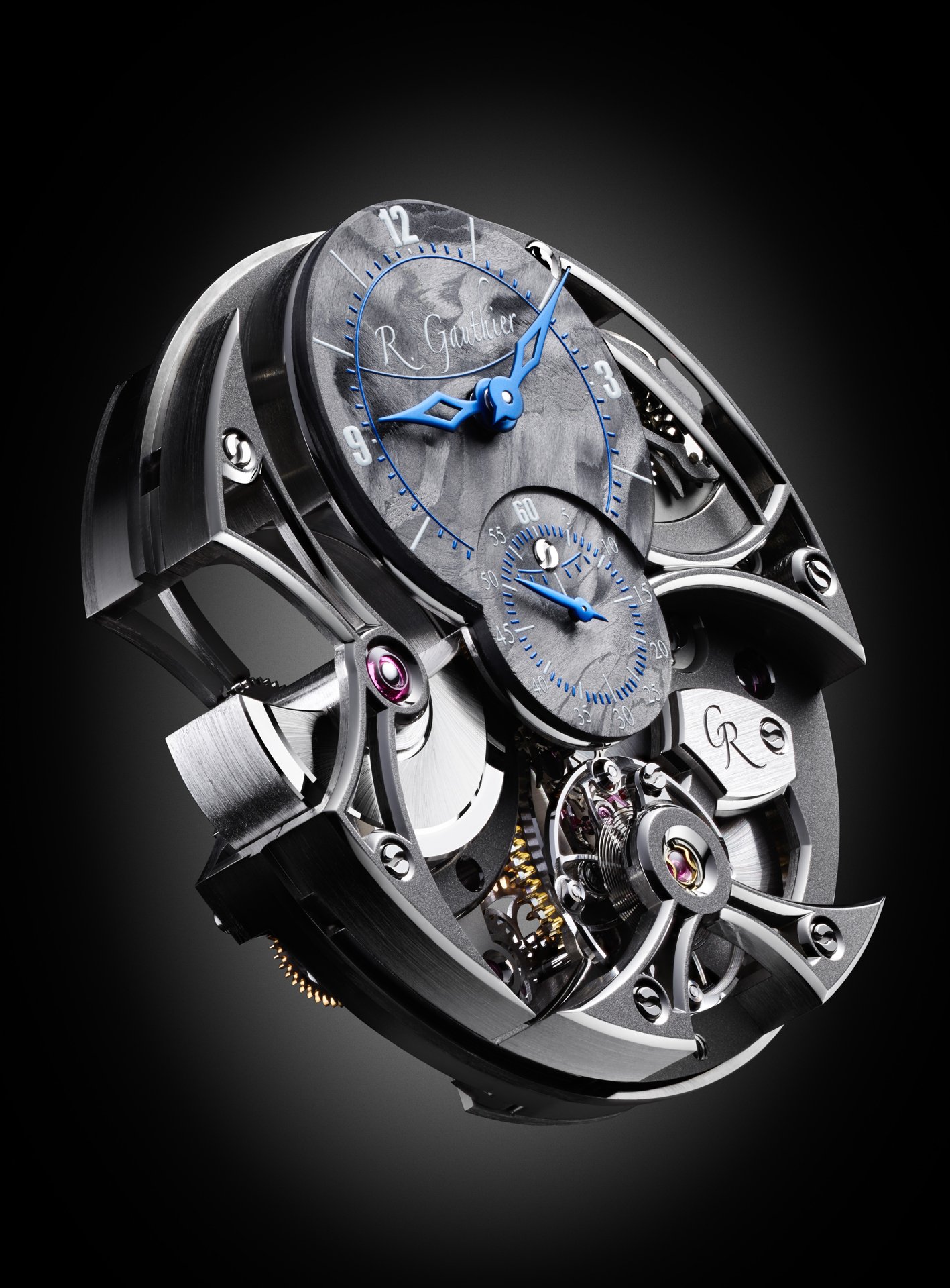 - Superlatively hand-finished, skeletonised mainplate and bridges in natural titanium