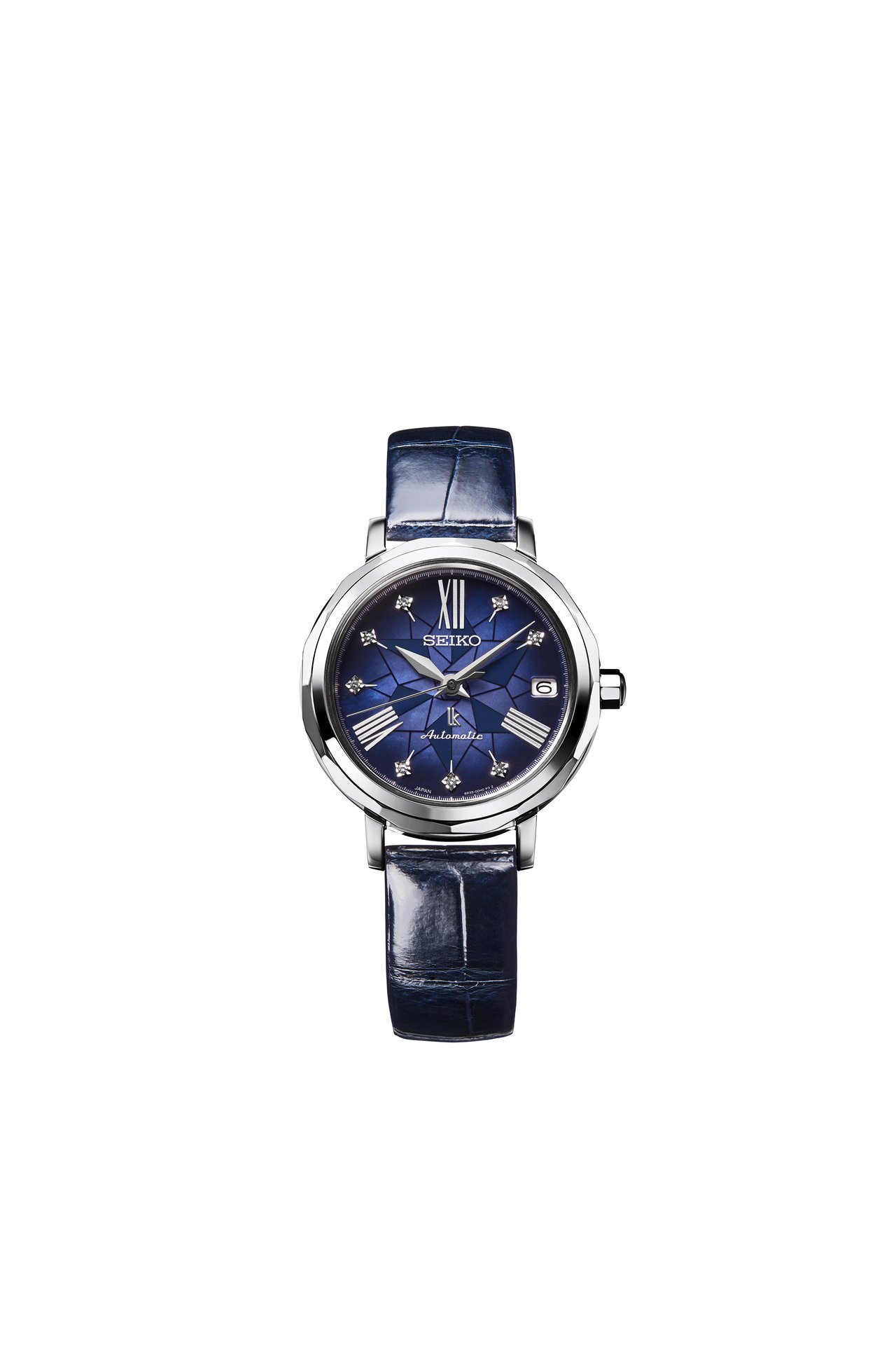 To celebrate the arrival of Lukia on the international stage, a special watch is offered in a limited edition of just 250. Its dial is the colour, Tsukishiro, of the blue-white evening sky that frames the Ginza skyline as the moon is about to appear. It has 55 diamonds on the bezel and eight diamonds on the dial. The unique and distinguished look of the strap is made possible by a special, two-stage dyeing method. After the leather is first dyed white, the grooves in the pattern are then dyed light blue.