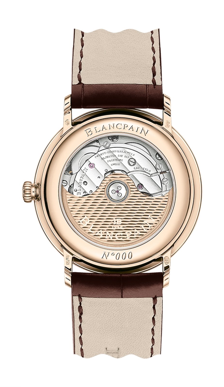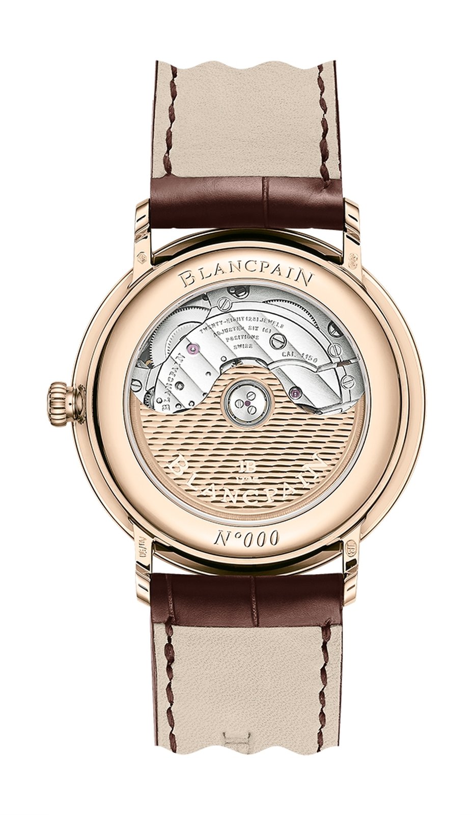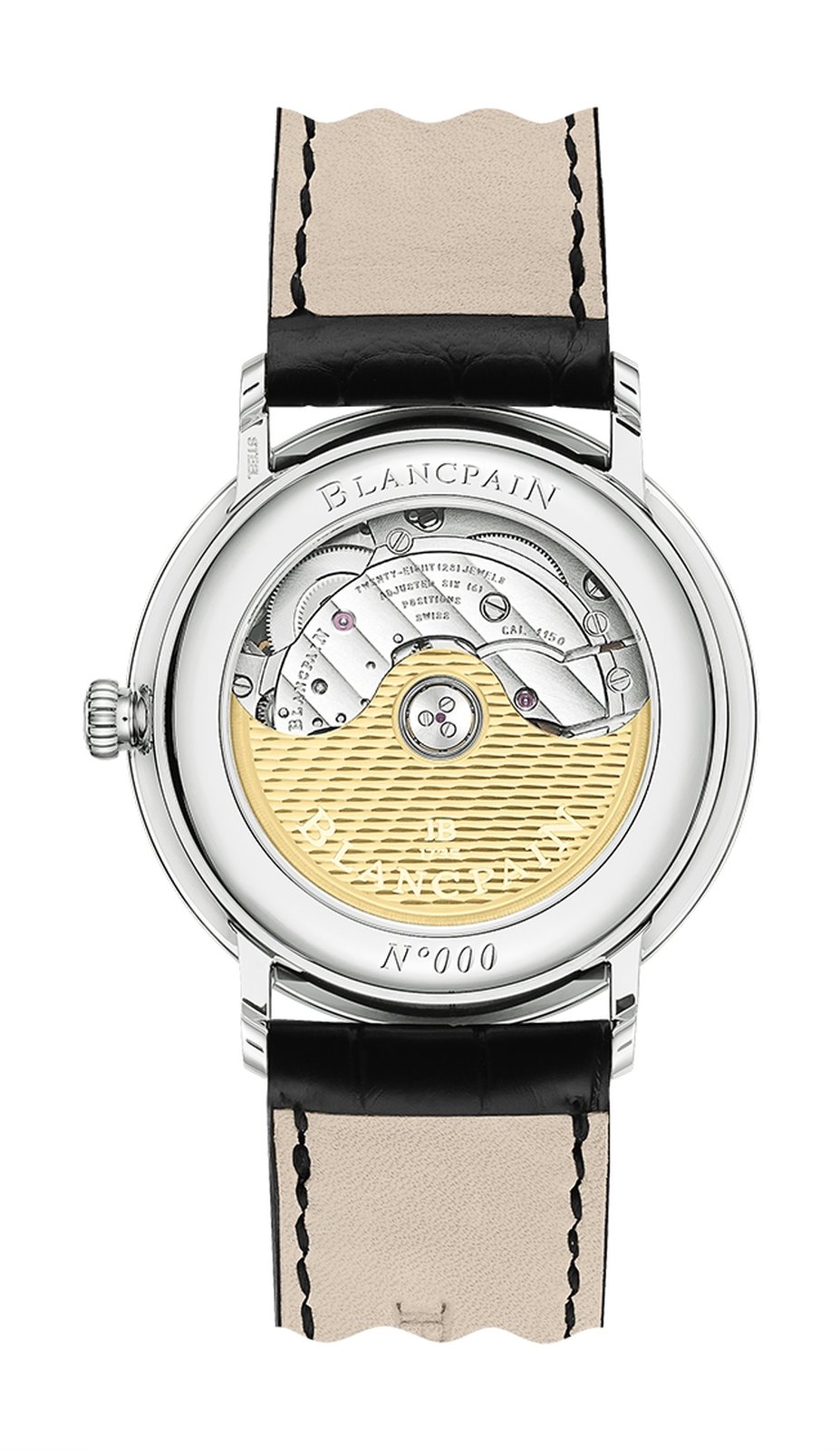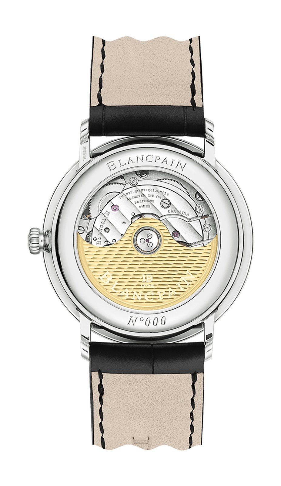 While simplicity reigns supreme on the dial, the sapphire back reveals a finely structured movement brimming with contrasts, Blancpain Calibre 1150. Circular-grained and adorned with the traditional côtes de Genève motif, it also features a gold oscillating weight with a honeycomb pattern. The 1150 movement is a watch industry benchmark that paved the way for generous power reserves. Thanks to the use of two series-coupled barrels and high-performance springs, it has doubled the standard capacities – of around 40 to 48 hours – in order to achieve a comfortable four days of autonomy while ensuring constant energy throughout this period. These technical features are complemented by the use of a silicon balance-spring guaranteeing remarkable non-magnetic and chronometric properties.