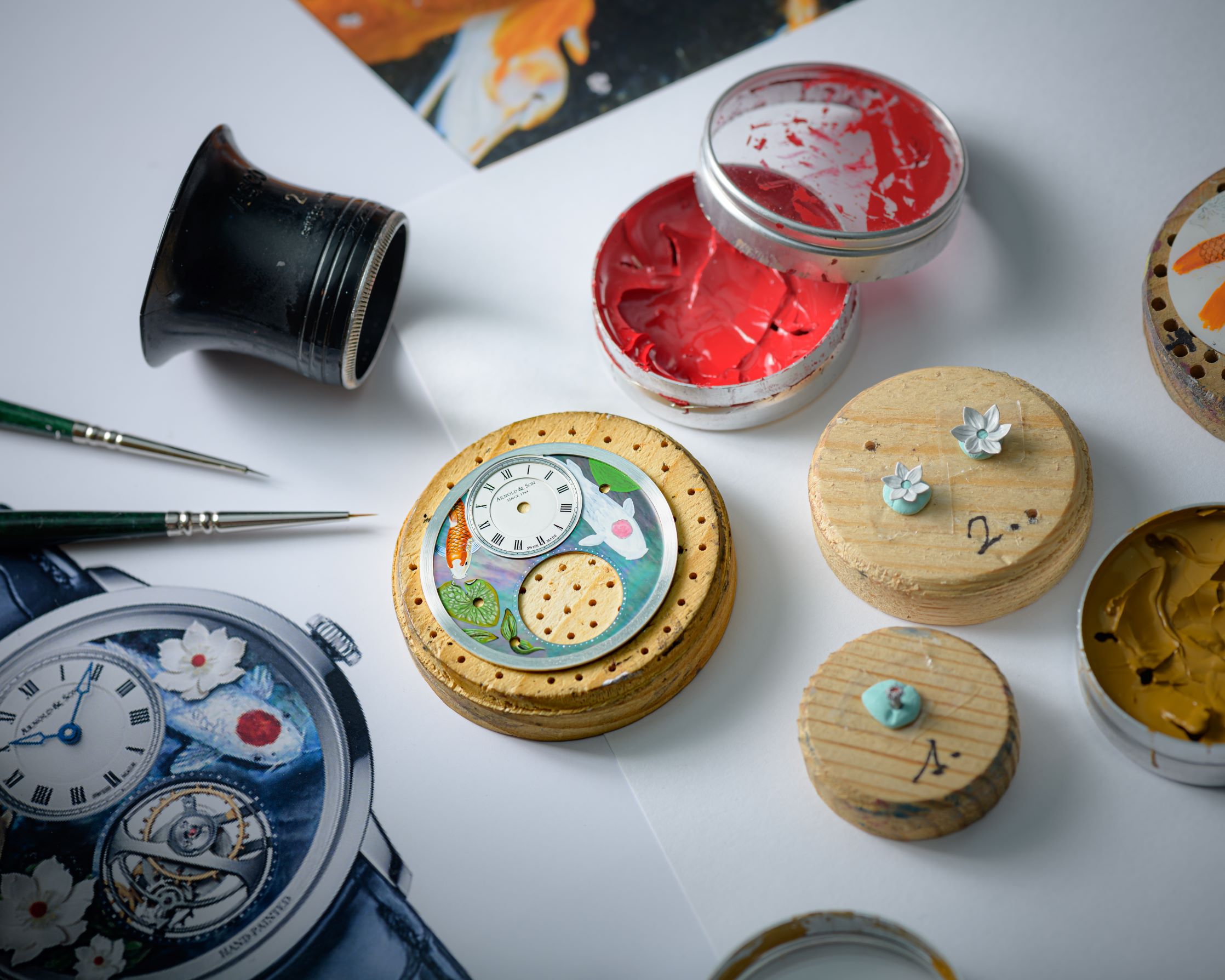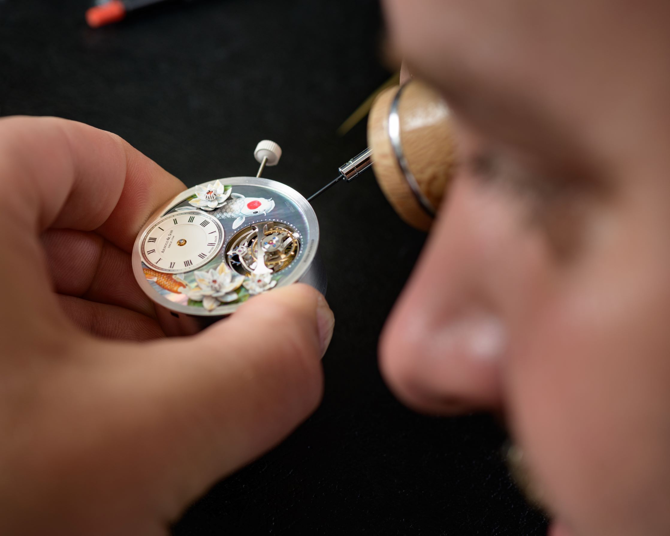 The carp and lotus leaves, meanwhile, are painted by hand using incredibly thin brushes that allow a wealth of details to be added, such as scales, barbels and striped fins. The base of the dial is made from blue-toned mother-of-pearl, its iridescent shimmer evoking the water in which this charming scene unfolds.