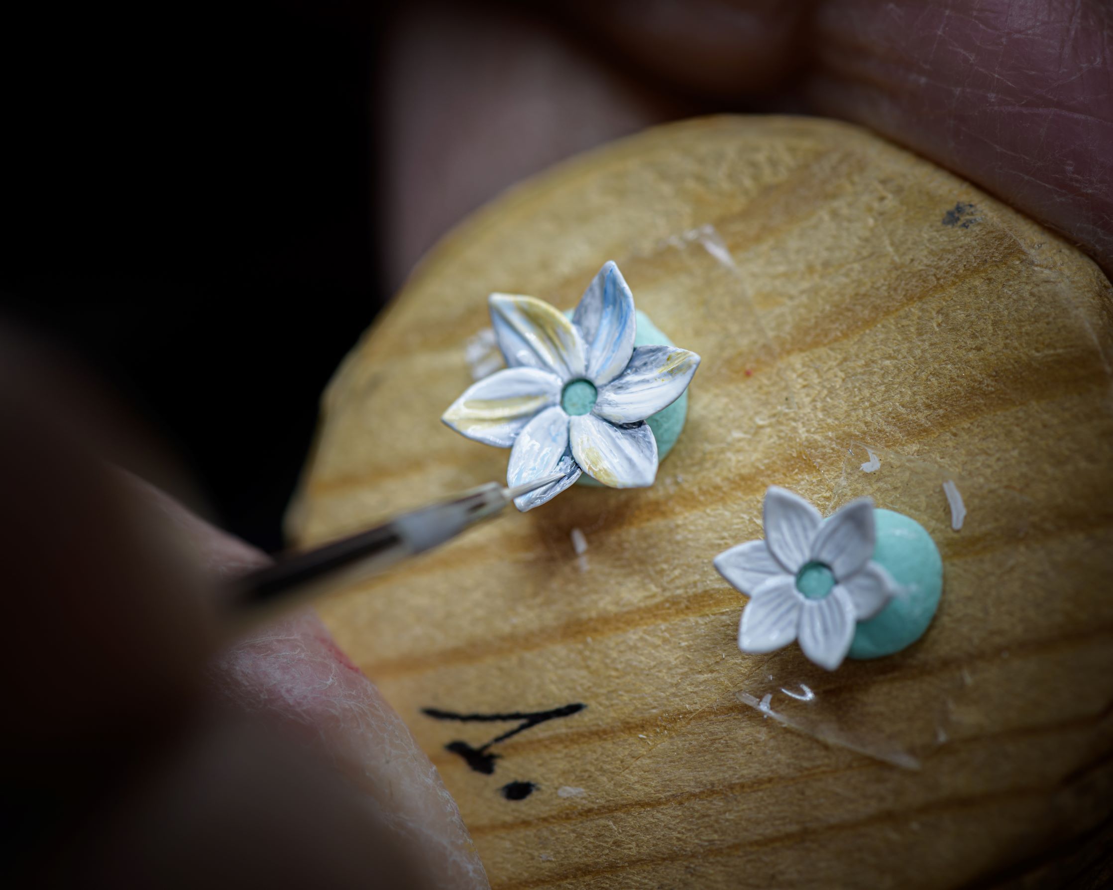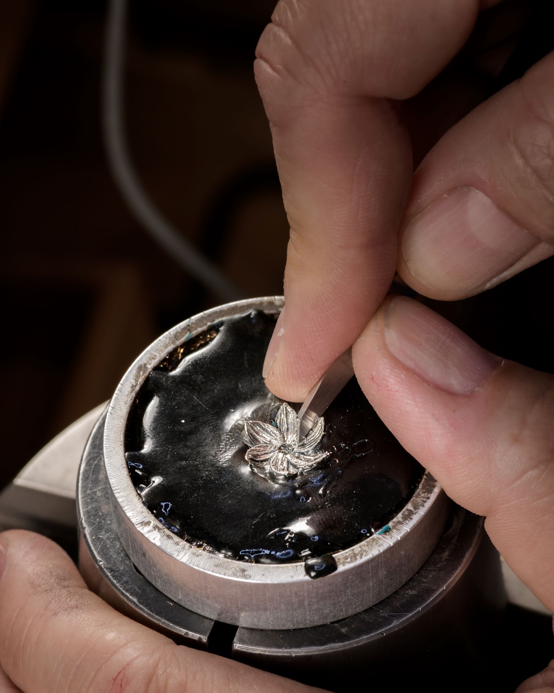 Above these ornamental carp float three lotus blossoms. The petals are cut from silver and shaped, before being engraved, polished and painted in dazzling white lacquer. Each flower’s pistil is formed separately using the same techniques, then the two parts are combined.