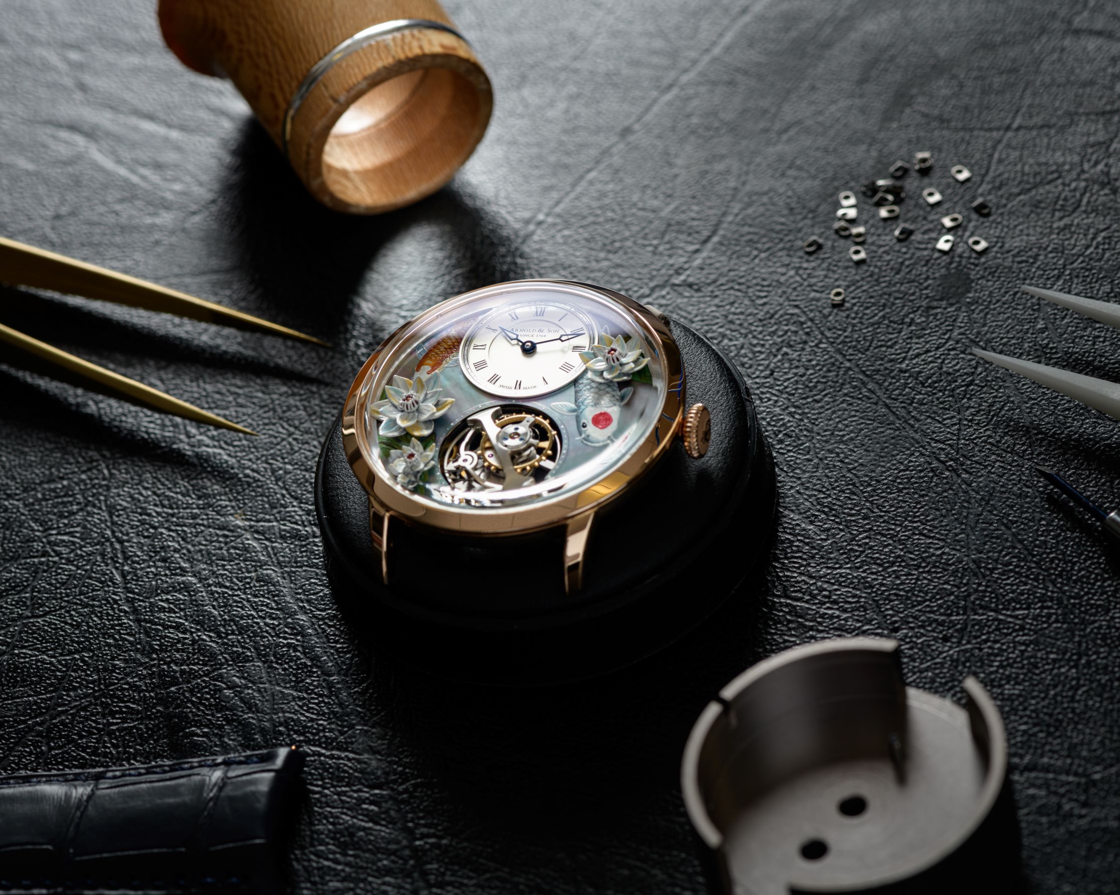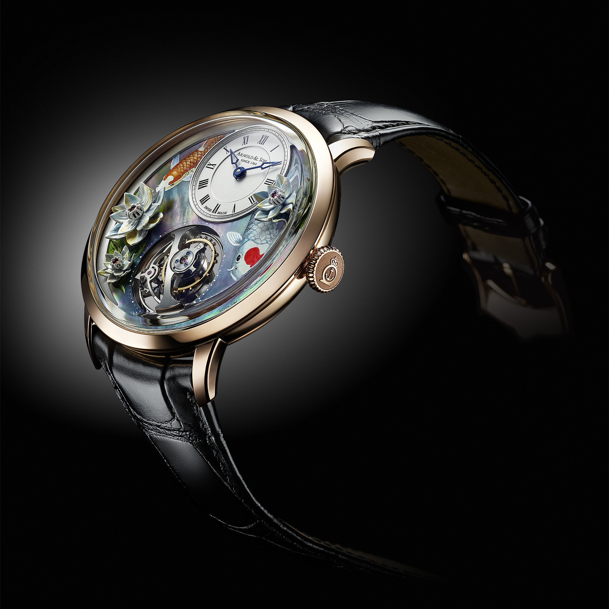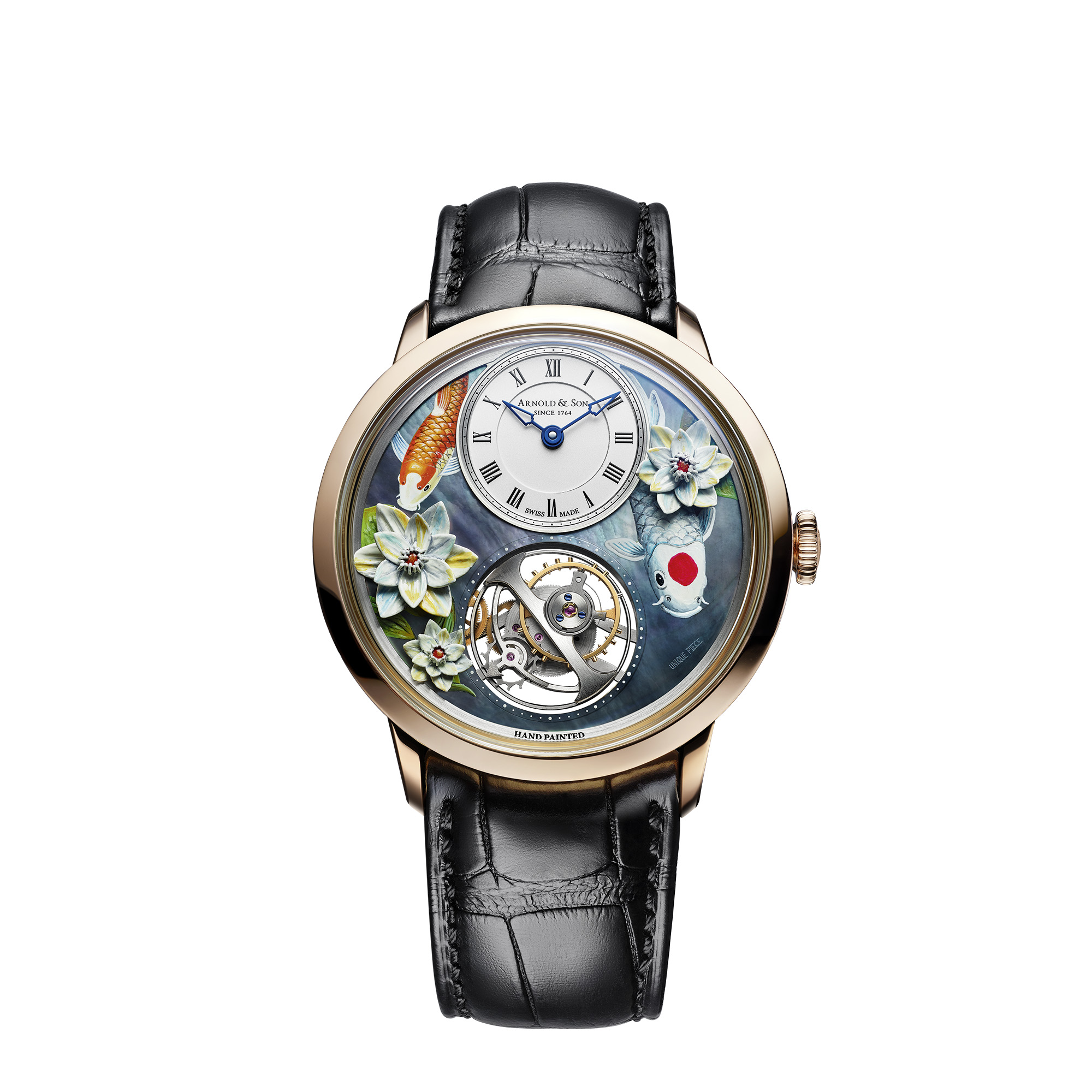 Delicately placed on a mother-of-pearl dial, hand-painted carp and sculpted lotuses surround a flying tourbillon. Arnold & Son presents the Ultrathin Tourbillon Koi, a delicate unique piece that blends fine watchmaking and the artistic crafts. The House showcases its broad spectrum of skills within a red-gold case measuring 8.34 mm thick. Here, the finest craftsmanship builds on tried-and-tested watchmaking technique.