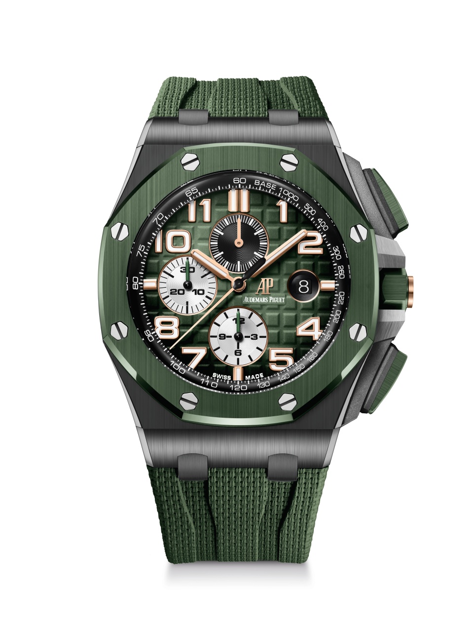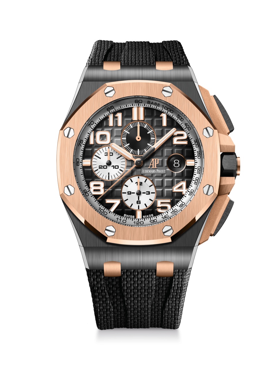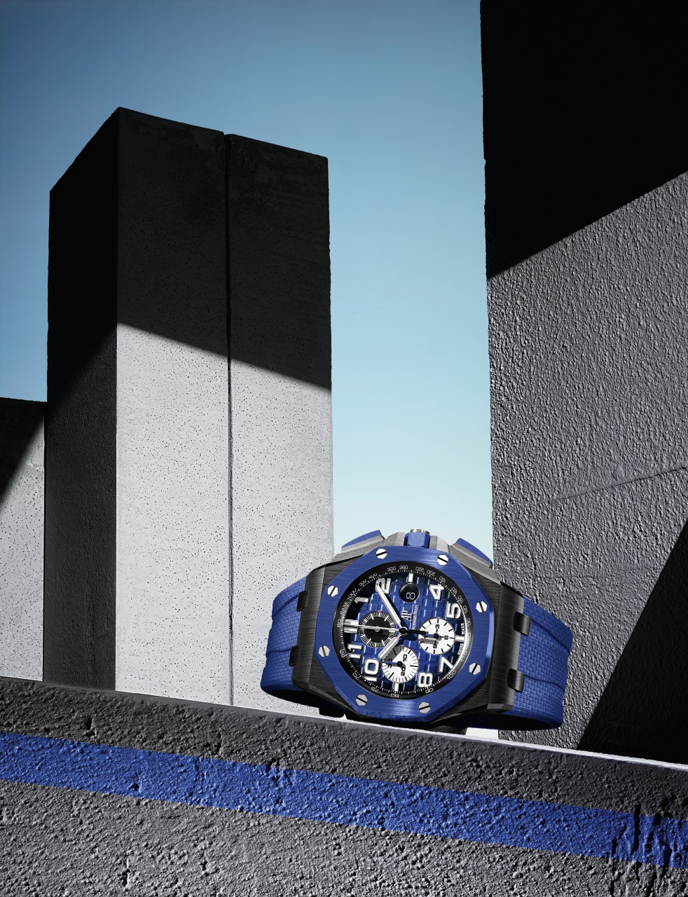 The new Royal Oak Offshore Selfwinding Chronograph is presented on a colour co-ordinated textured rubber strap, ideally suited to an active lifestyle.