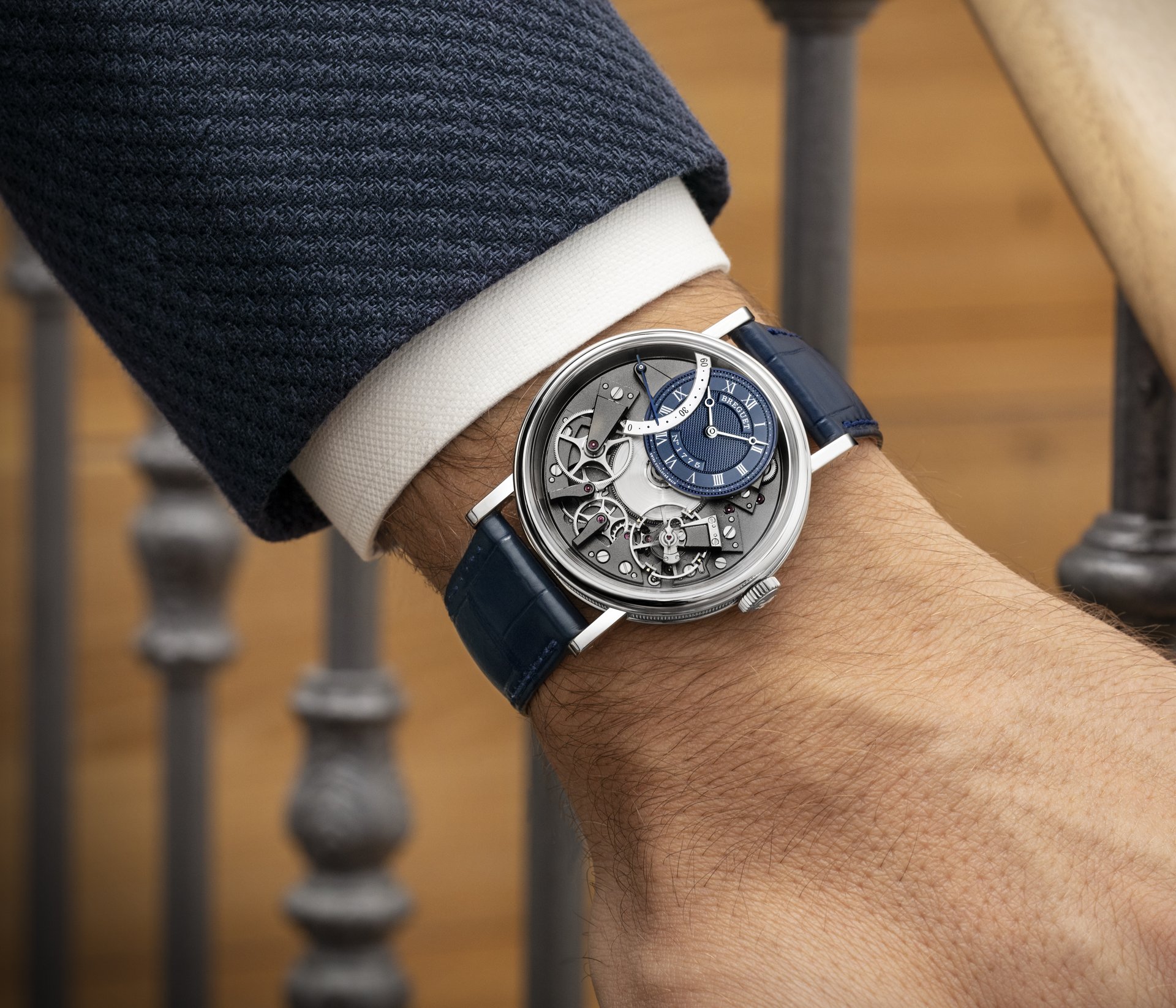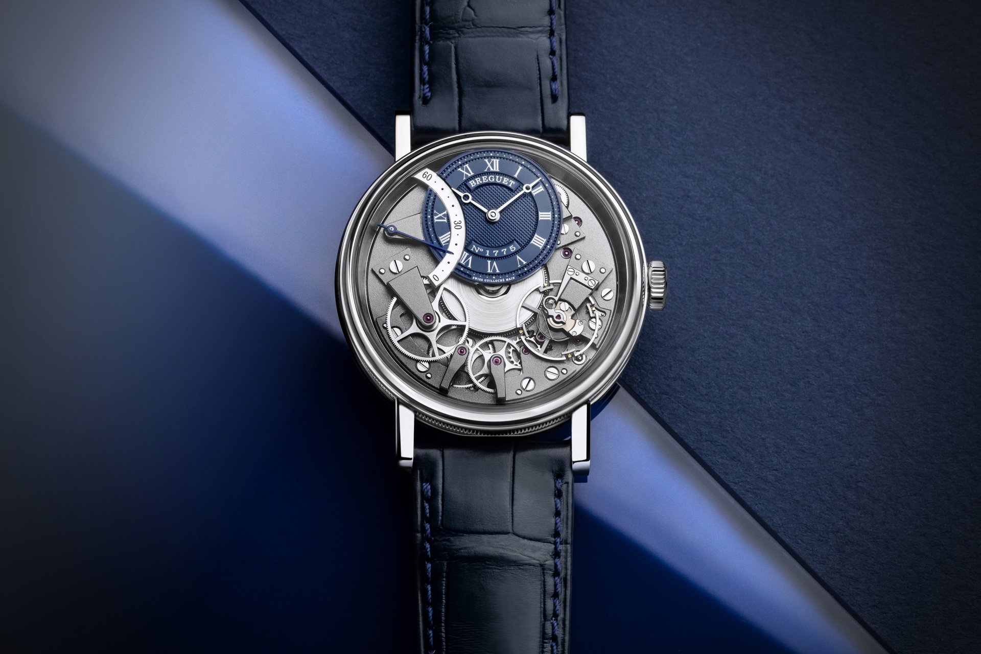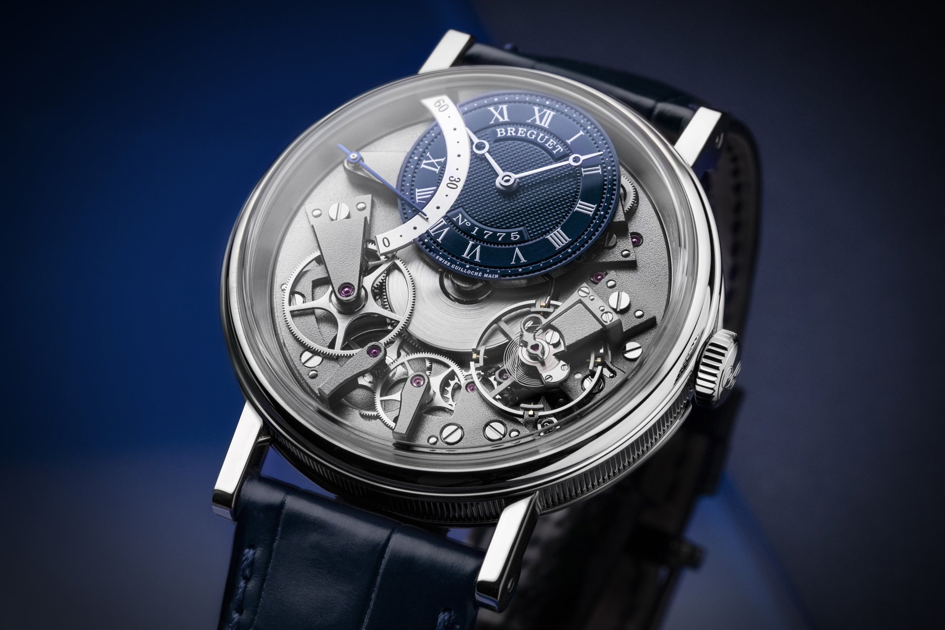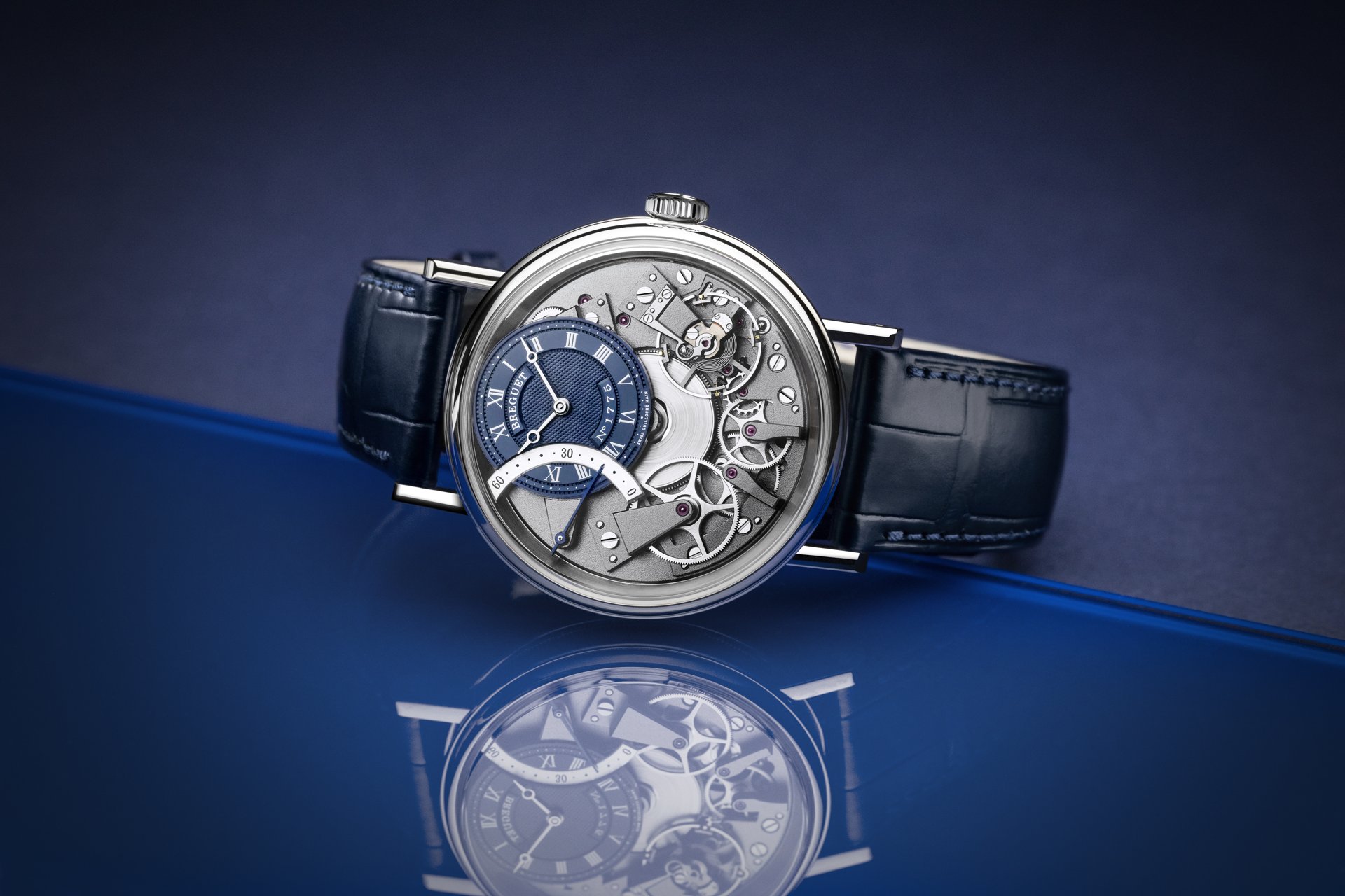 In 2005, the House of Breguet launched the Tradition collection of timepieces distinguished by a unique construction: the movement components are showcased on top of the mainplate. This year the original and remarkable line presents a new design version of the Tradition Automatique Seconde Rétrograde 7097 with a blue coloured guilloche dial. This new model, the Breguet Tradition 7097, will be exclusively available in Breguet boutiques.