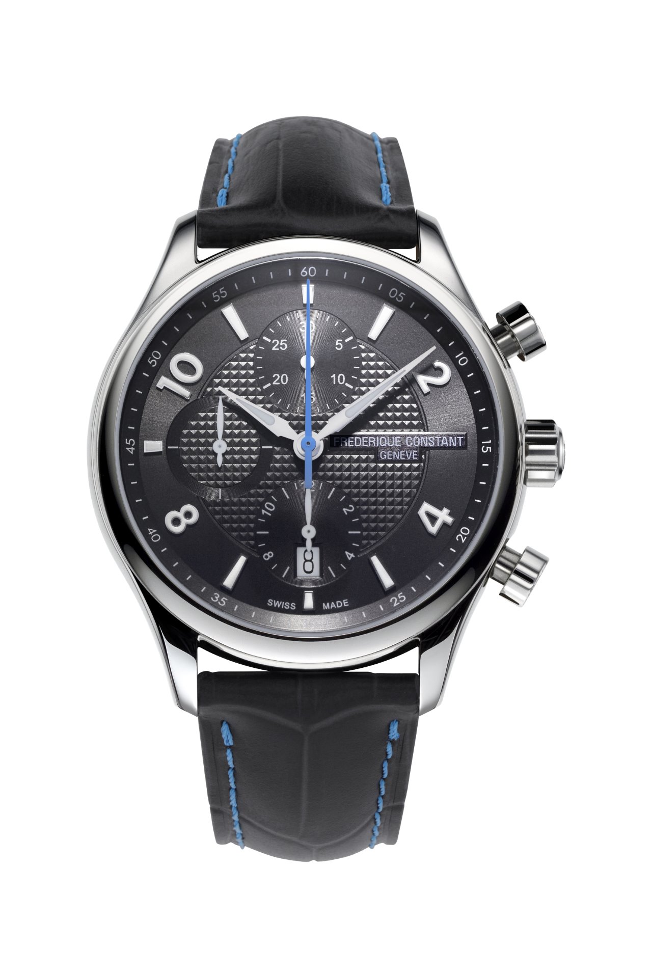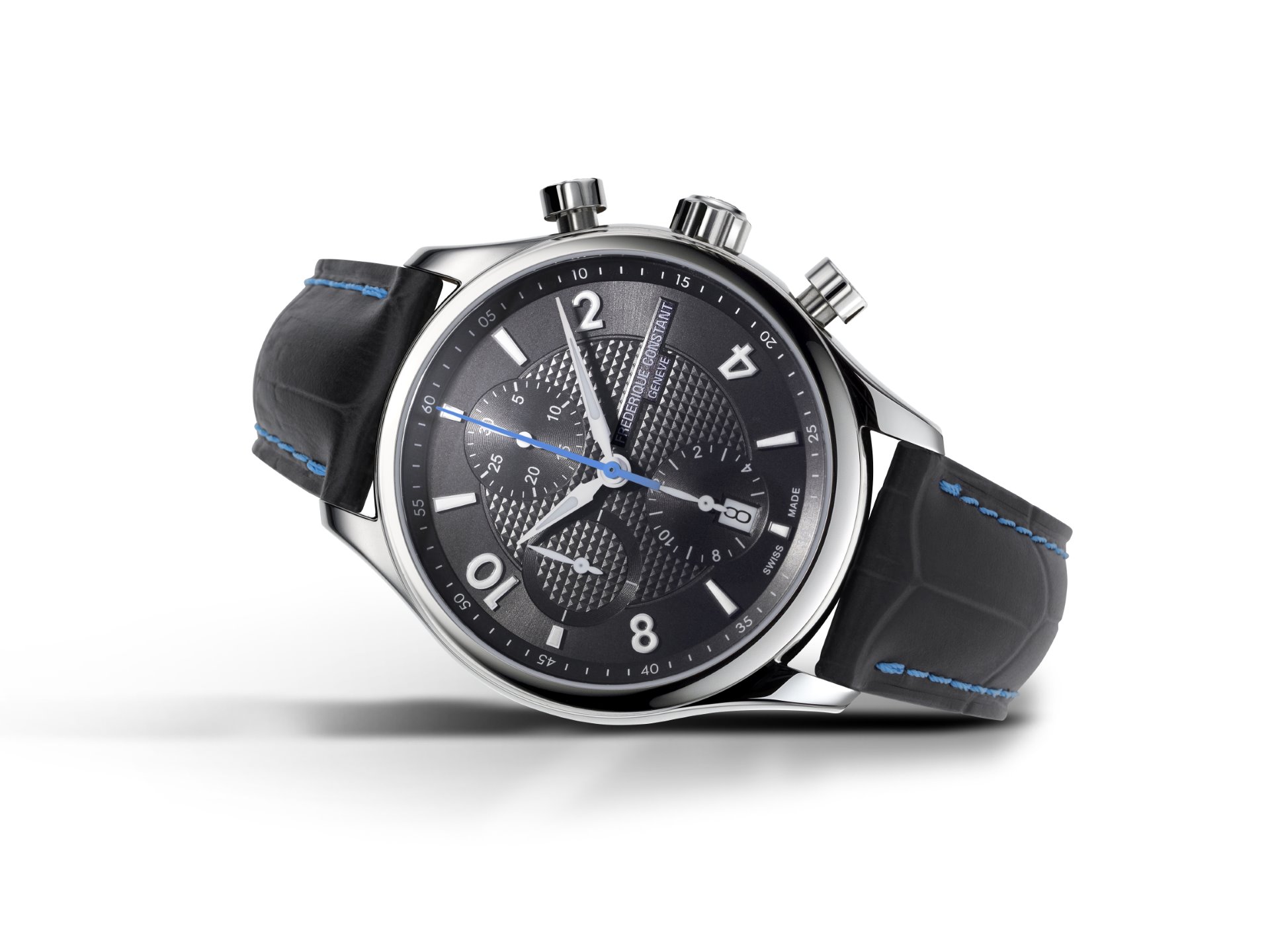 Housed in a 42 mm steel case, the two new Runabout RHS Chronograph Automatic models share a tricompax chronograph (12 o’clock – 6 o’clock – 9 o’clock) powered by the automatic FC-392 calibre, ensuring a power reserve of 46 hours. The Swiss origins of these timepieces are revealed through the guilloché dial – a traditional finish in Swiss Made Fine Watchmaking – either anthracite grey or silvered, depending on the edition. Two luminescent hands glide over a date window at 6 o’clock and are complemented by a large central seconds hand in blued steel, recalling the colour of the great Italian lakes. This maritime hue is picked up in the topstitching on the version that comes on a black calfskin leather strap and adorns the strap on the second model, which is finished with grey topstitching.