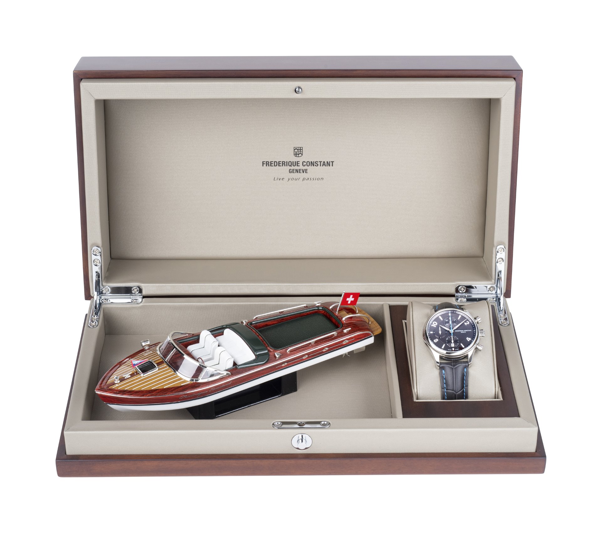 In 1988, over 30 years ago, a young and independent family company was established in Geneva, the heart of the Swiss watch industry. Meanwhile, on Italian shores, an association was set up to celebrate La Dolce Vita by preserving the famous Riva. This legendary yacht, the first examples of which were made by hand entirely out of wood, embodied the easy-going Italian way of life from the 20s to the 60s. In 2009, the two entities came closer together, giving rise to a continued partnership, the fruit of which can be seen in the Runabout collection. This year, Frederique Constant is introducing its new Runabout RHS Chronograph Automatic model in honour of this collaboration and available in two limited series each composed of 2,888 pieces.