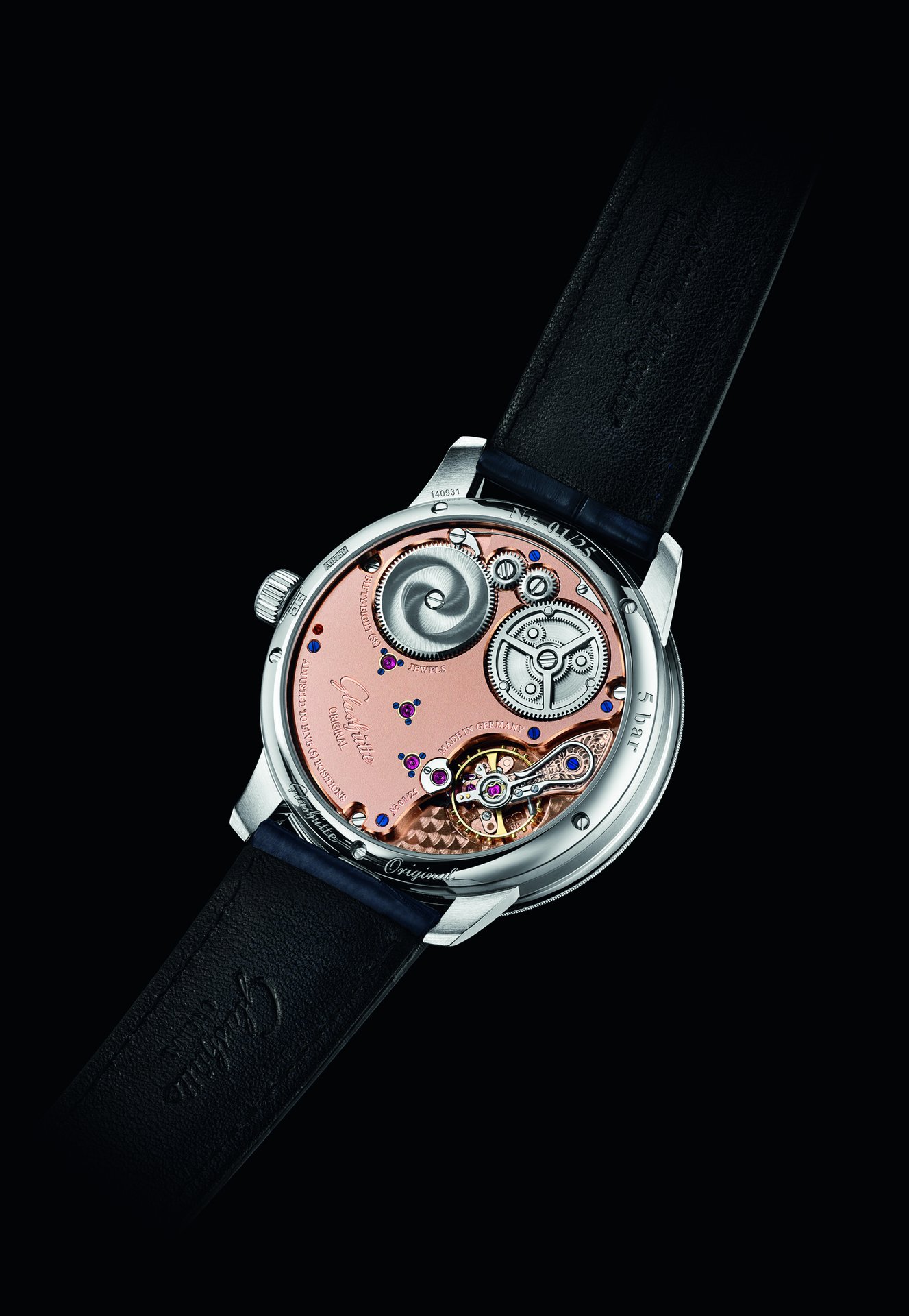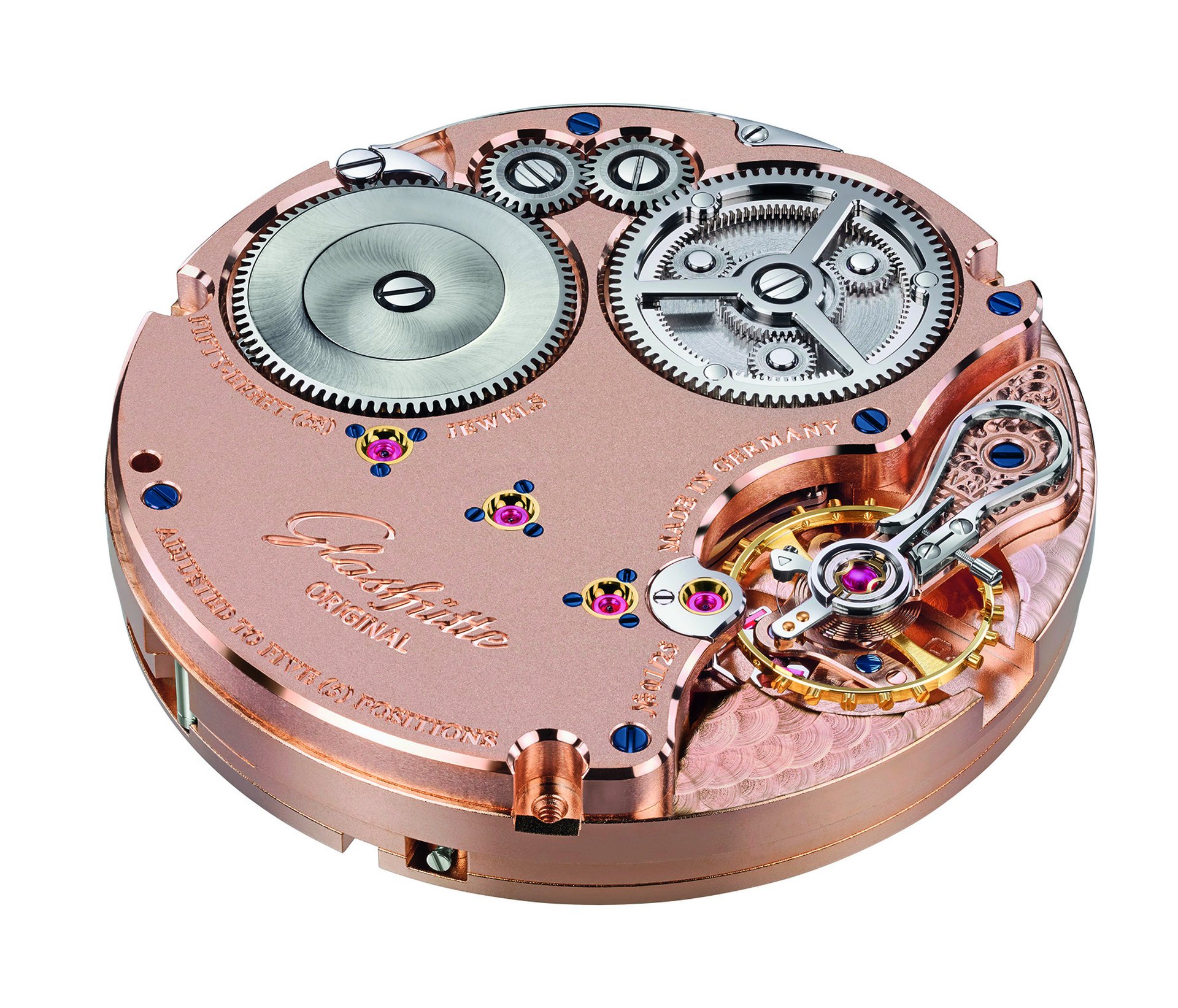 The timepiece is powered by the finely finished Glashütte Original Calibre 58-03 manual winding movement, whose wheel bridge is also silver plated and subsequently given a galvanic coating in rose gold. The other frame components are also coated entirely in galvanic rose gold.