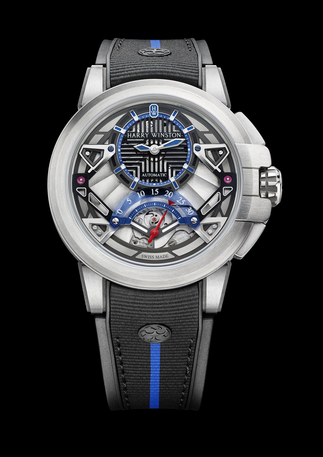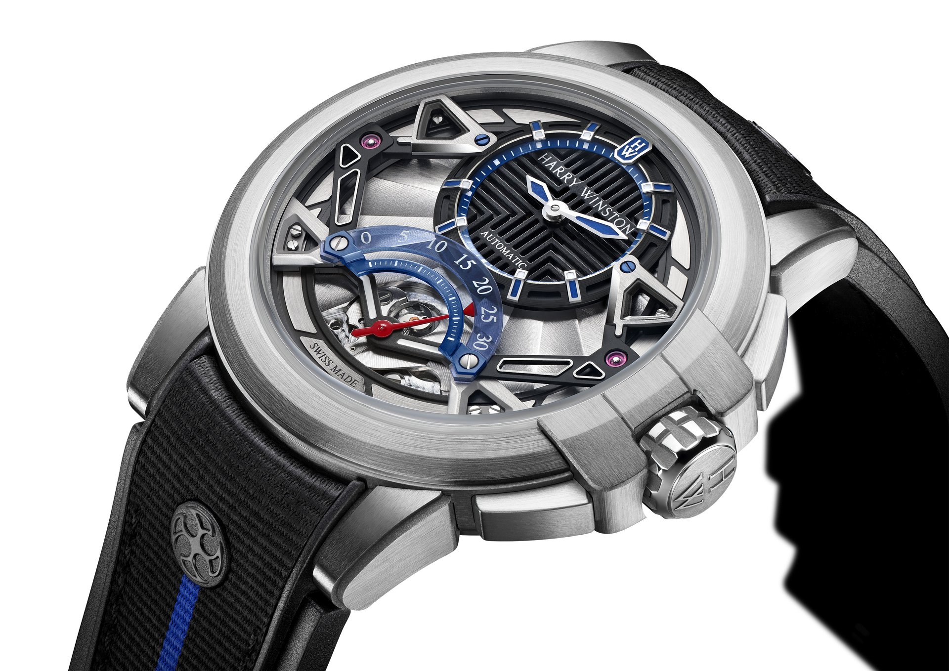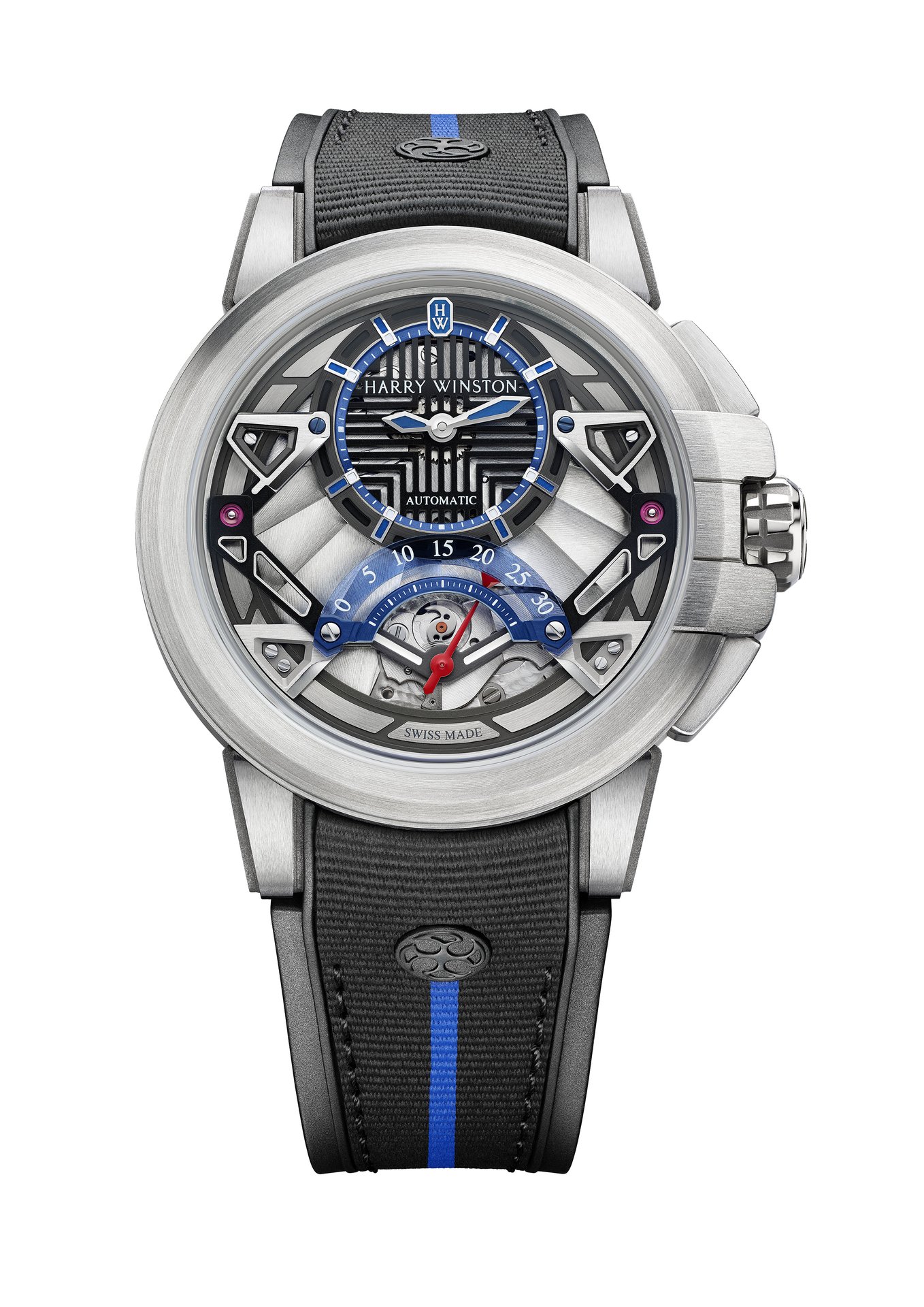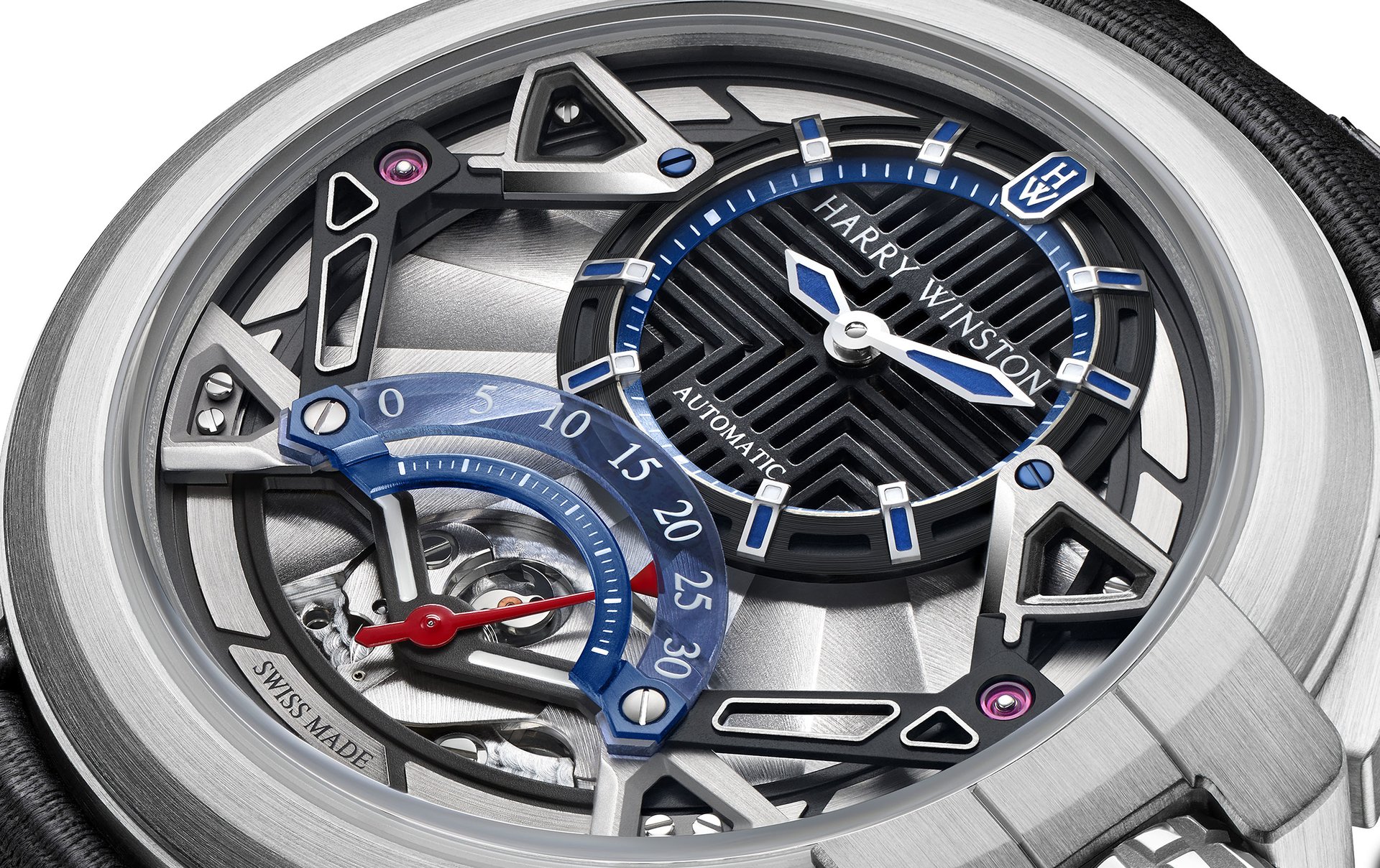 Harry Winston blue is used for the hands and indexes located in the excentered counter at noon and for the seconds arch at 120 degrees, graduated from 0 to 30 seconds. Red is used for the seconds hand and grey dominates the remainder of the dial, as black accents emphasize the dynamic details and levels. Black appears in the grid of the excentered dial, which is revealed in a new light. The fresh design features horizontal and vertical segments that work together to create a linear picture.