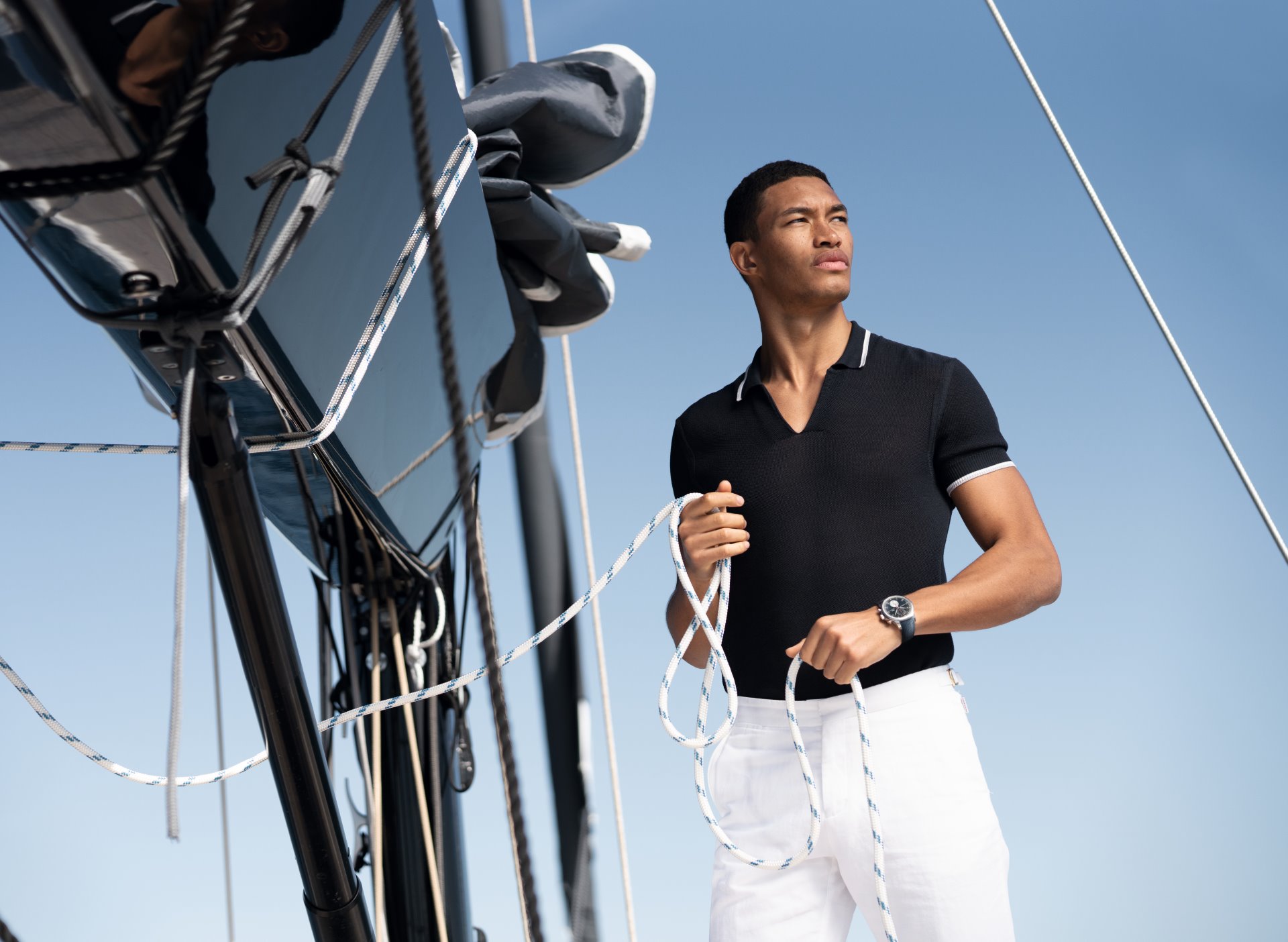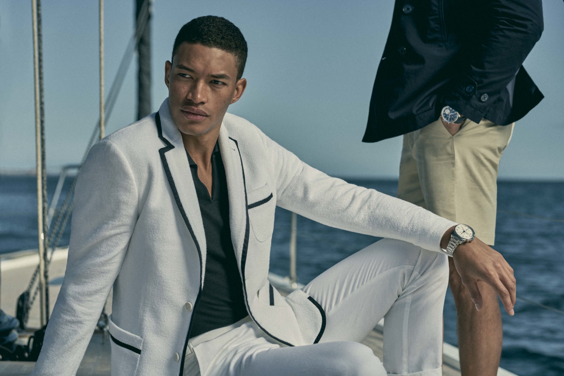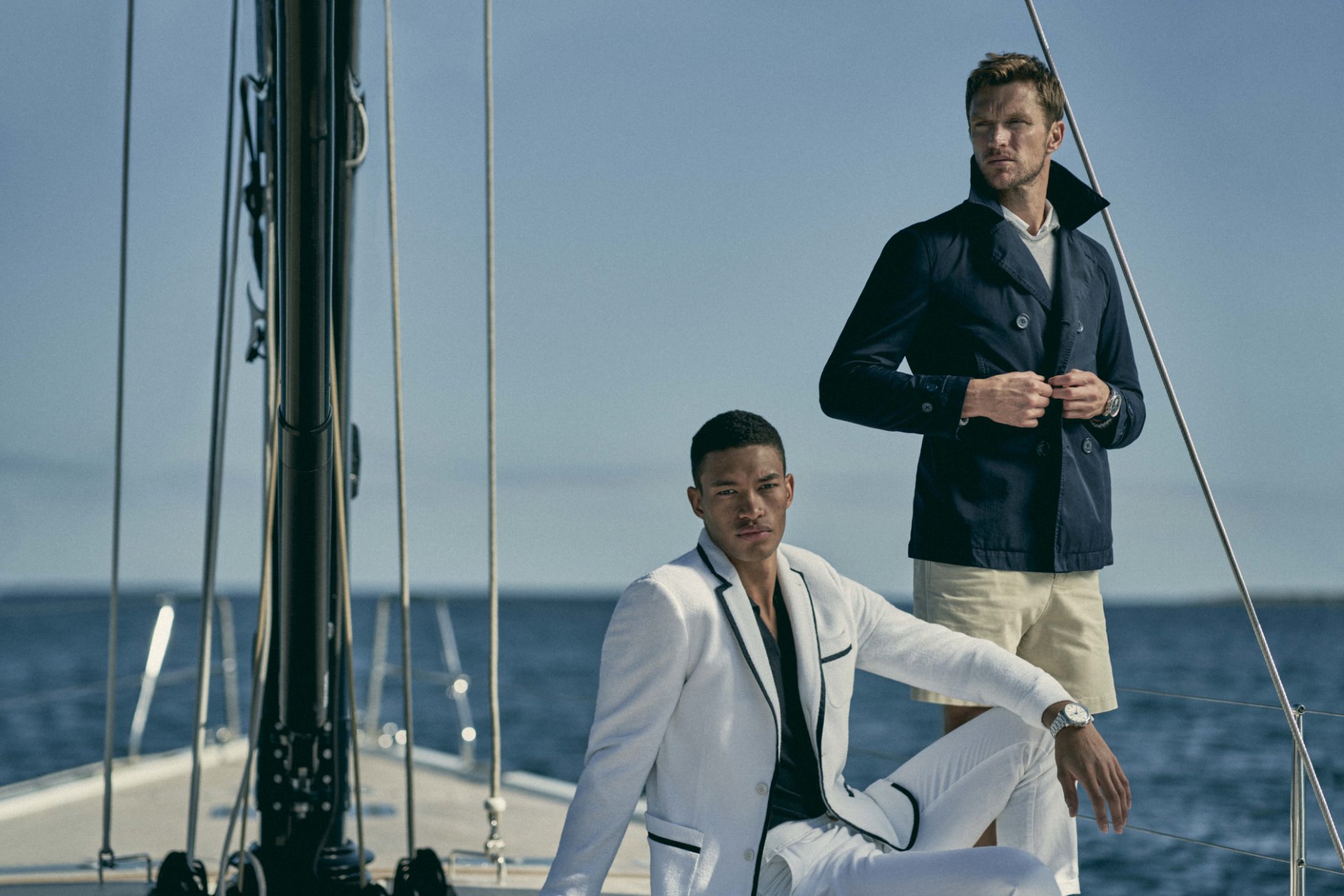 The collection includes a white towelling blazer with blue piping and a cotton/silk knitted polo. A highlight in the collection is a photographic swim short with signature side fasteners, depicting a Solaris 55 sailing yacht in front of Porto Rotondo in Sardinia. This design celebrates the recently announced partnership with IWC and Italian luxury yacht brand Solaris.