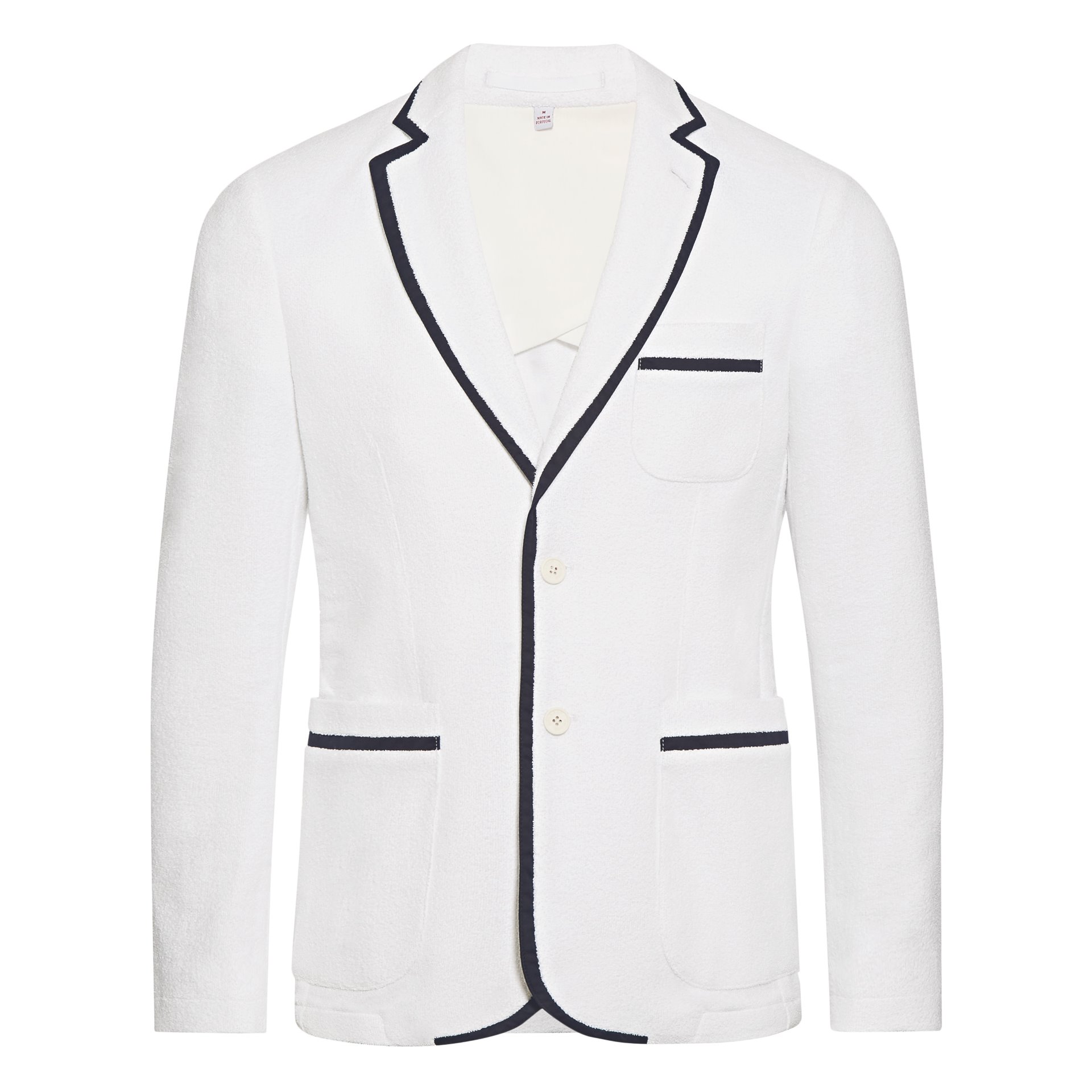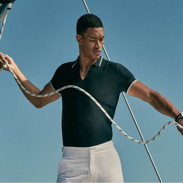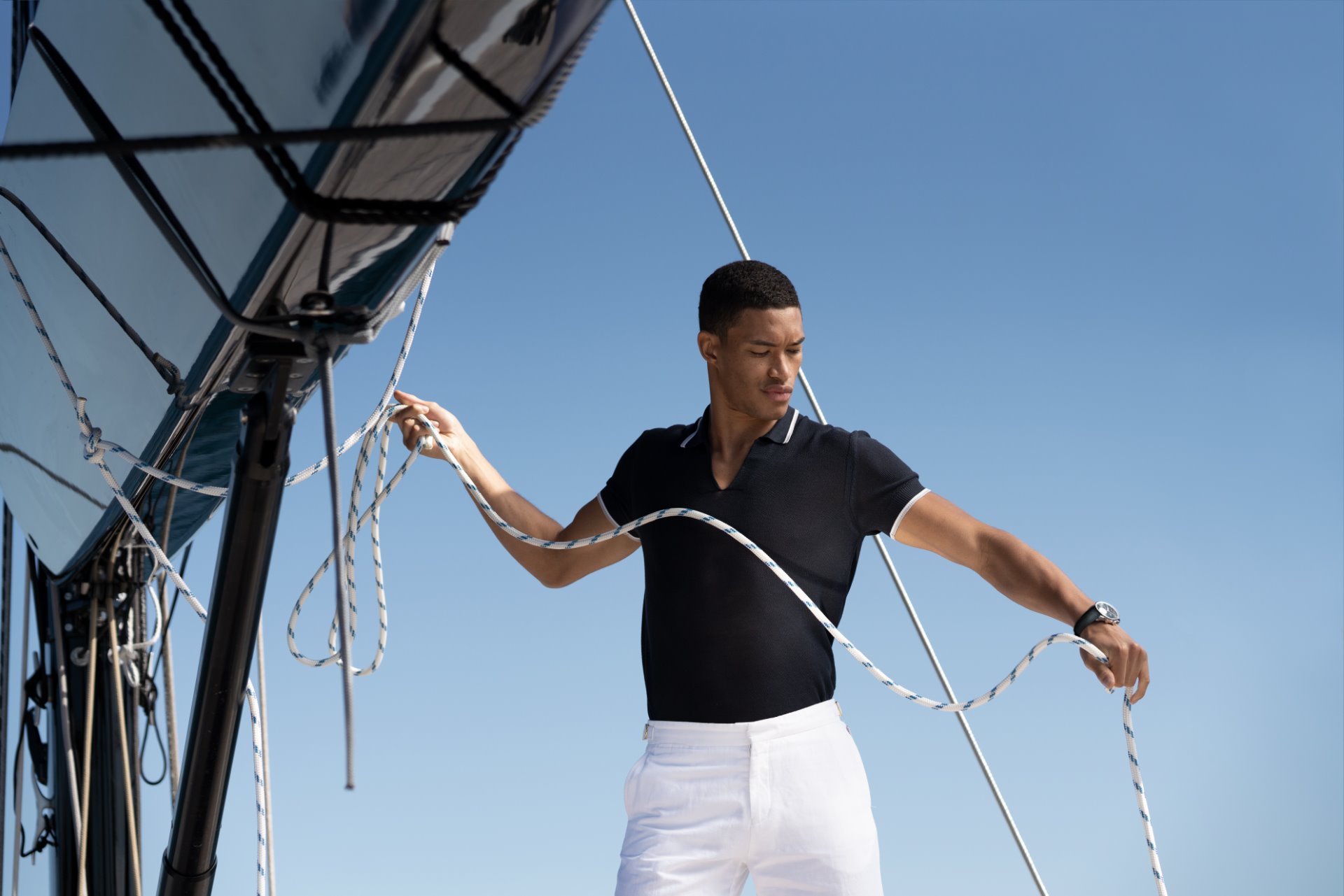 The collection includes a white towelling blazer with blue piping and a cotton/silk knitted polo. A highlight in the collection is a photographic swim short with signature side fasteners, depicting a Solaris 55 sailing yacht in front of Porto Rotondo in Sardinia. This design celebrates the recently announced partnership with IWC and Italian luxury yacht brand Solaris.