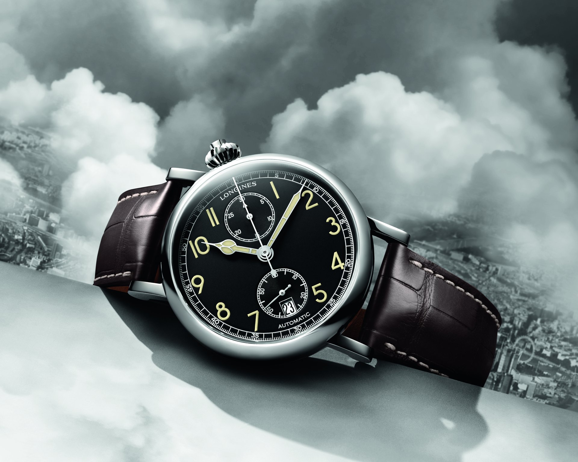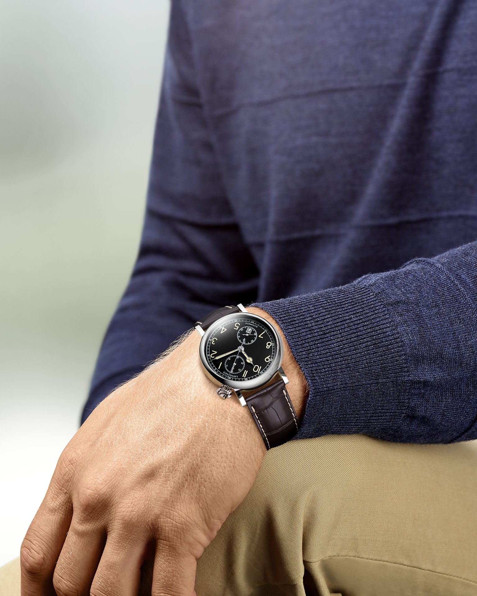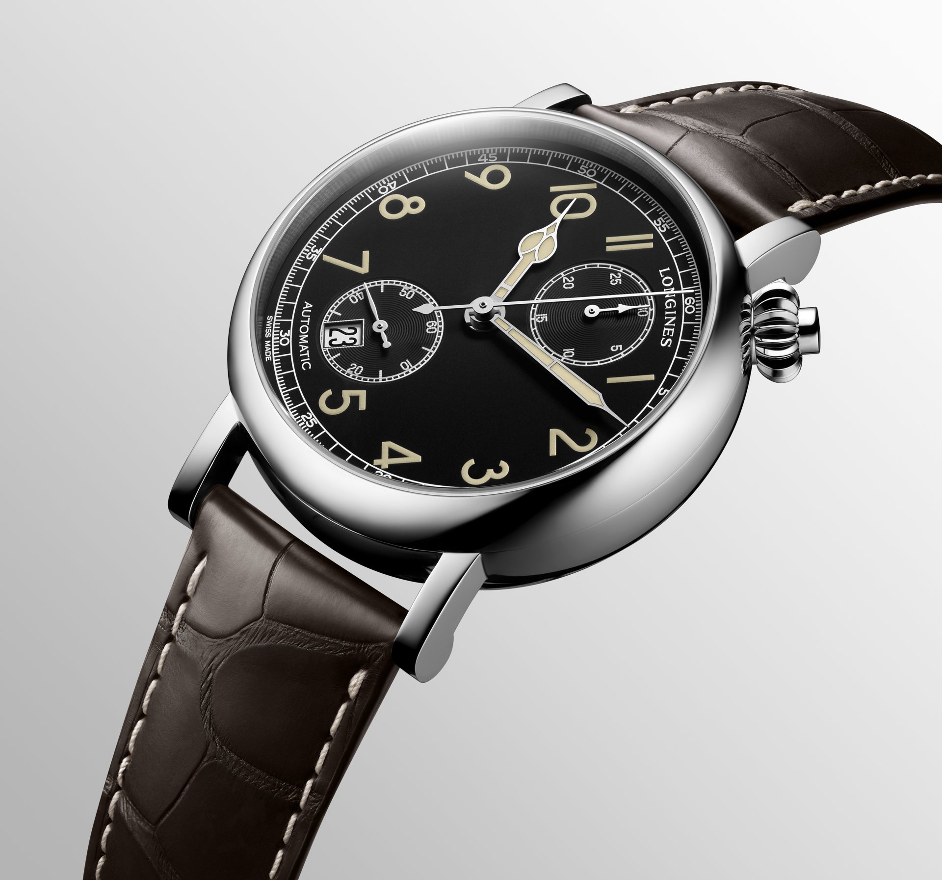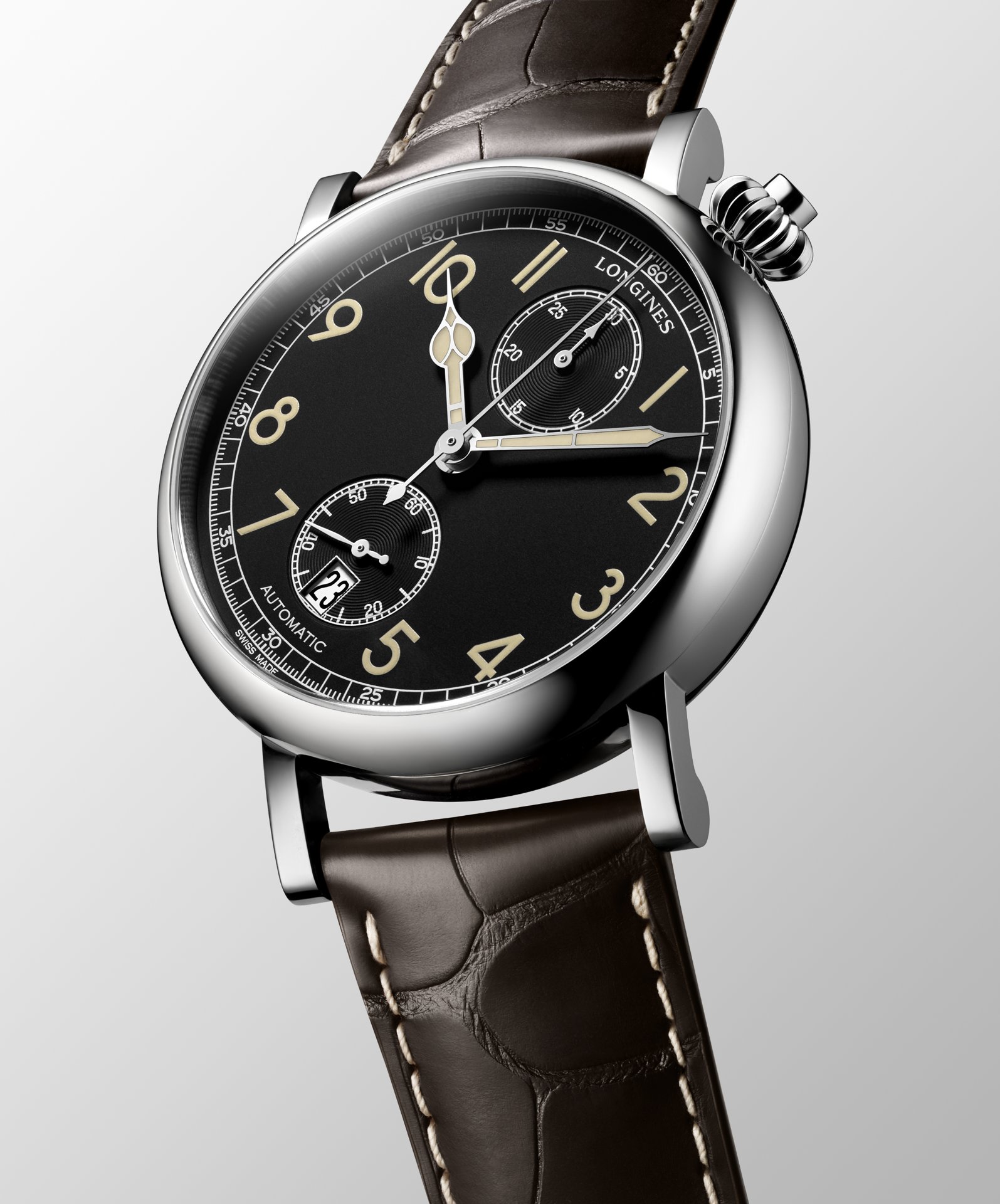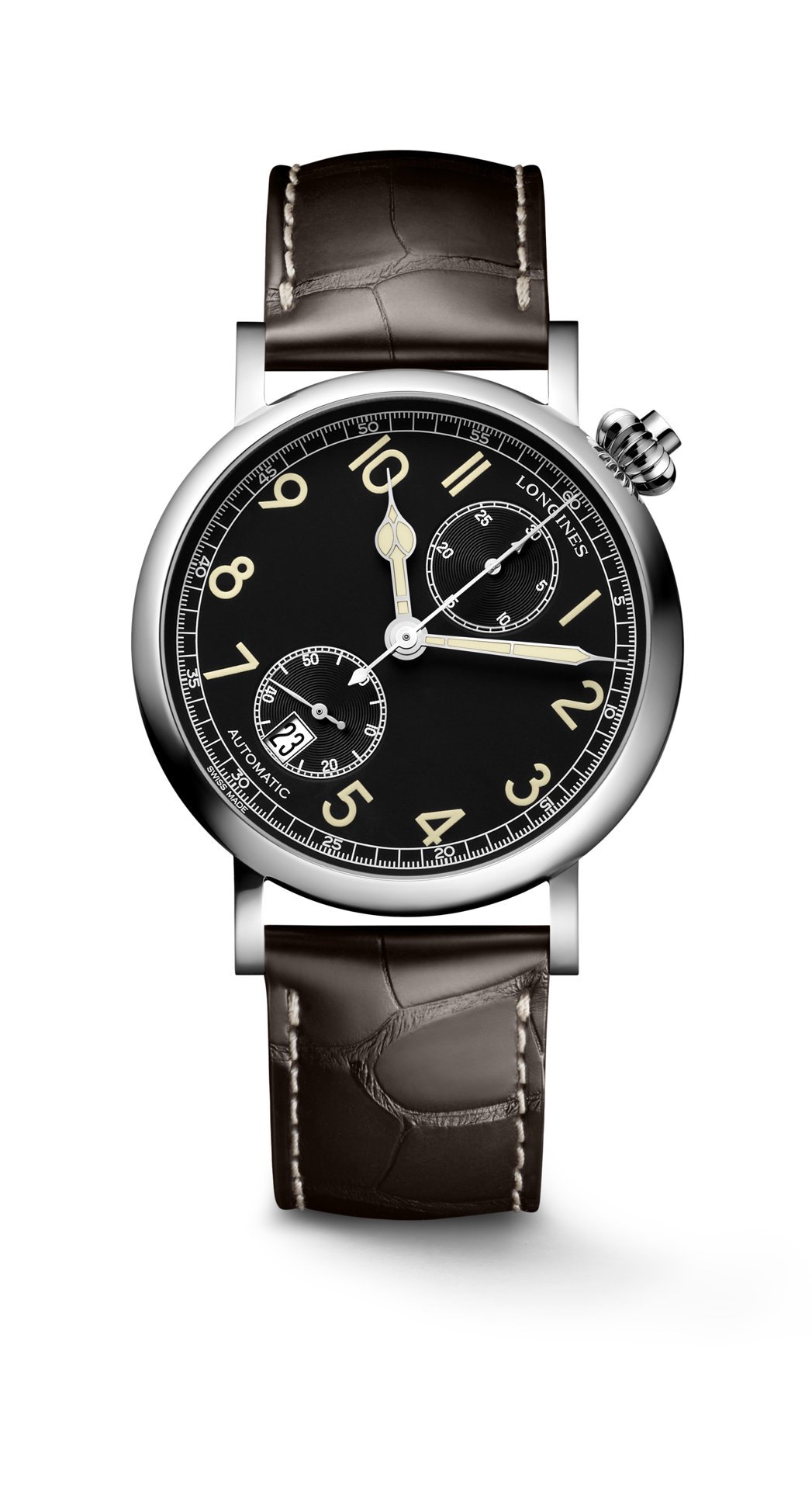 Mounted on a brown leather strap, this new model of The Longines Avigation Watch Type A-7 1935 complements a white lacquered dial version launched in 2016.