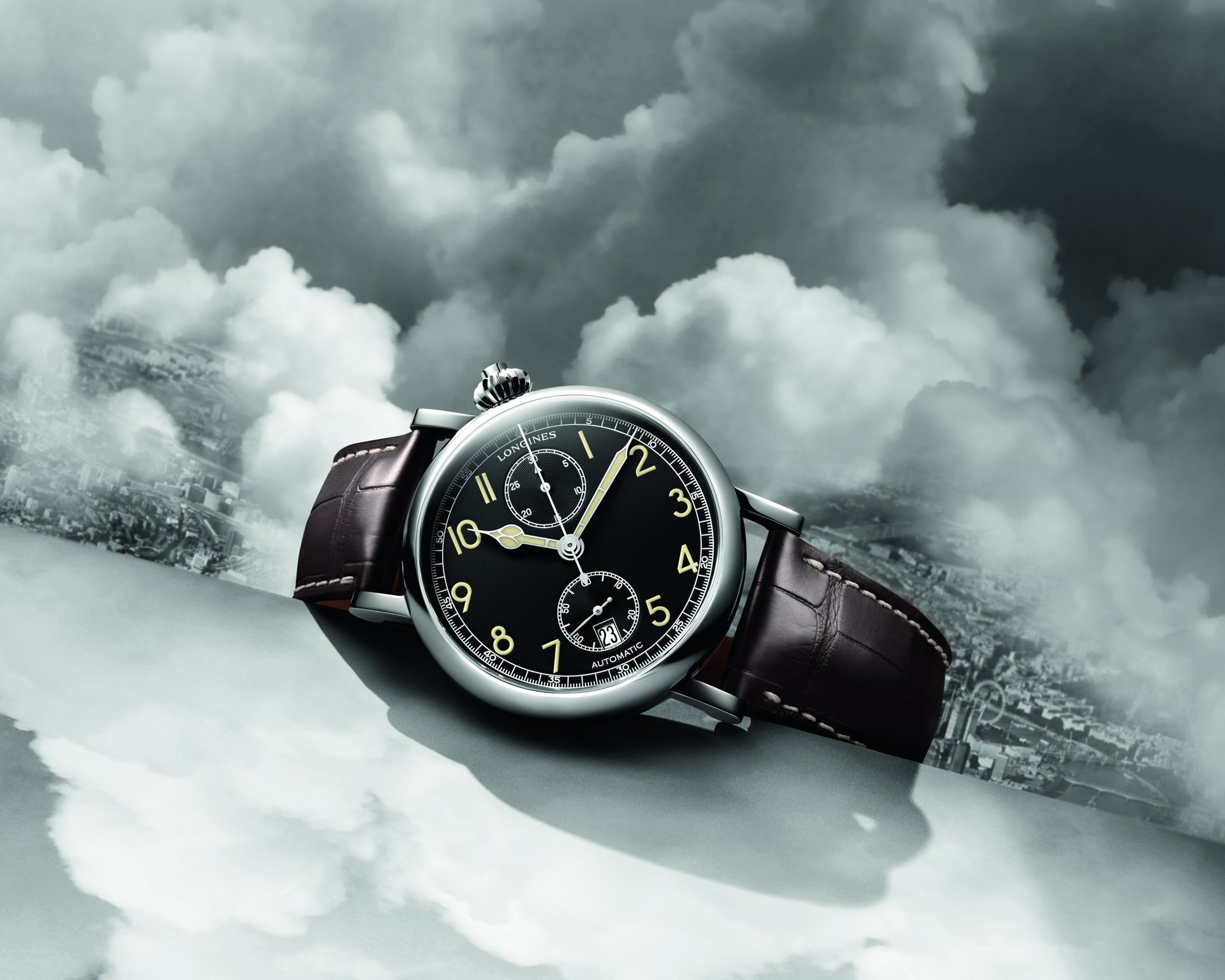 Faithful to the original model, the new variation of The Longines Avigation Watch Type A-7 1935 sets itself apart with its black dial shifted 40° to the right. The particular orientation of the dial allowed pilots to read the indices without having to release the plane’s control yoke.