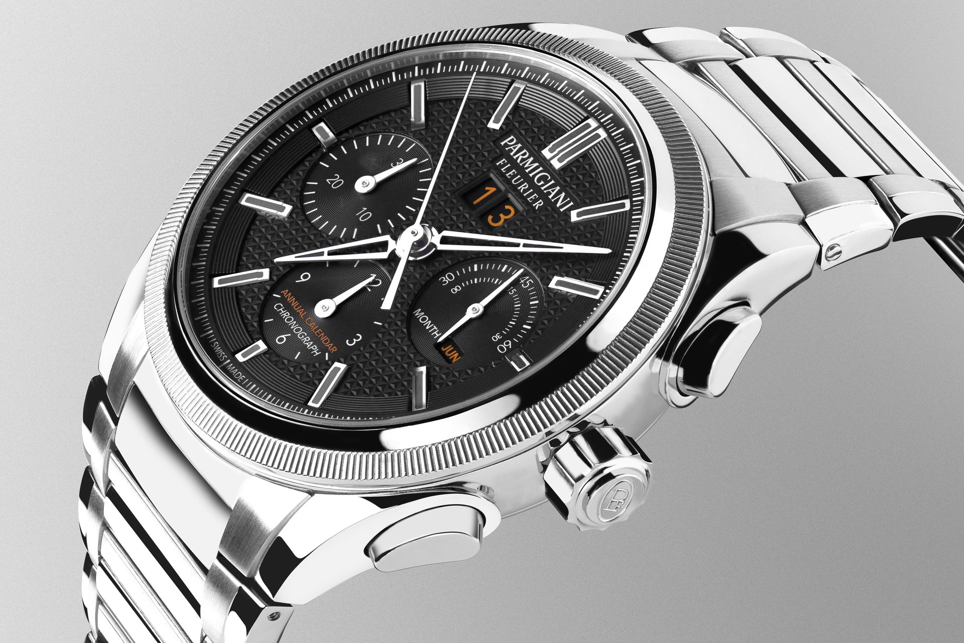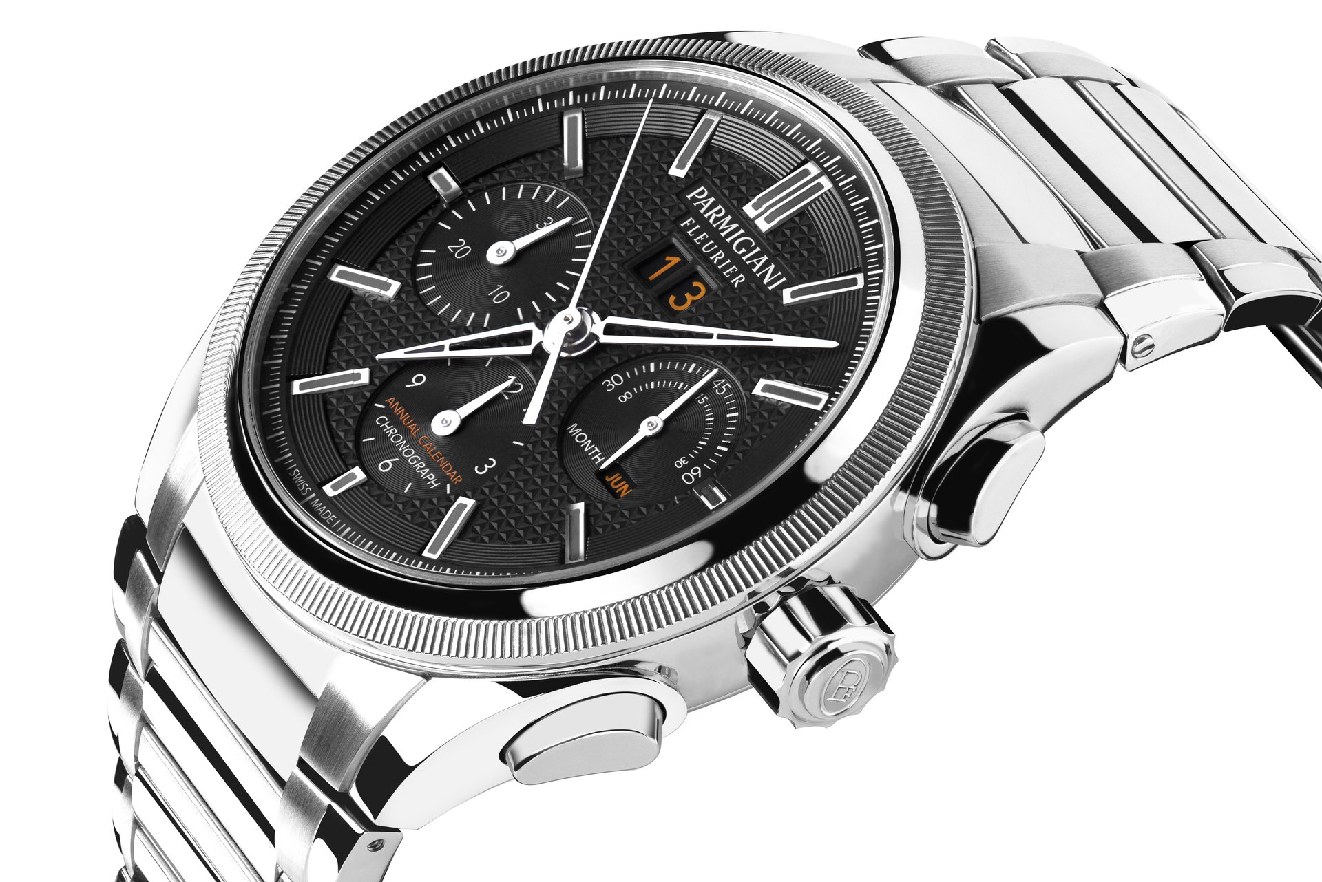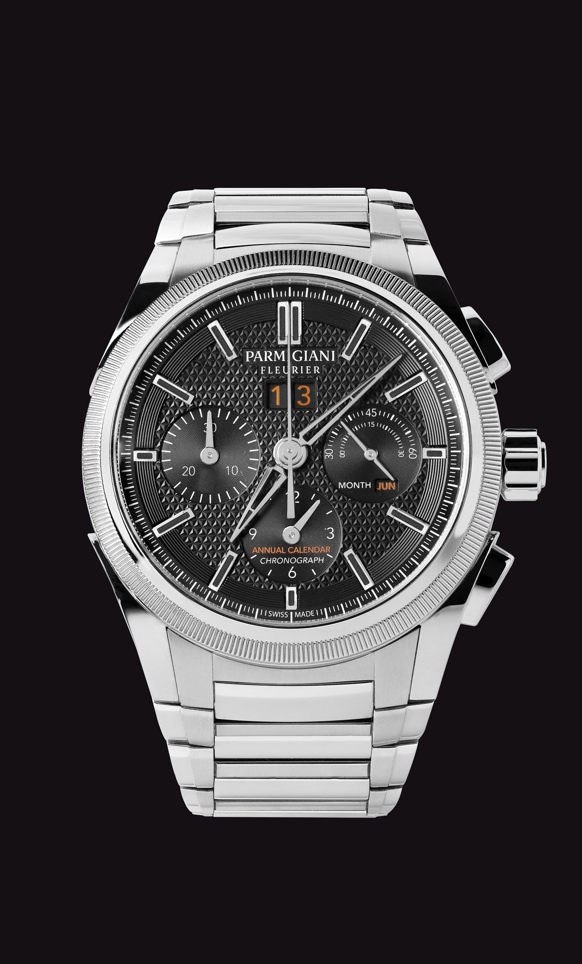 The Tondagraph GT is powered by the PF043 automatic calibre and combines two of watchmaking’s most useful complications- an annual calendar and a chronograph. This is an uncommon combination and once again Parmigiani Fleurier fills a void in the watchmaking world by presenting them together at a level of quality seldom rivalled, and yet, with an exceptional price. The dial displays a wealth of information and remains legible: it has delta-shaped hands with black luminescent coating indicating hours and minutes, a small second, two subdials for the chronograph function, and a big date aperture at 12 o’clock. To draw attention to the annual calendar function, the date and month are displayed in vibrant orange colour. This impressive watch is water-resistant to 100m, has a screw-down crown, a 48-hour power reserve, and is finely finished with Côtes de Genève stripes visible through the open caseback. The Tondagraph GT is limited to 200 pieces.