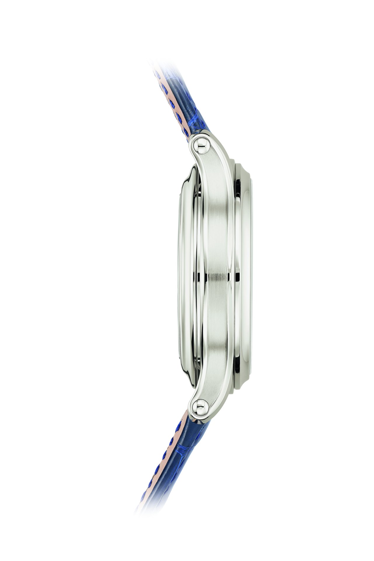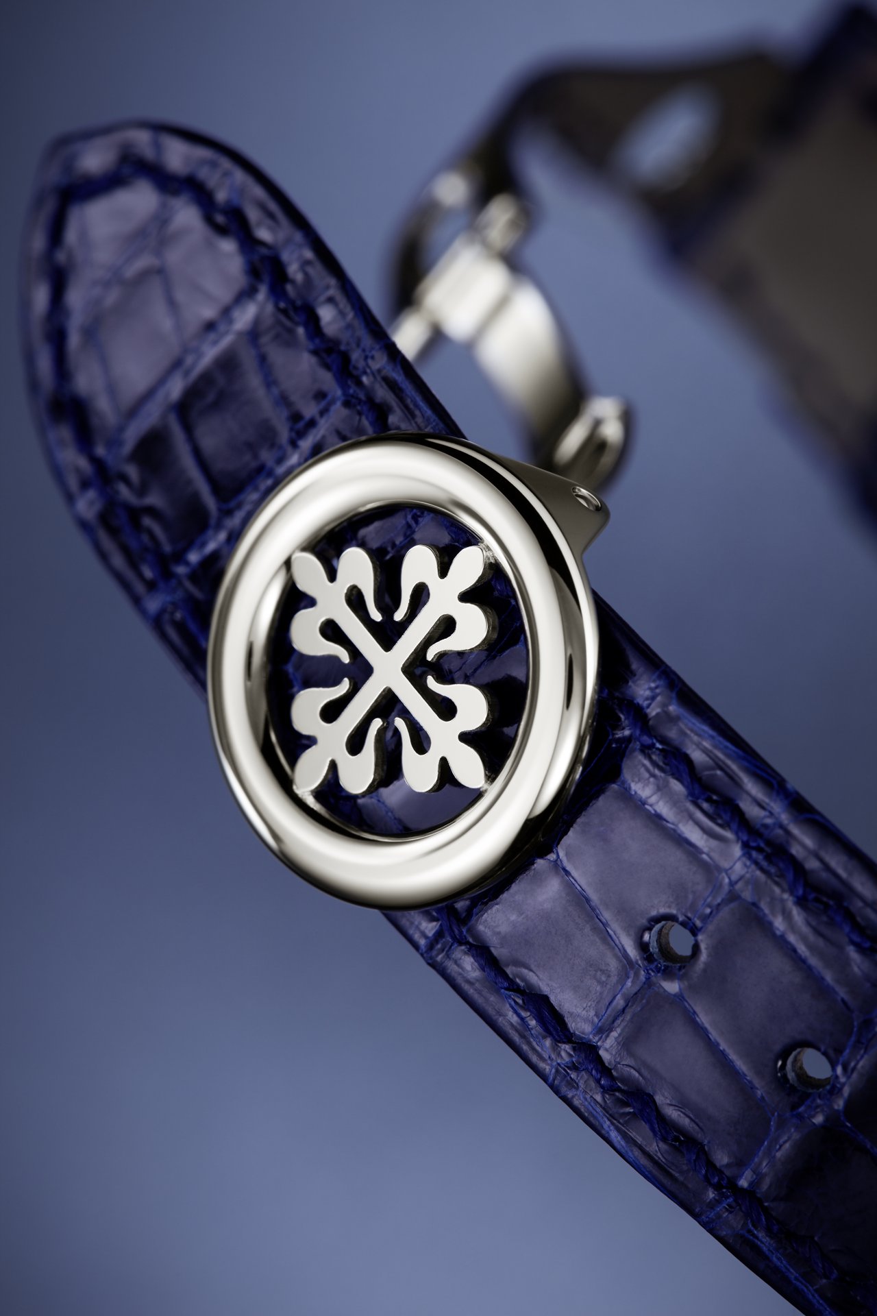 The elegant polished platinum case with a concave bezel and satin-finished flank recesses is worn on an alligator strap in shiny night blue secured by a platinum fold-over clasp.