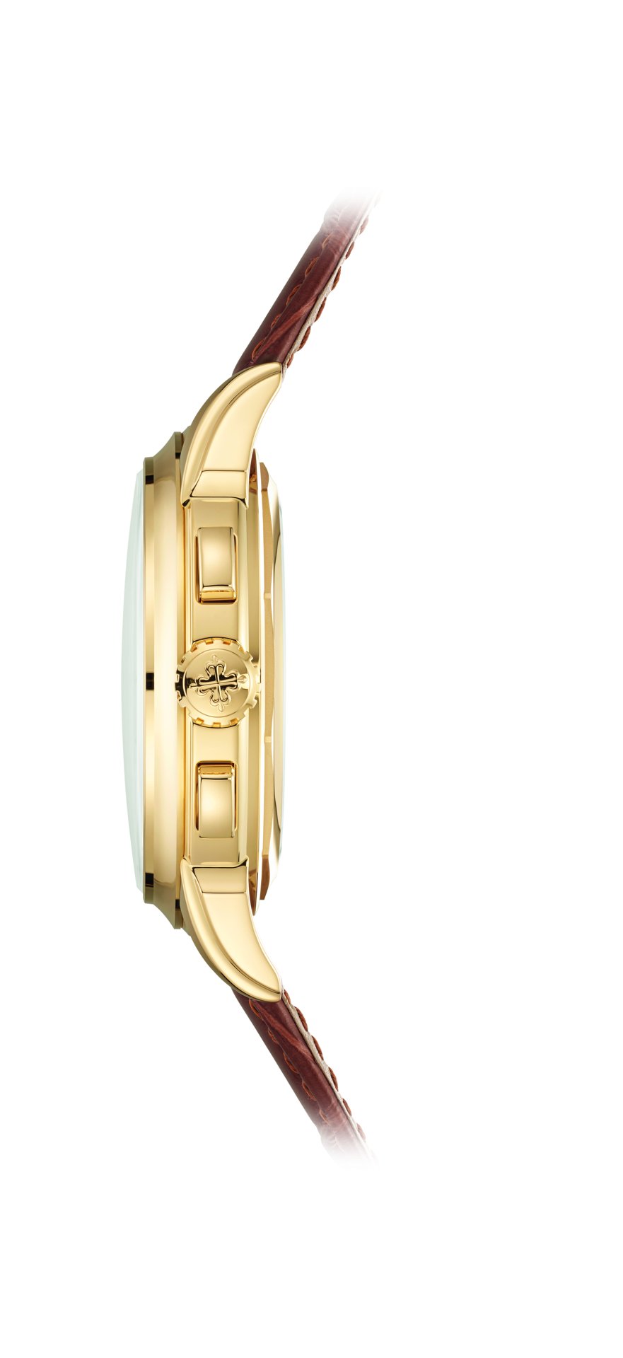The new Ref. 5270J-001 is worn on a hand-stitched matt chocolate brown alligator strap with large square scales secured with a yellow-gold fold-over clasp. It joins the previous platinum and rose-gold models to accommodate the individual preferences of aficionados of Patek Philippe grand complications.