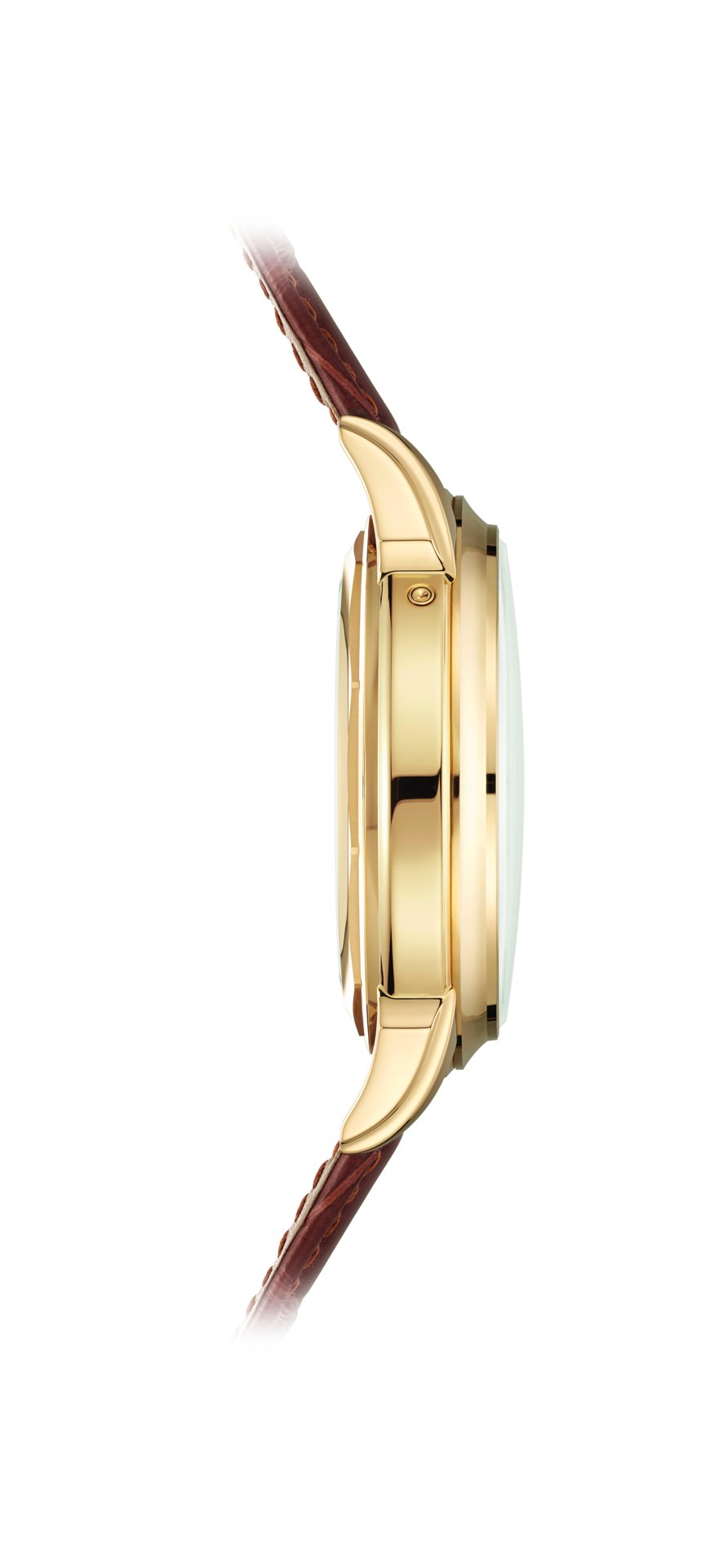 The silvery opaline dial with applied baton indexes and leaf-shaped hands in yellow gold assures excellent legibility. The displays of the perpetual calendar are tastefully balanced with an analogue date at 6 o’clock and a double aperture for the day and month at 12 o’clock. They are complemented with two small round apertures for the day/night indicator and the leap year cycle as well as the typical moon-phase window.