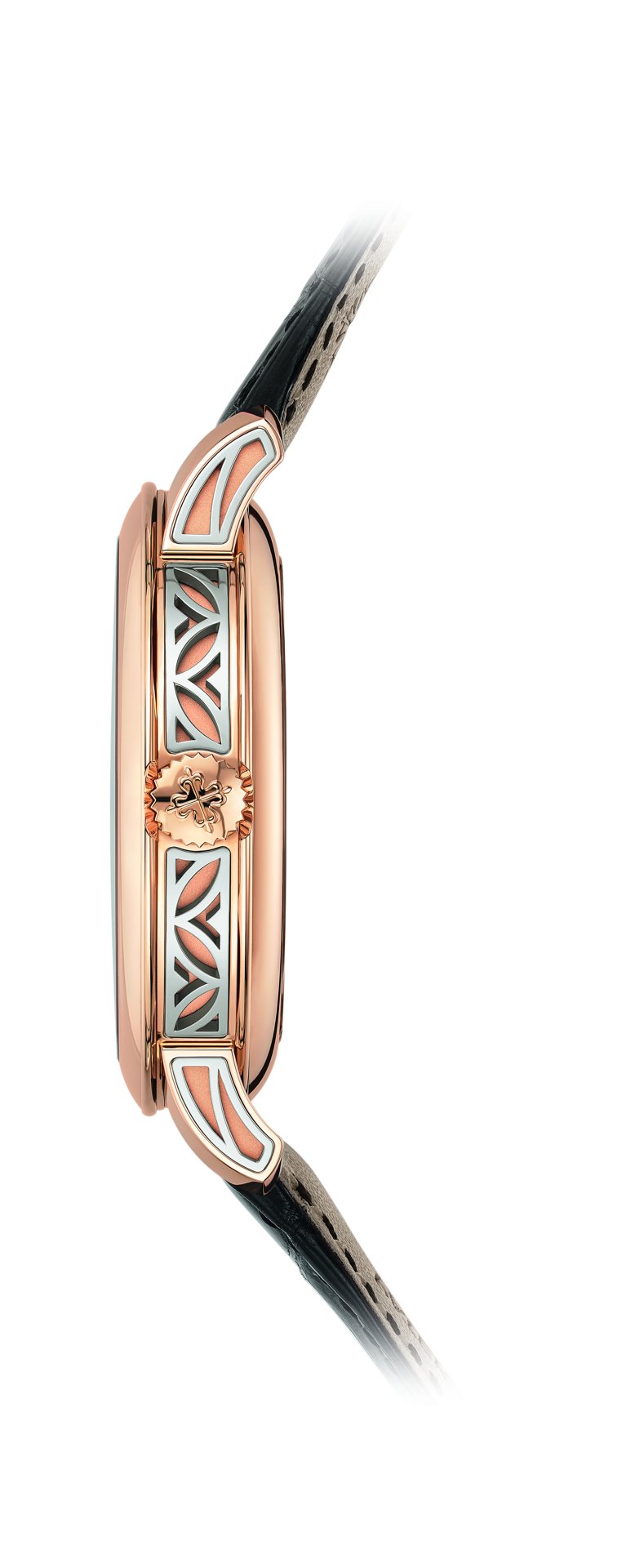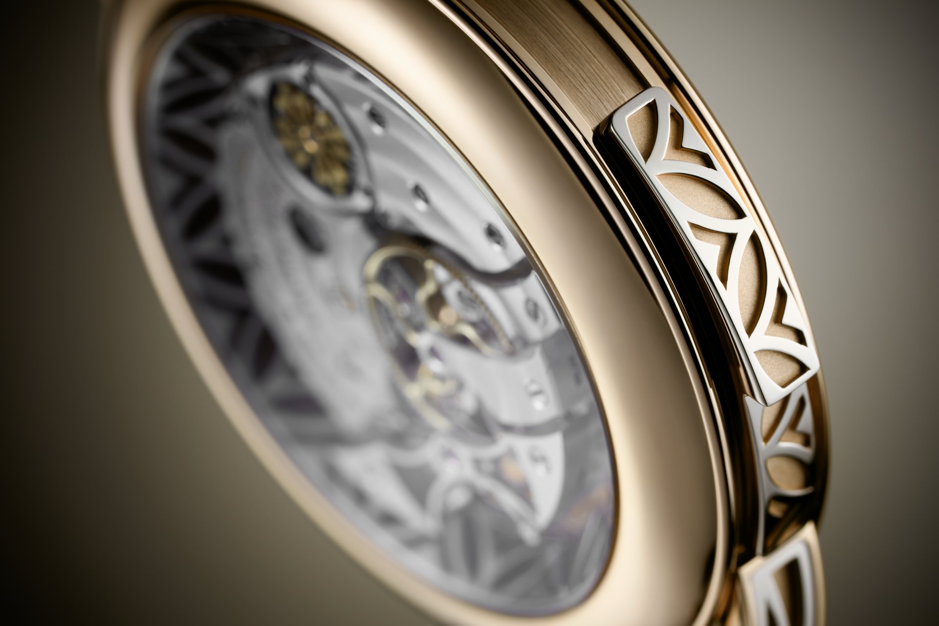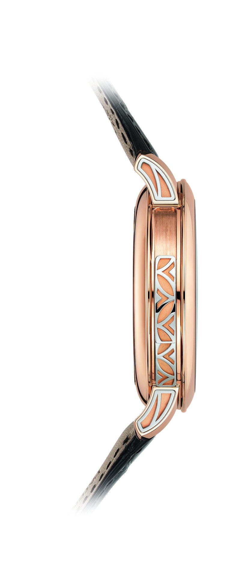 The inimitable rose-gold case sports a wide, cambered and polished bezel as well as white- gold inlays with foliage engravings that grace the caseband and the strap lugs. The white-gold slide in the left-hand case flank that activates the minute repeater features the same motif. The hour circle is a black-lacquered sapphire-crystal rim with powdered rose-gold markers. The movement can be admired through the sapphire-crystal case back and is framed by a white- gold rim. Its open-worked decoration echoes the case inlays and the repeater slide.