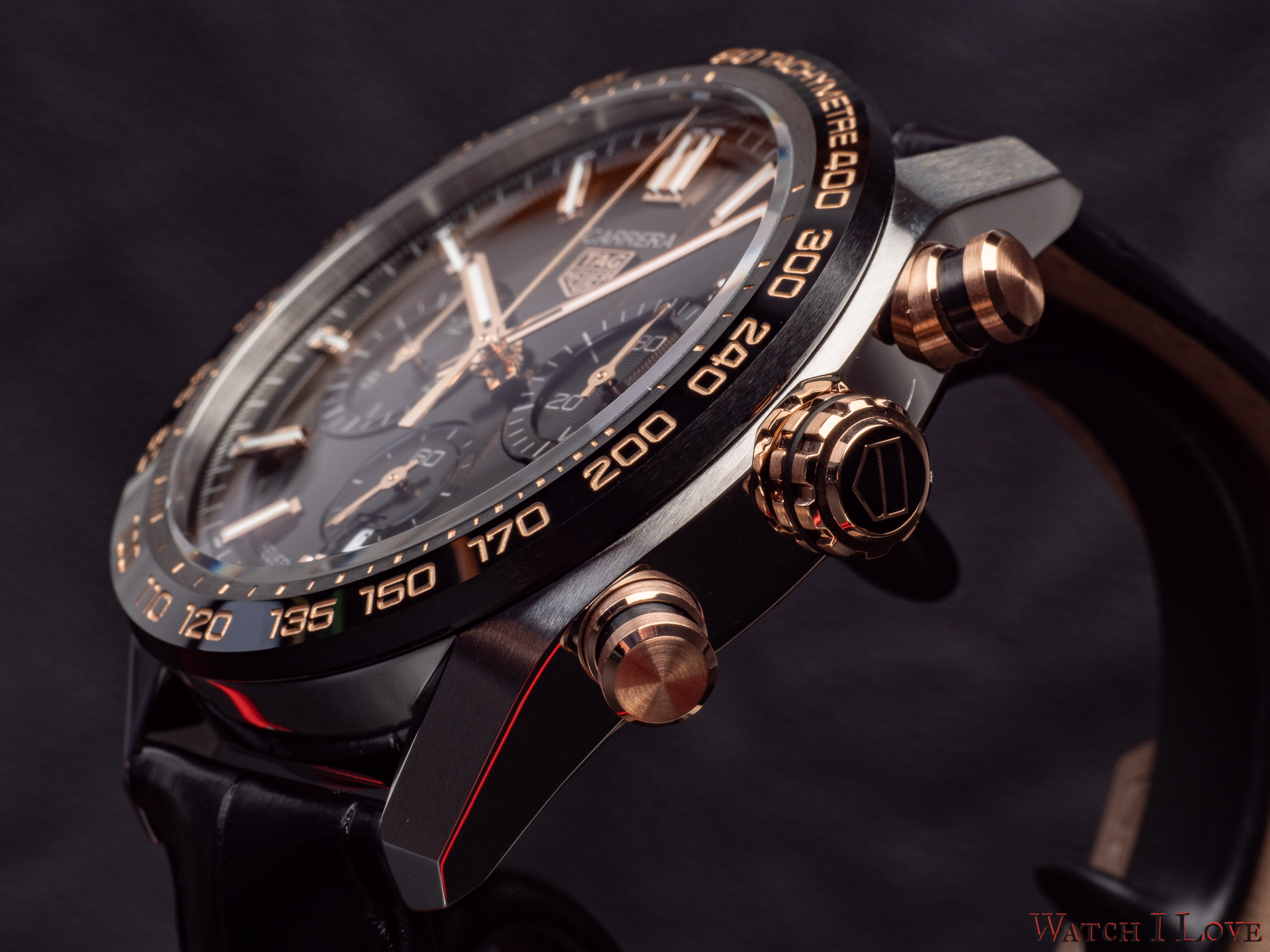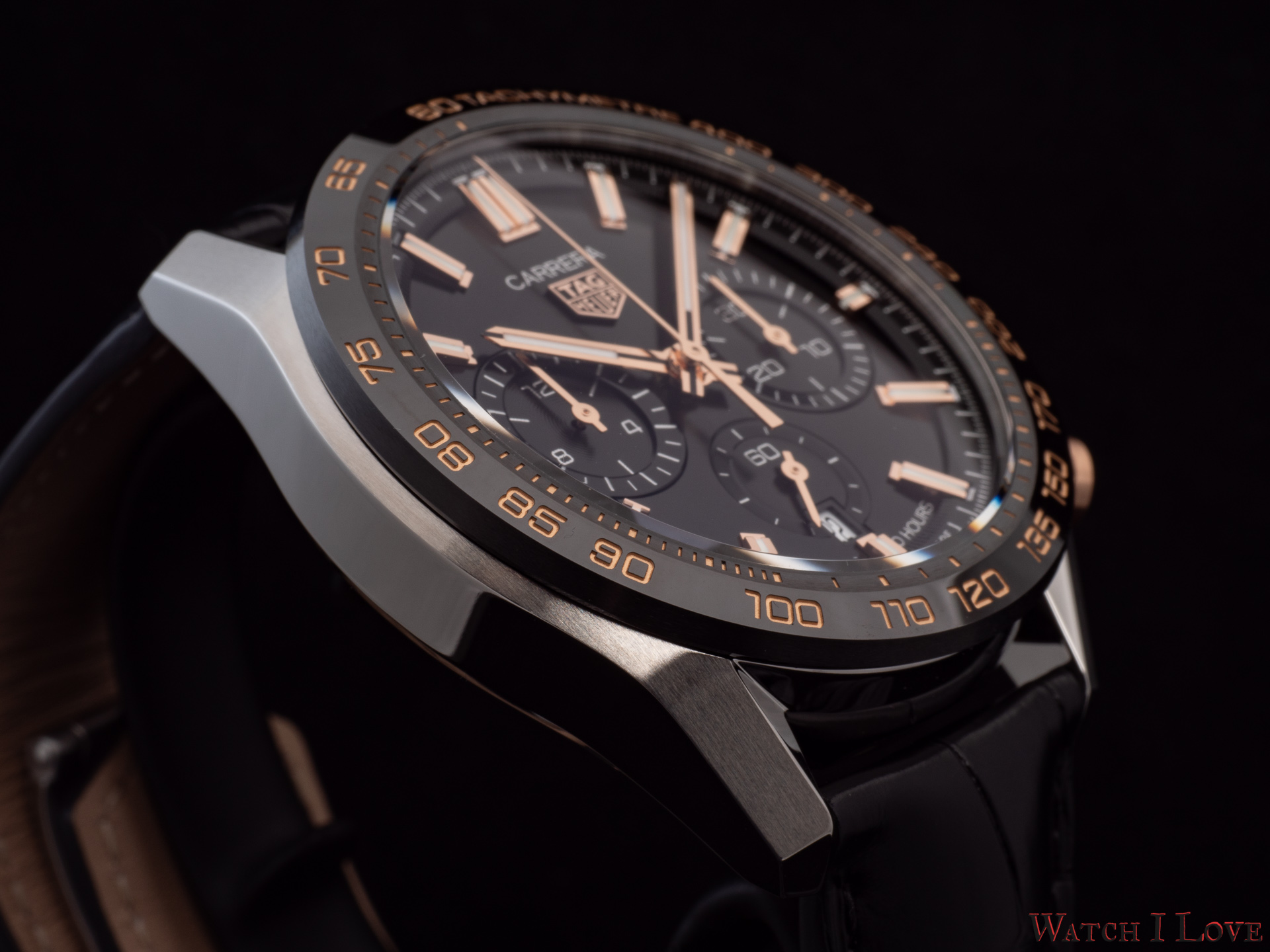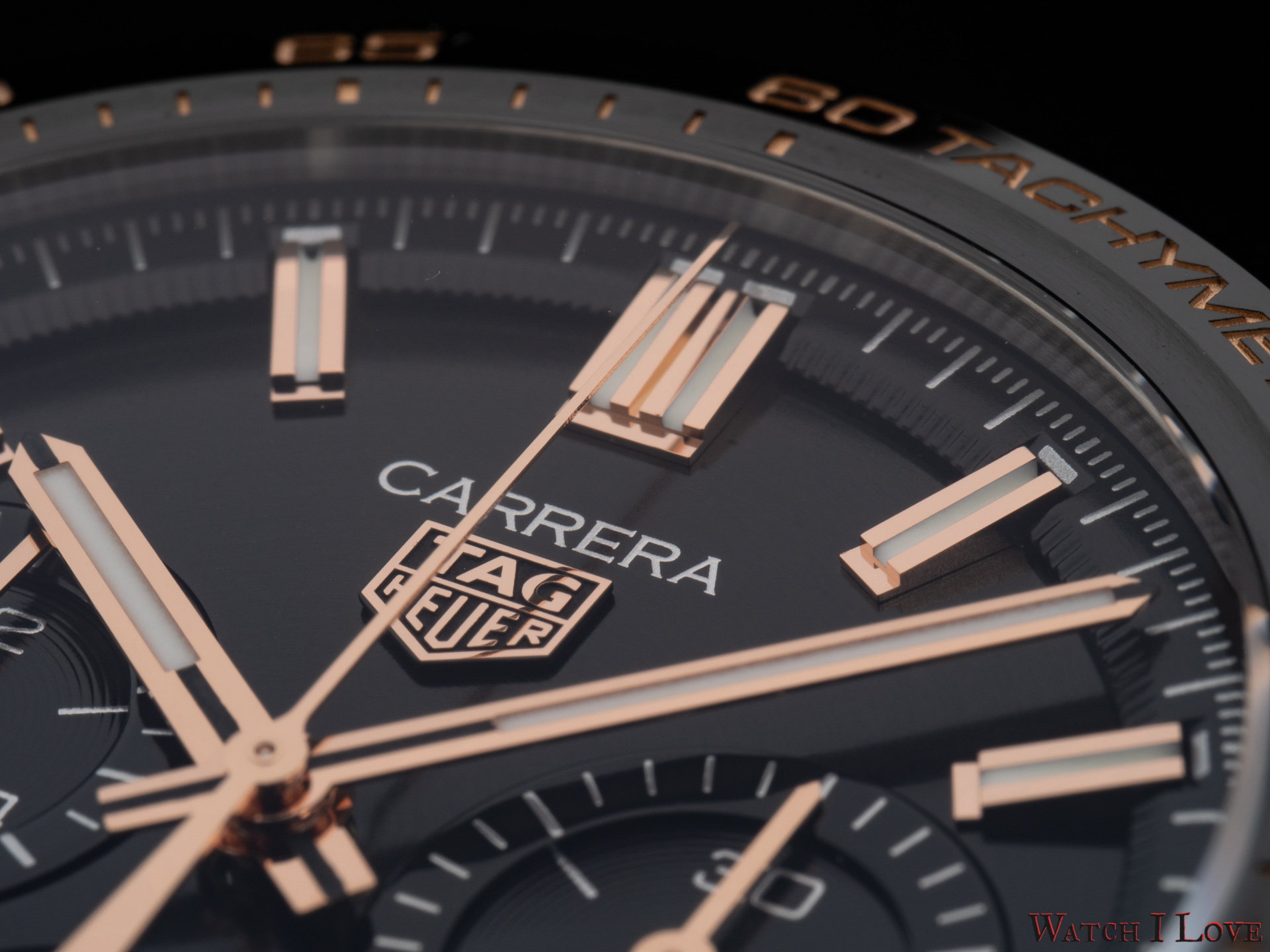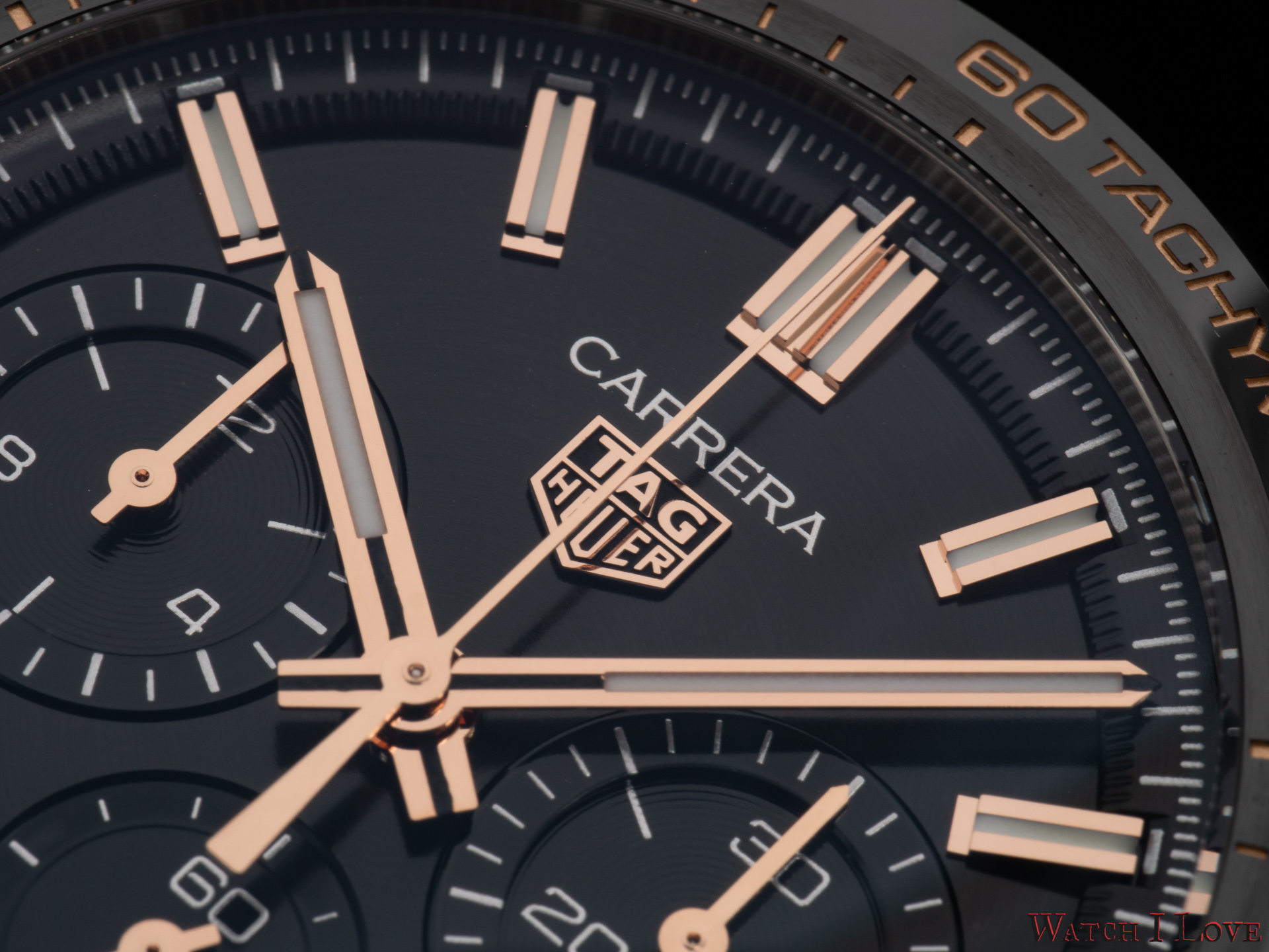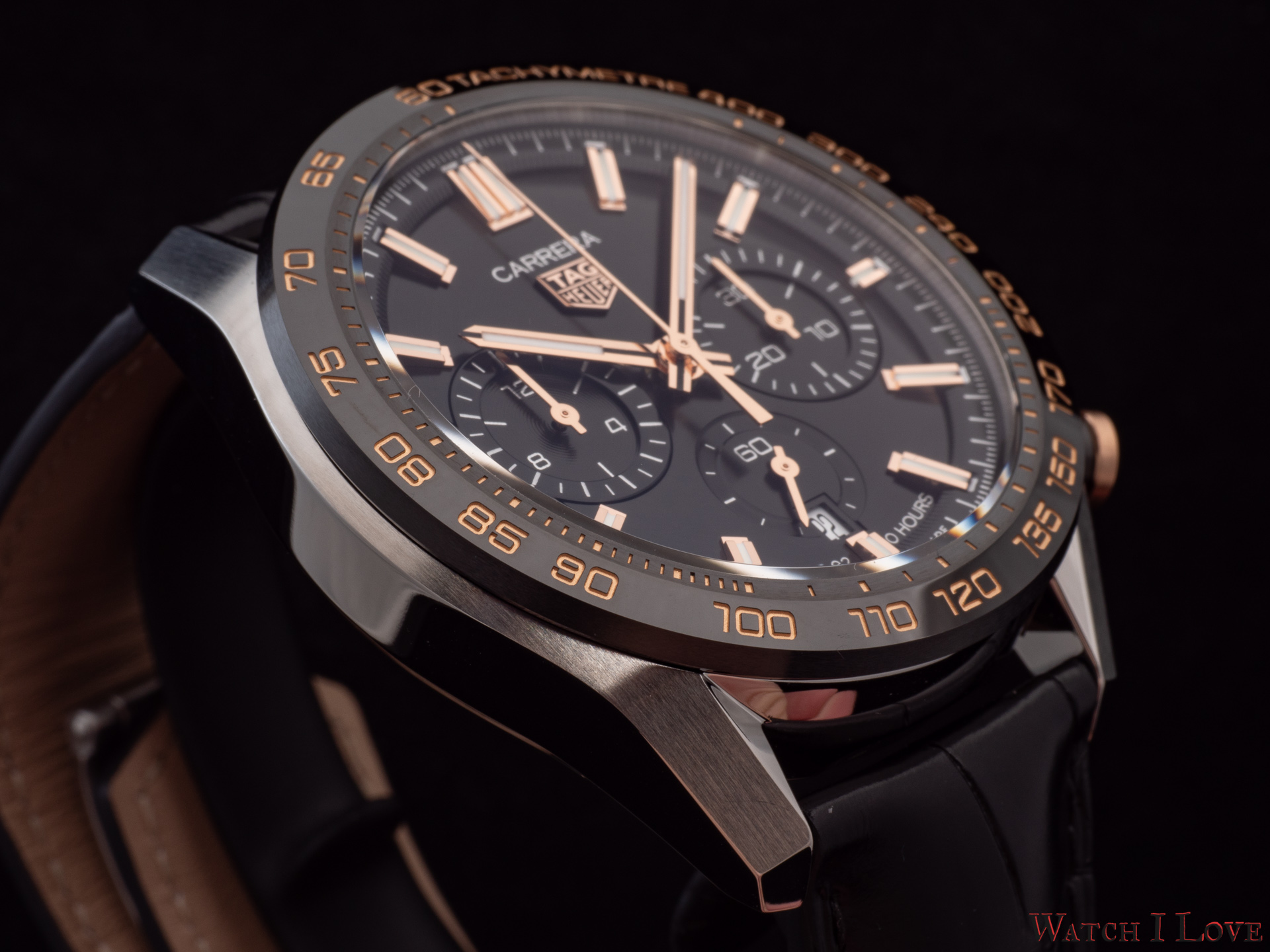 The TAG Heuer logo predominates the upper side of the dial. The 18K 5N rose gold plated piece looks outrageously good on the very fine circular brushed black background of the dial.