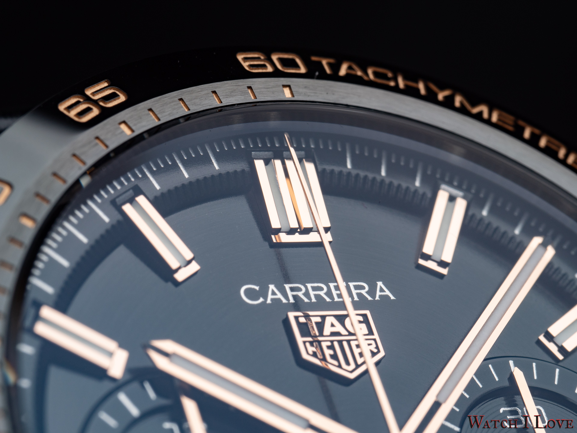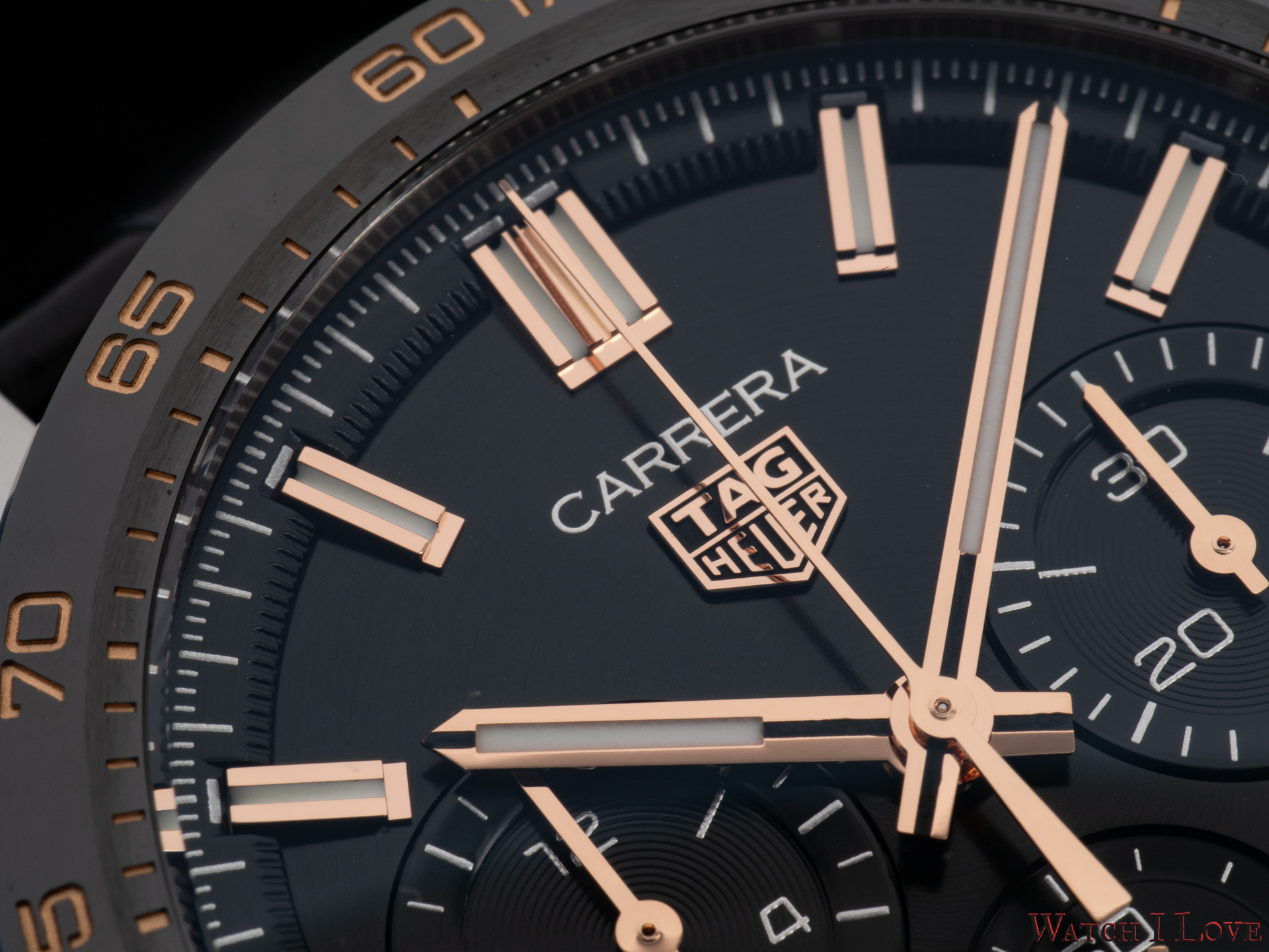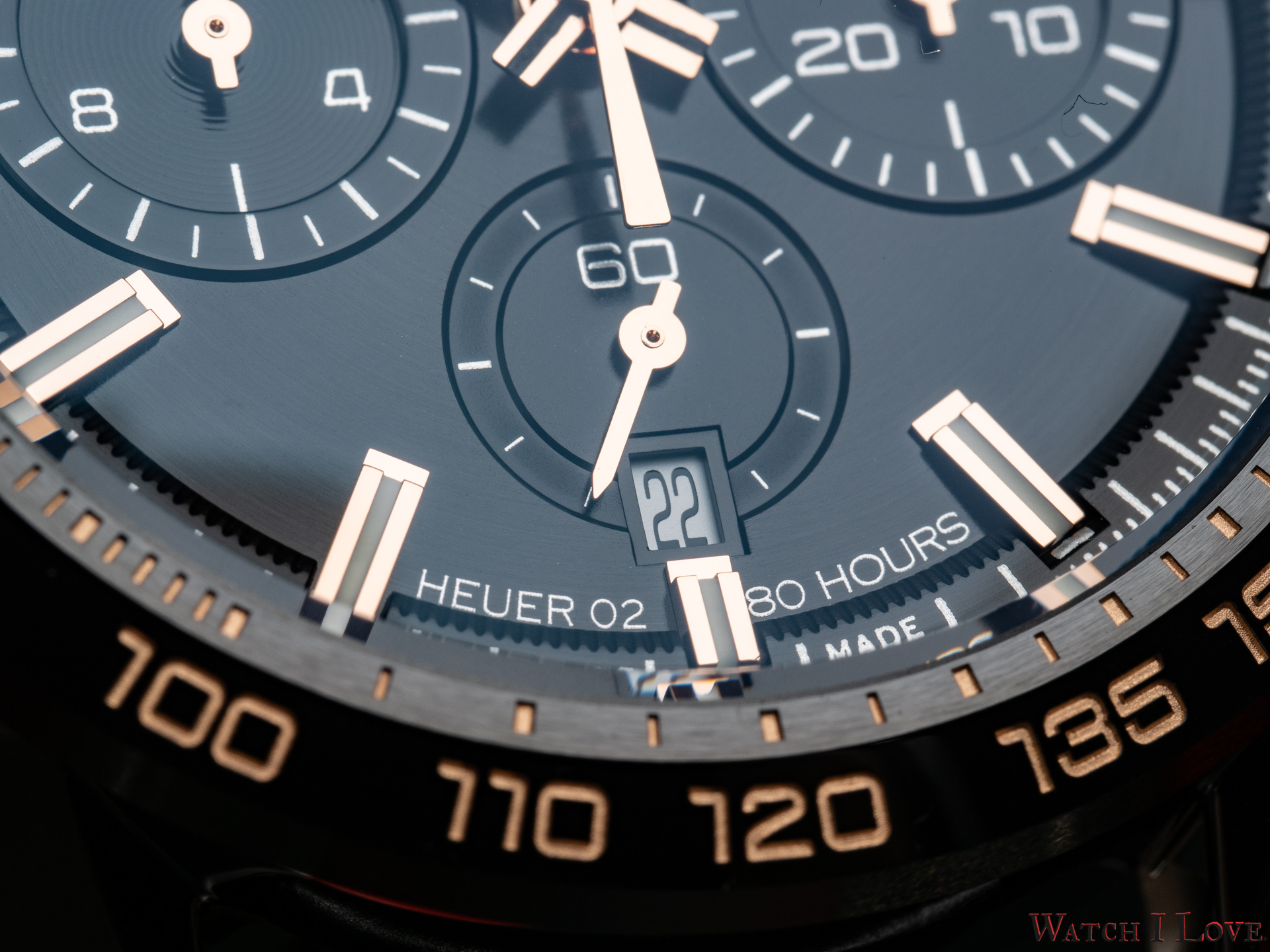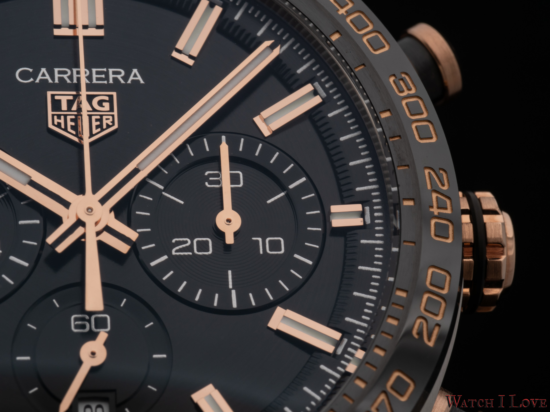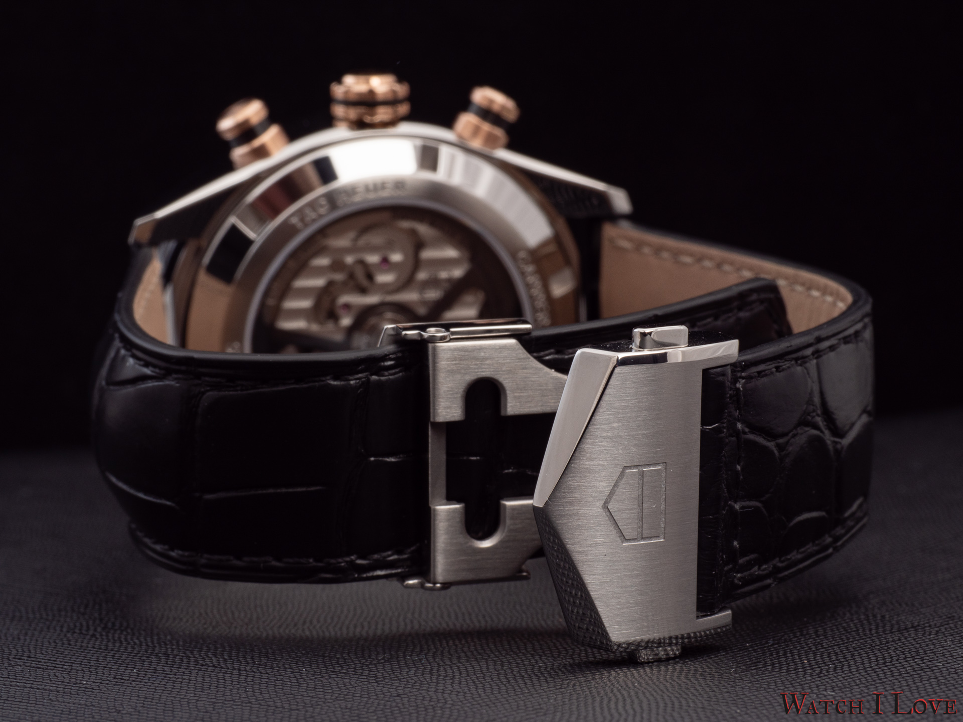 The TAG Heuer logo predominates the upper side of the dial. The 18K 5N rose gold plated piece looks outrageously good on the very fine circular brushed black background of the dial.