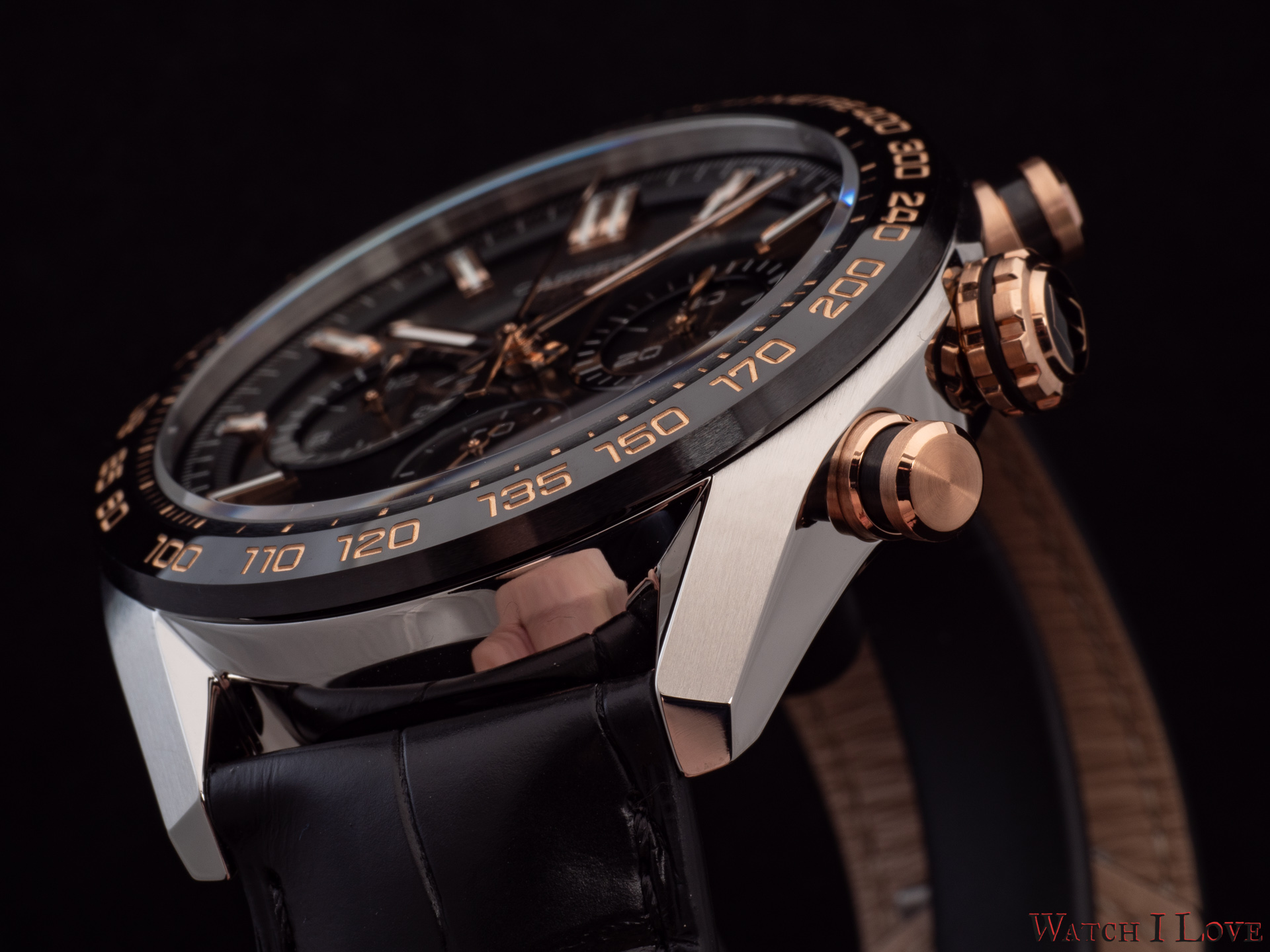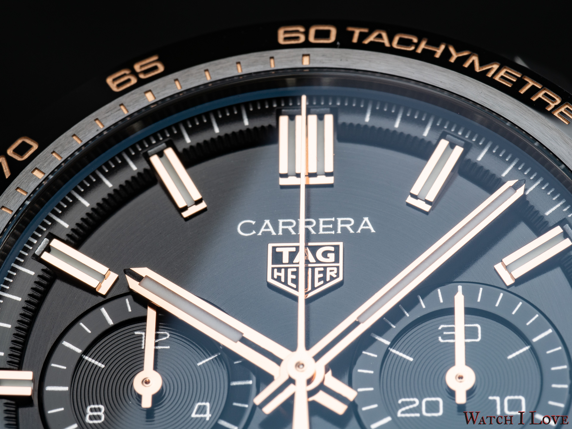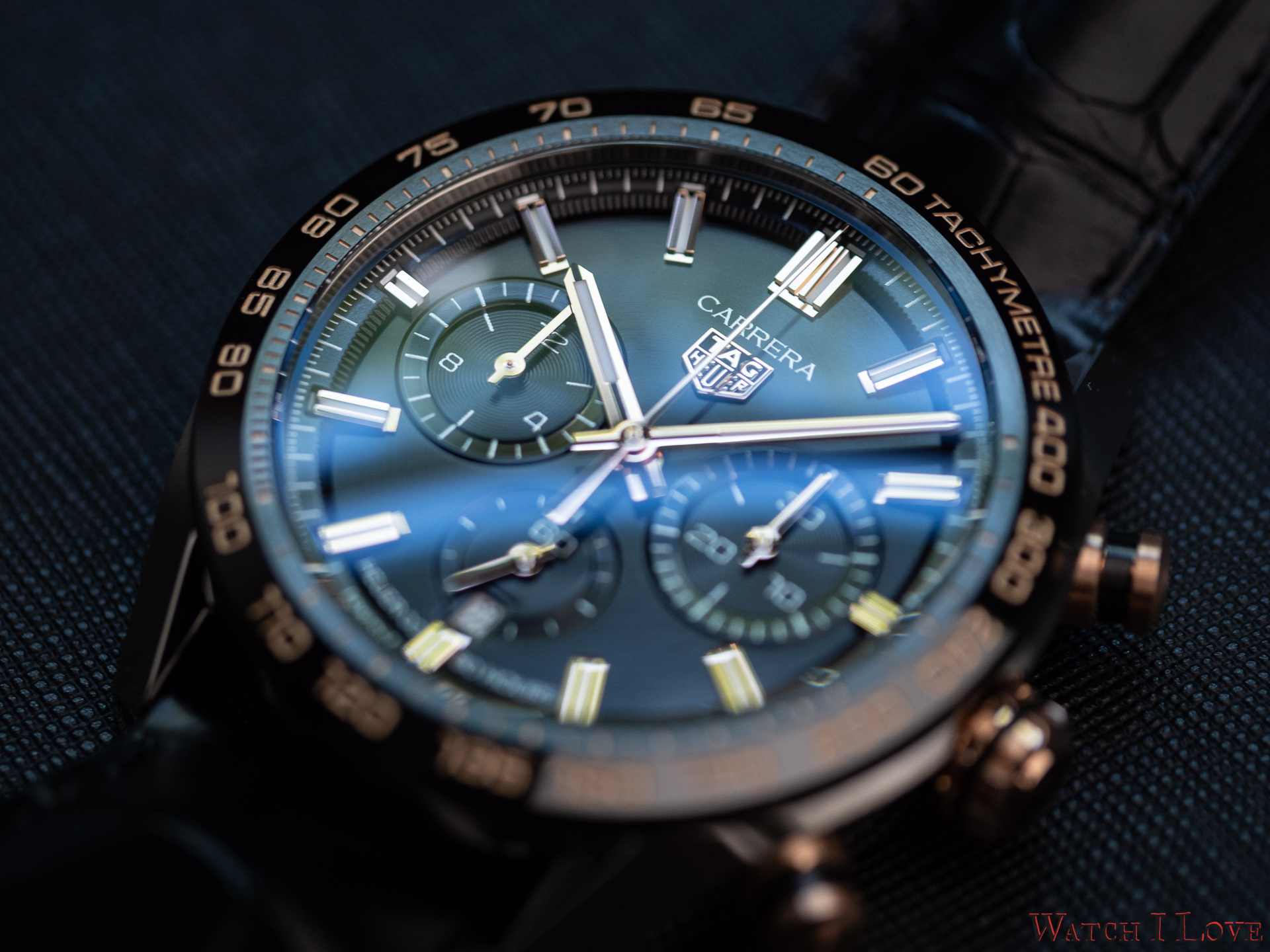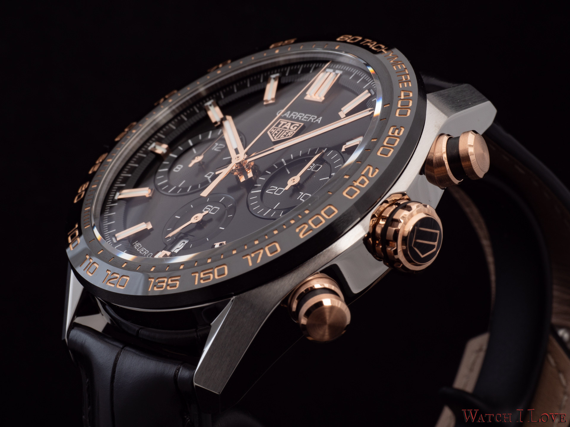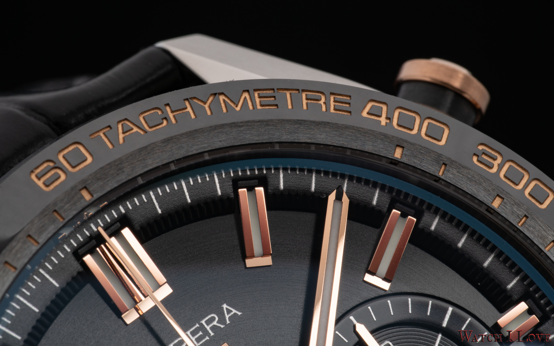 The TAG Heuer logo predominates the upper side of the dial. The 18K 5N rose gold plated piece looks outrageously good on the very fine circular brushed black background of the dial.