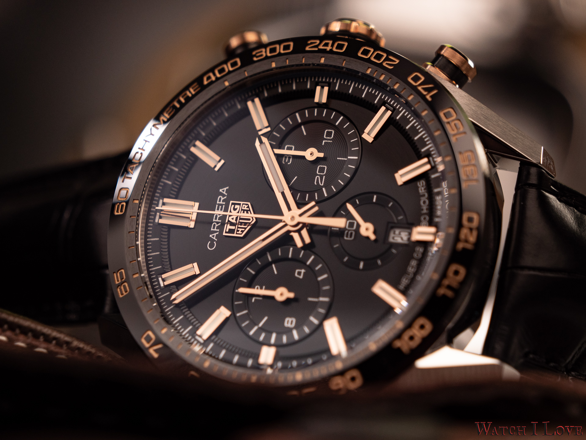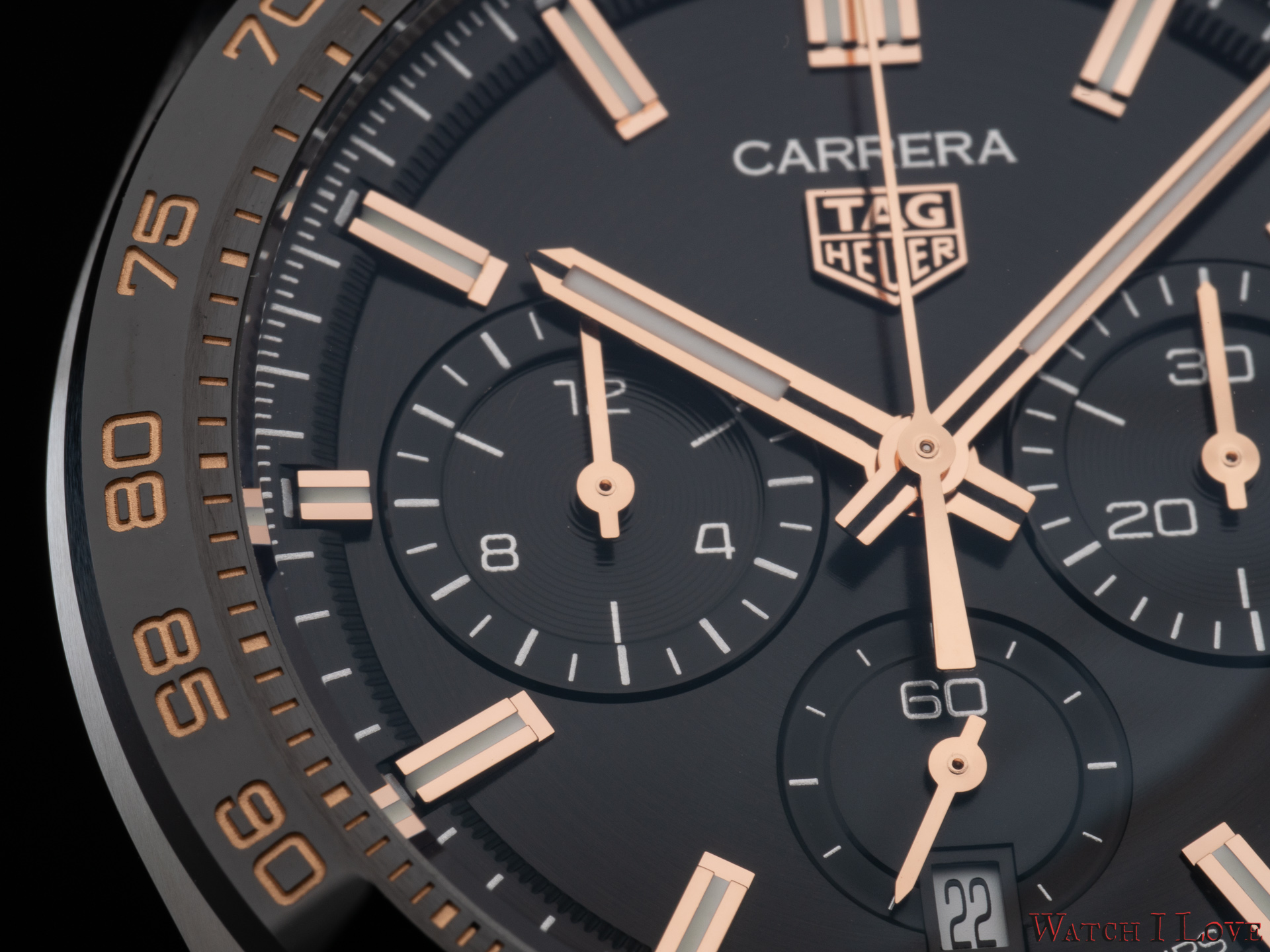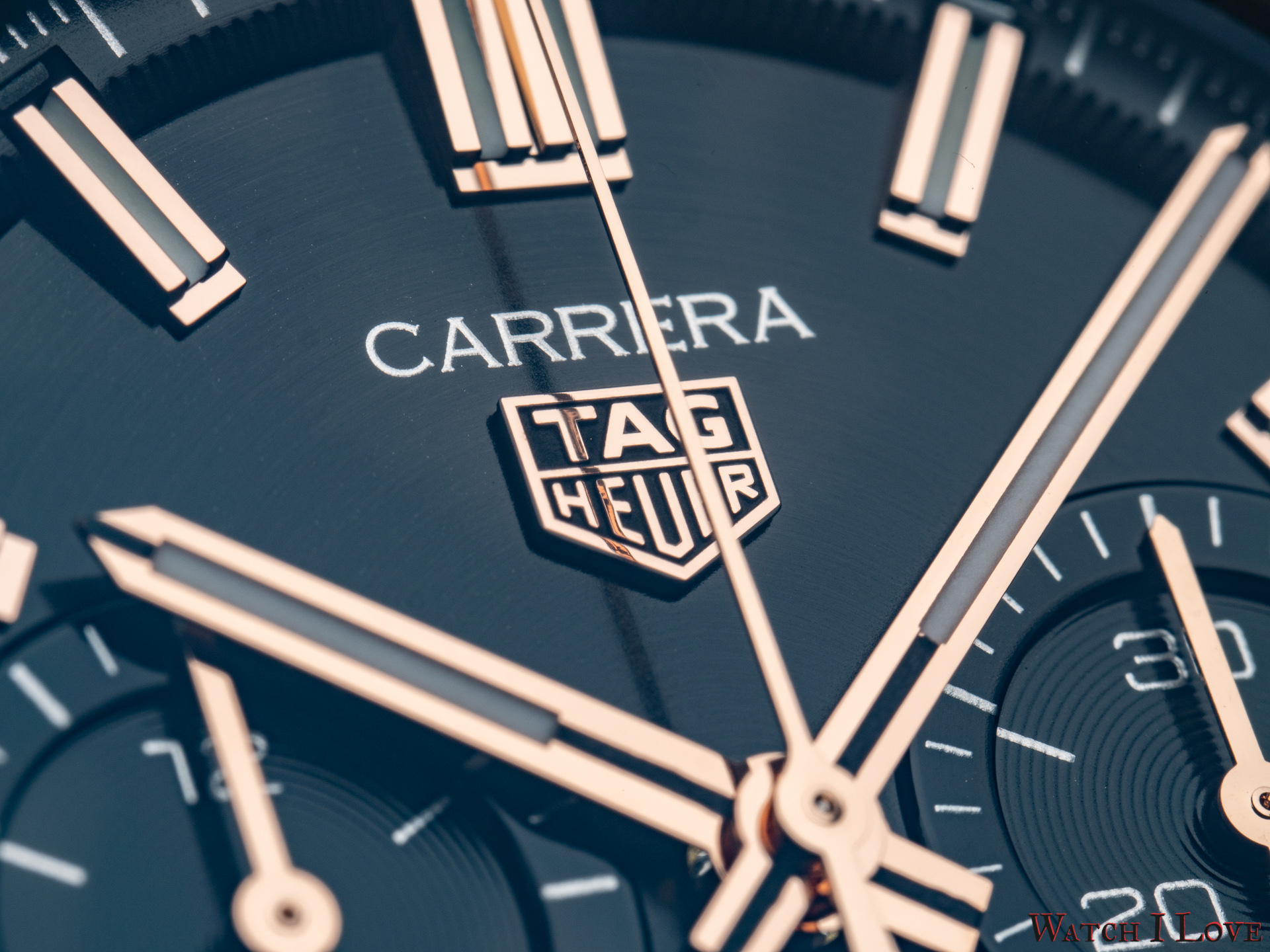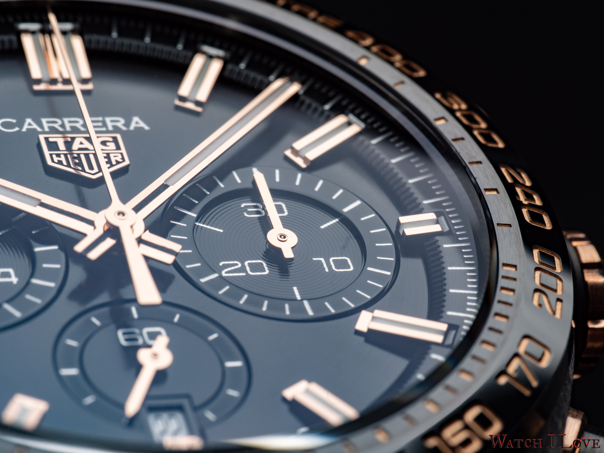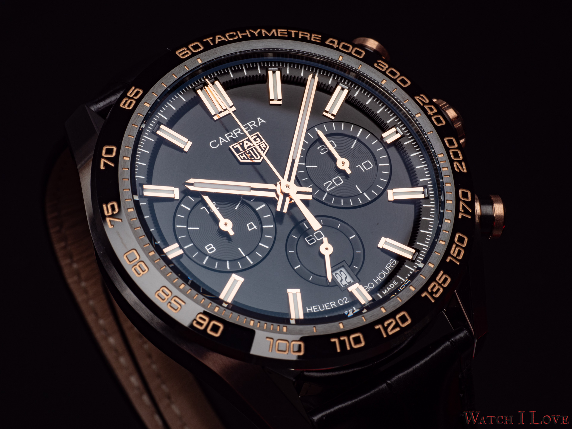 The TAG Heuer logo predominates the upper side of the dial. The 18K 5N rose gold plated piece looks outrageously good on the very fine circular brushed black background of the dial.