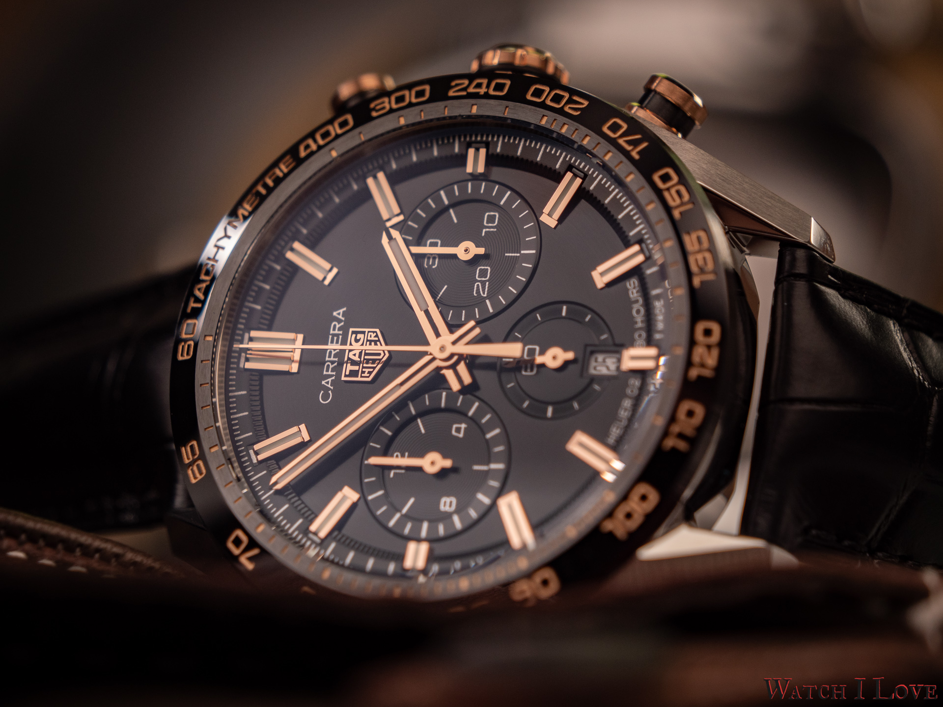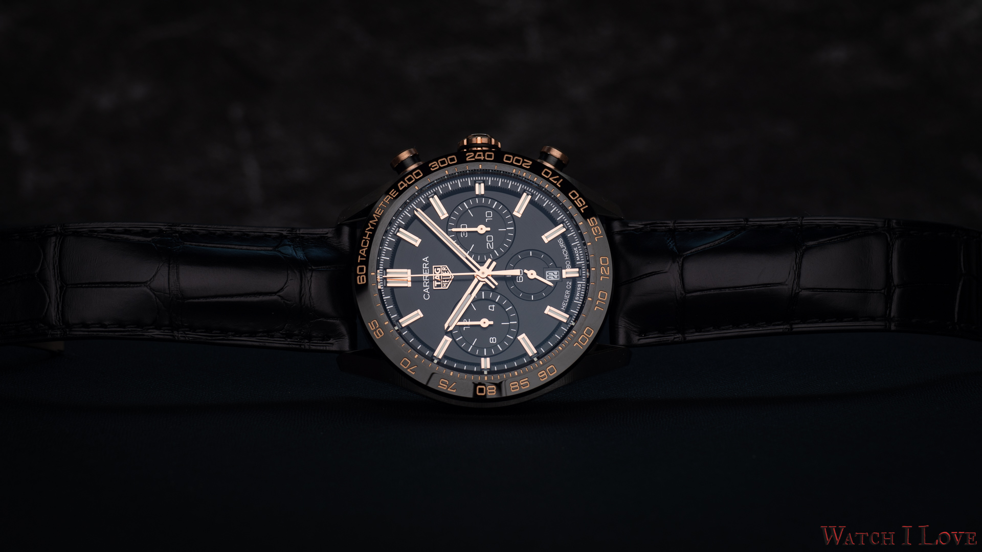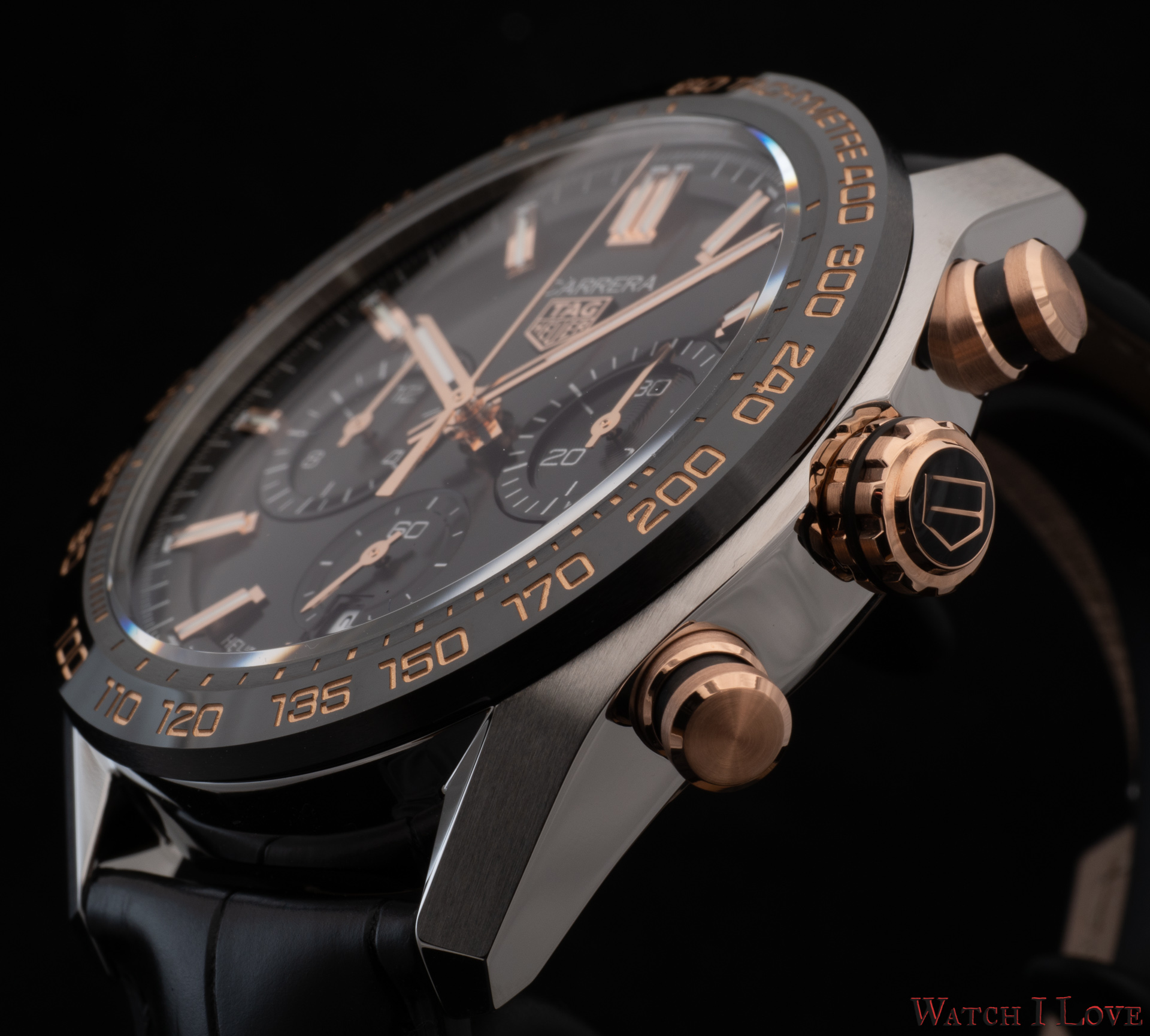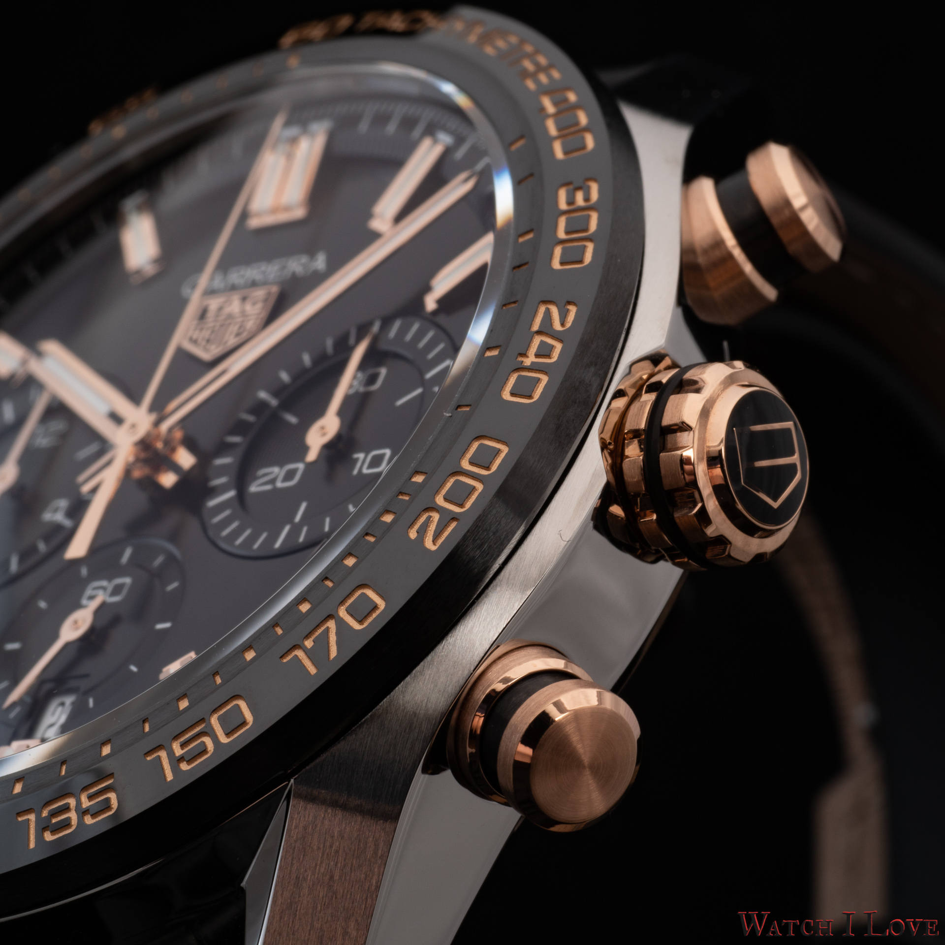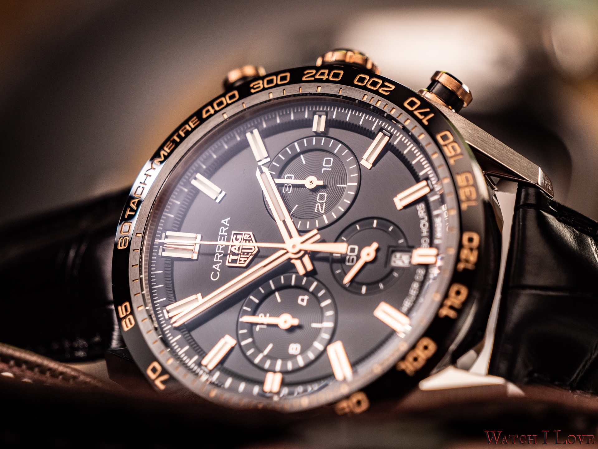 The TAG Heuer logo predominates the upper side of the dial. The 18K 5N rose gold plated piece looks outrageously good on the very fine circular brushed black background of the dial.