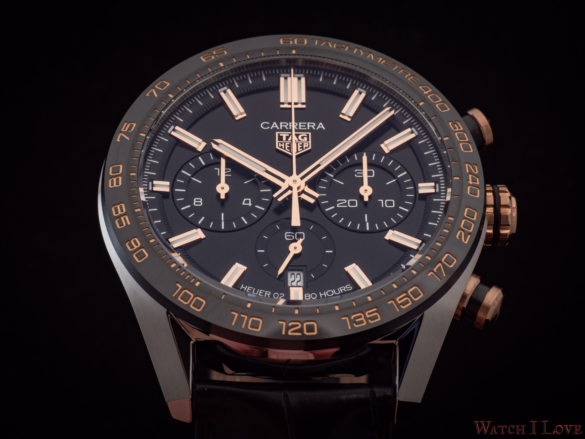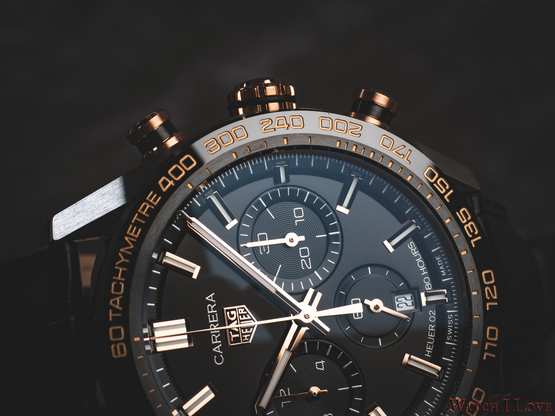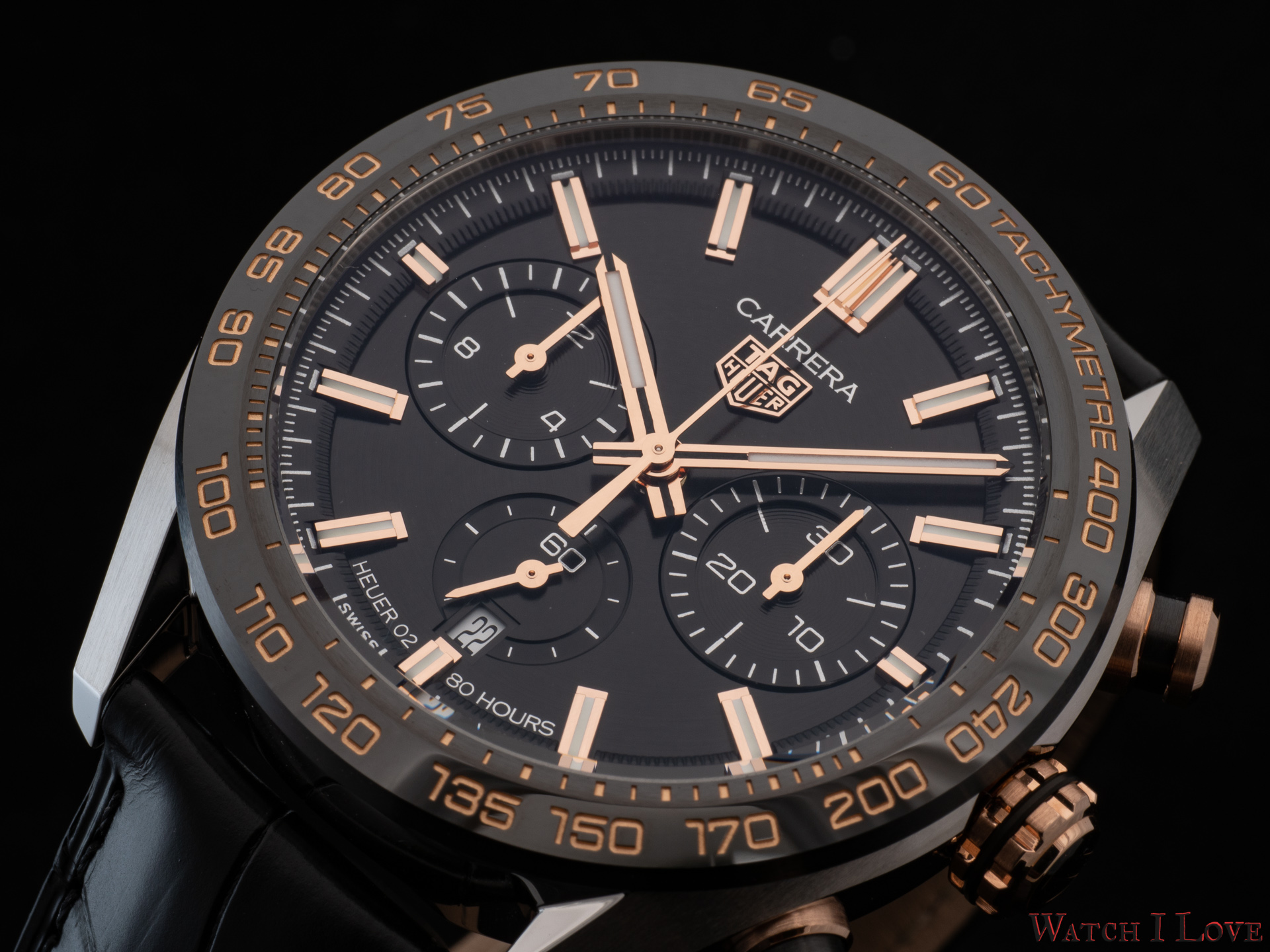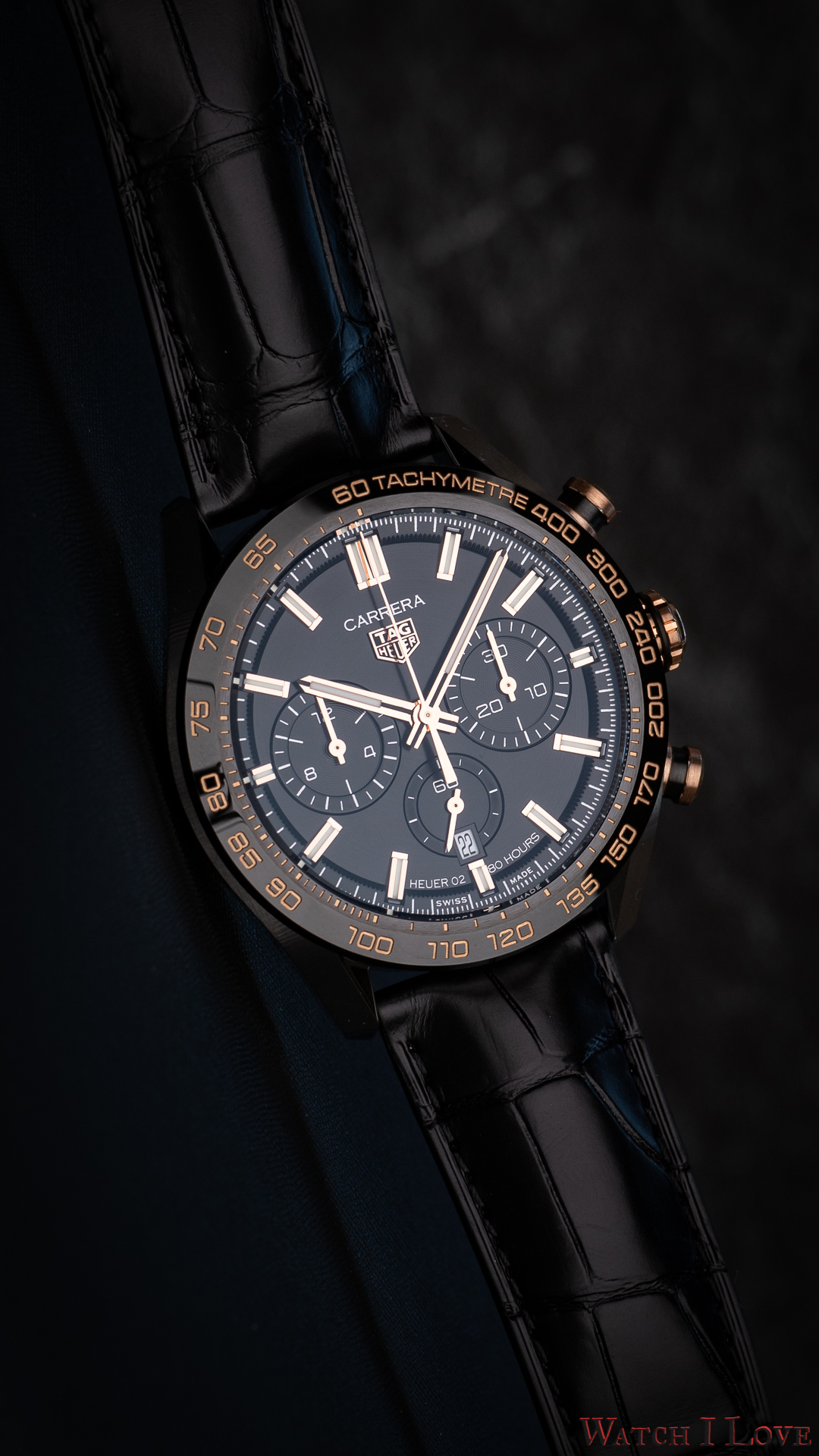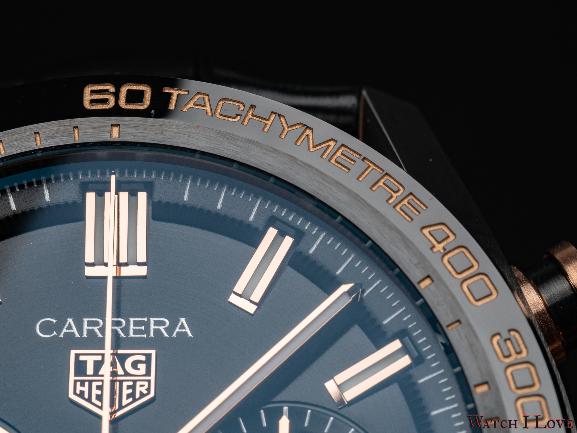 The TAG Heuer logo predominates the upper side of the dial. The 18K 5N rose gold plated piece looks outrageously good on the very fine circular brushed black background of the dial.
