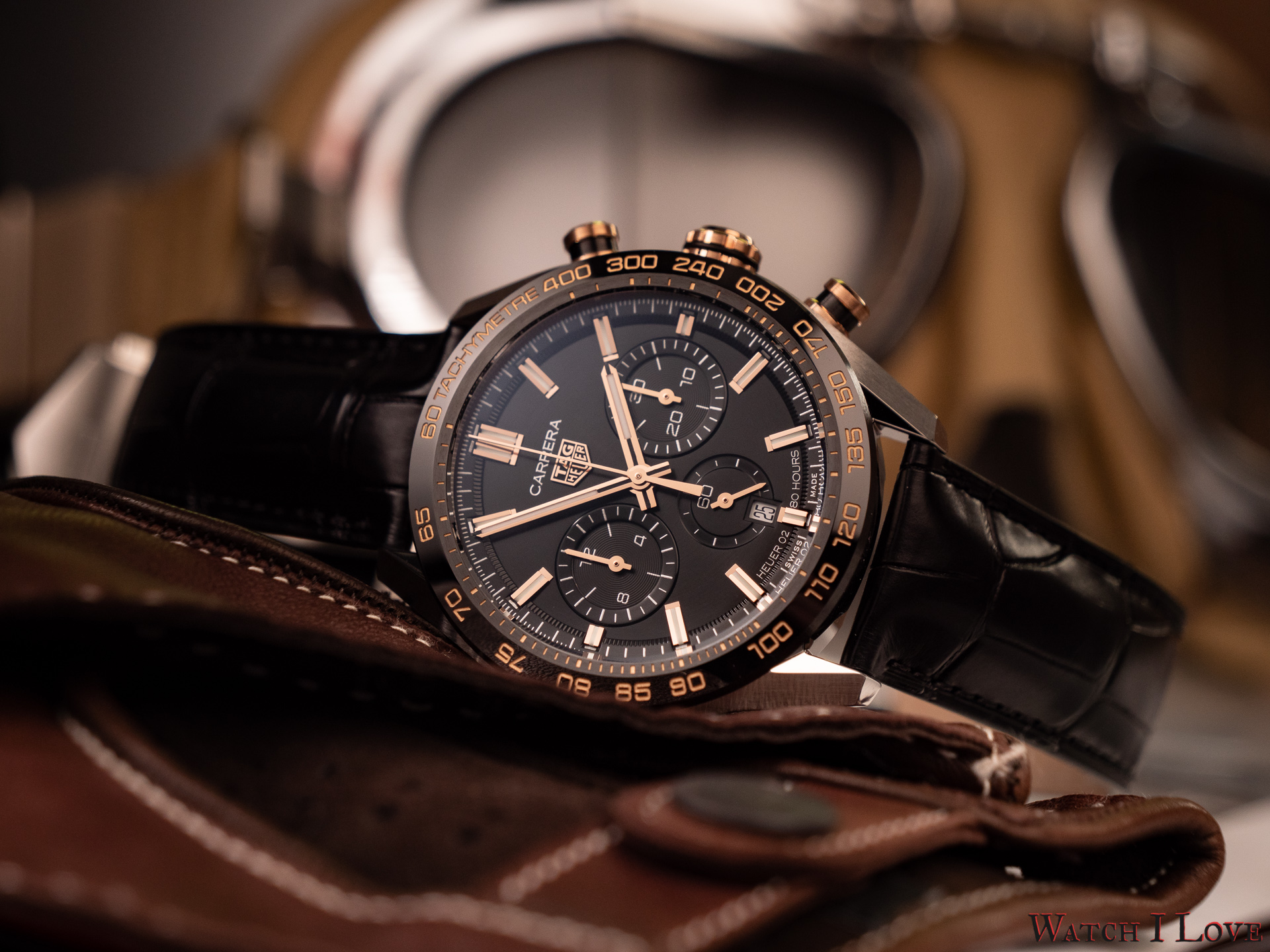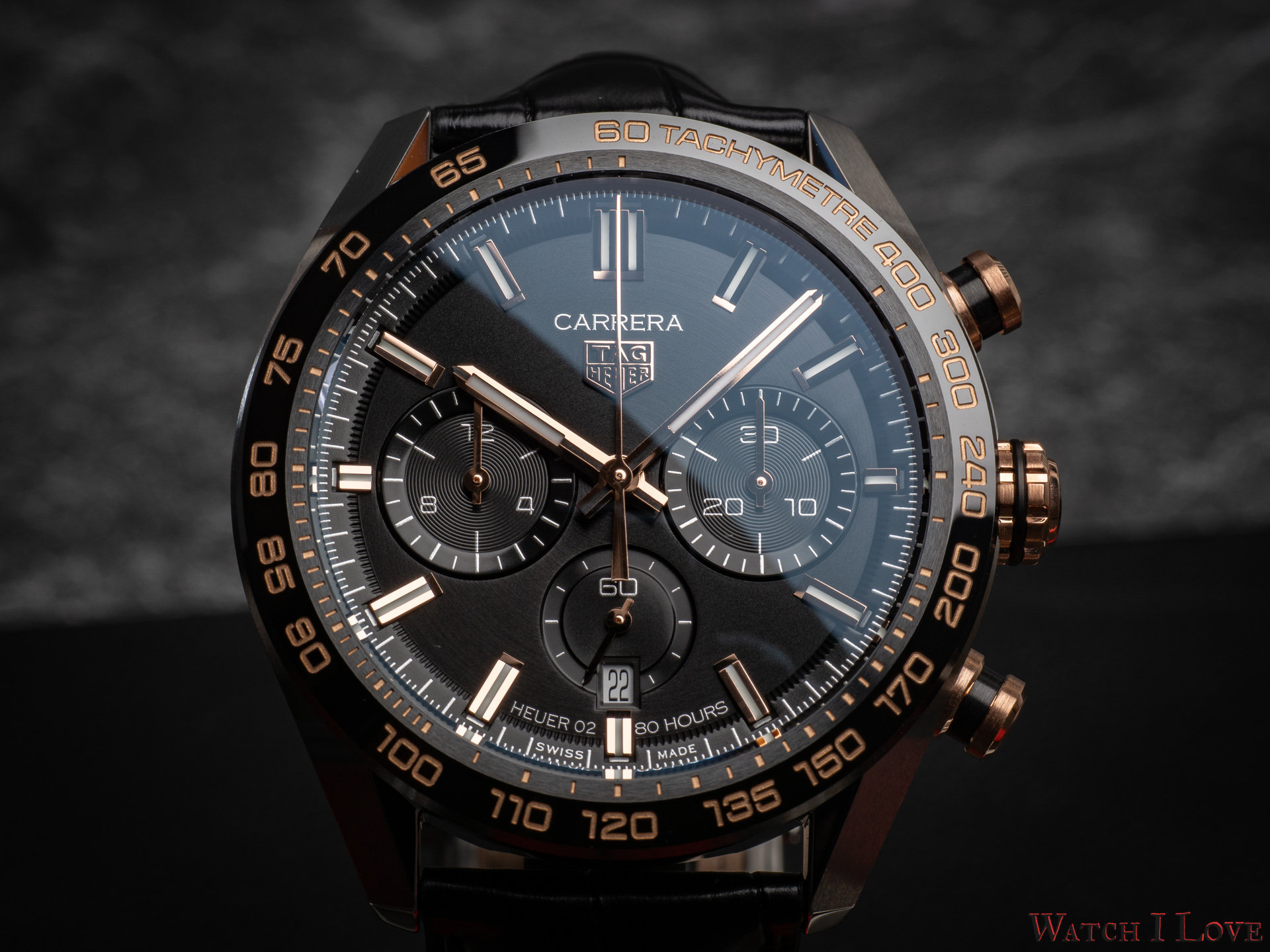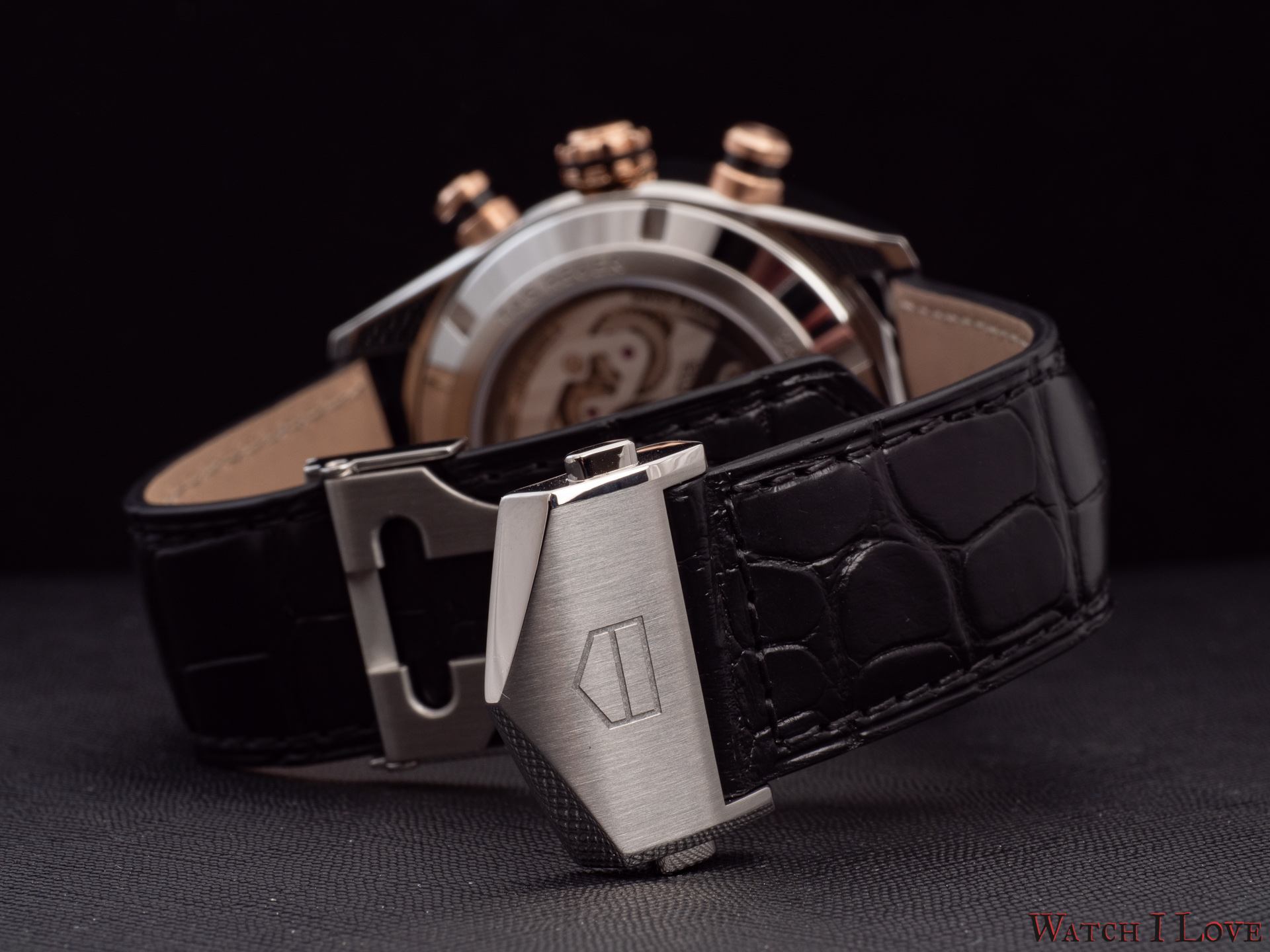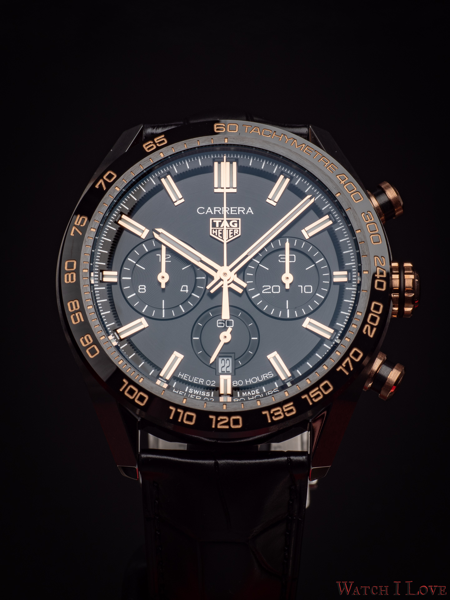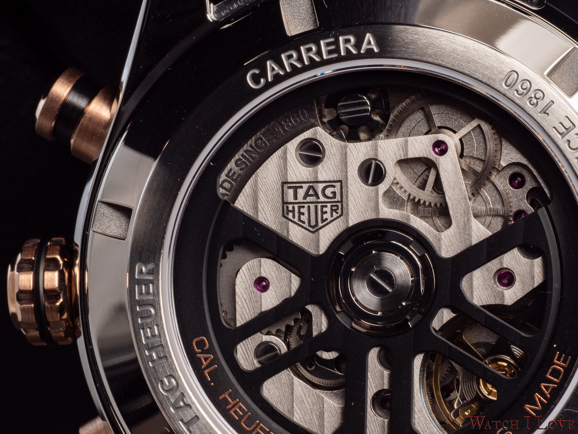 The TAG Heuer logo predominates the upper side of the dial. The 18K 5N rose gold plated piece looks outrageously good on the very fine circular brushed black background of the dial.