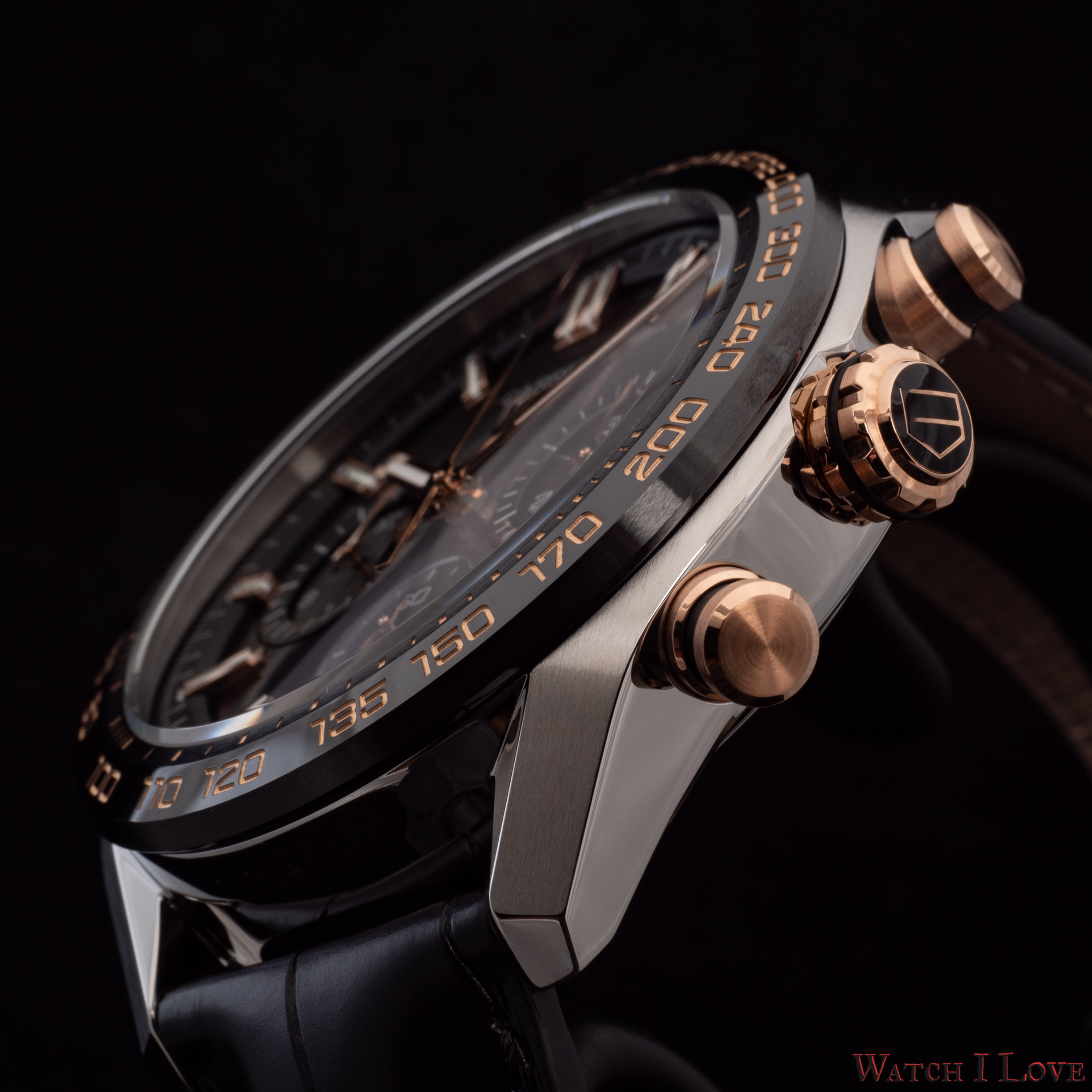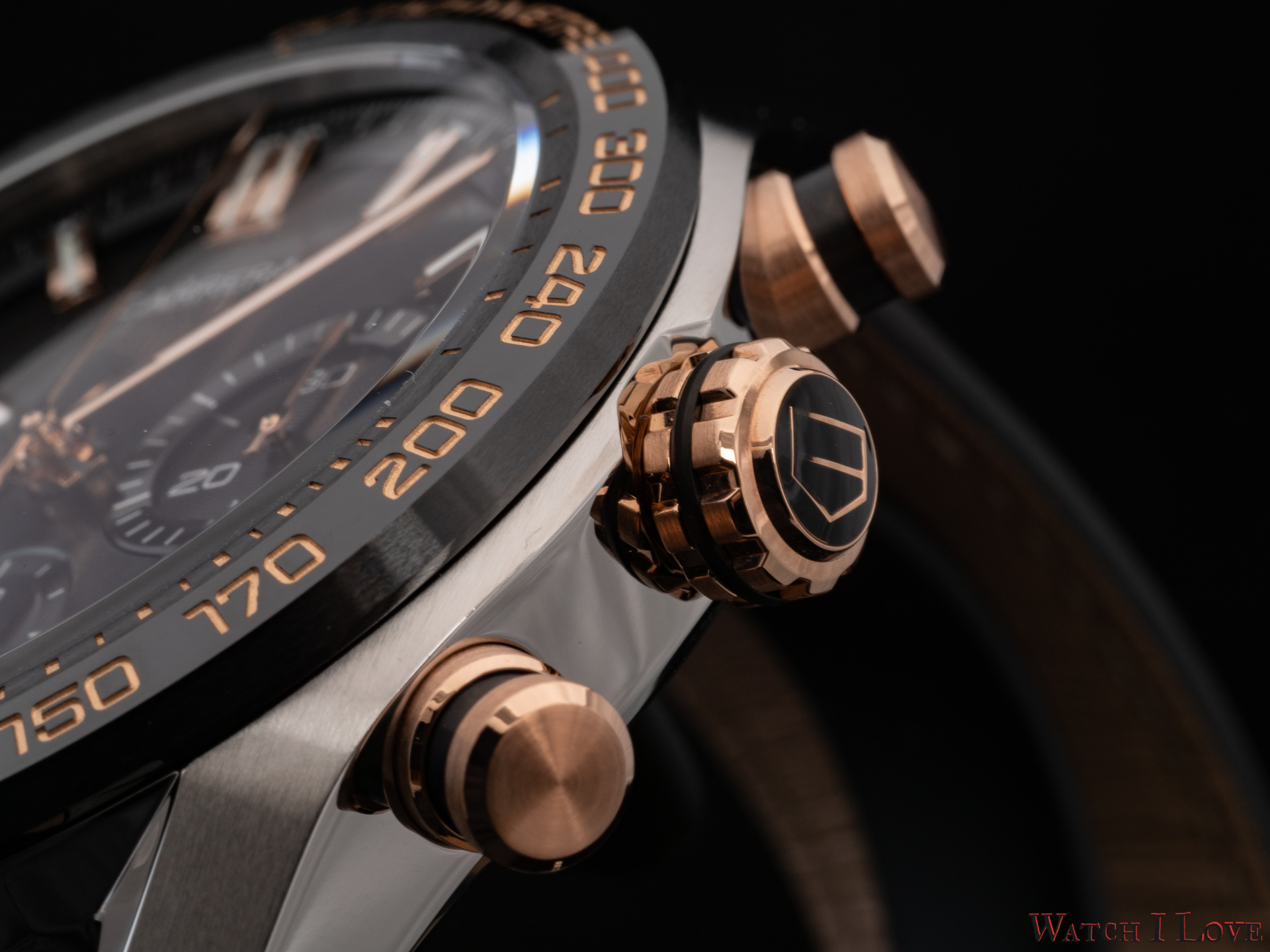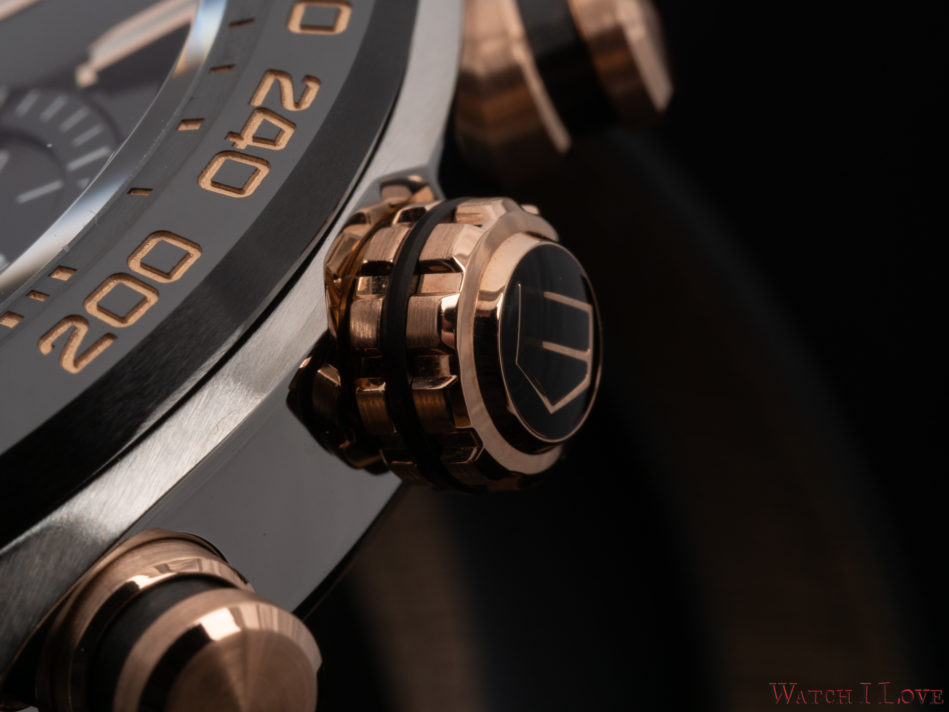 The right side of the TAG Heuer Carrera Sport Chronograph 44 mm Calibre HEUER02 Automatic presents the rose gold crown and pushers. The combination of black and gold is awesome. The bevelled pushers are fixed on the case via 5N rose gold cylindrical holders.
