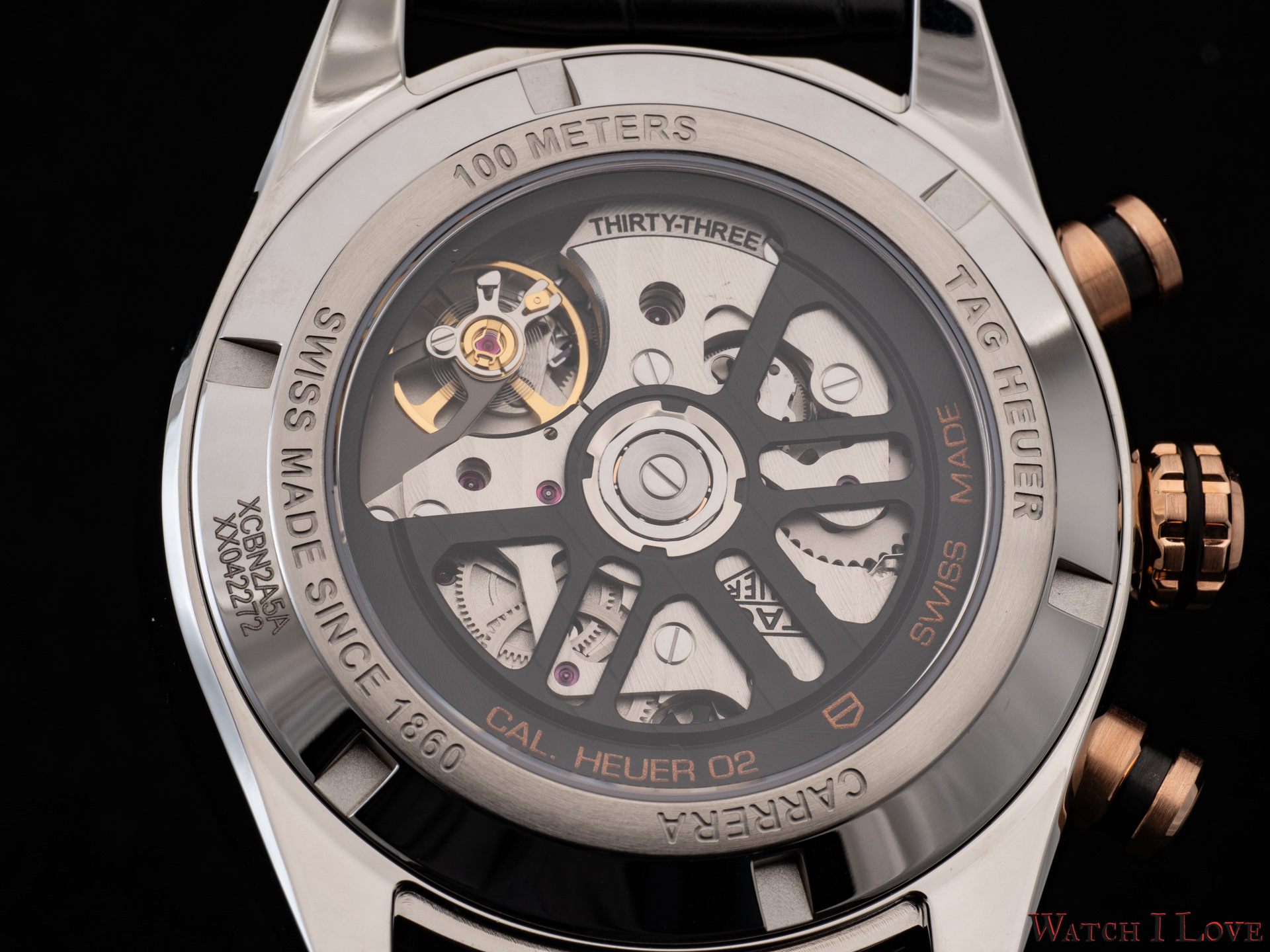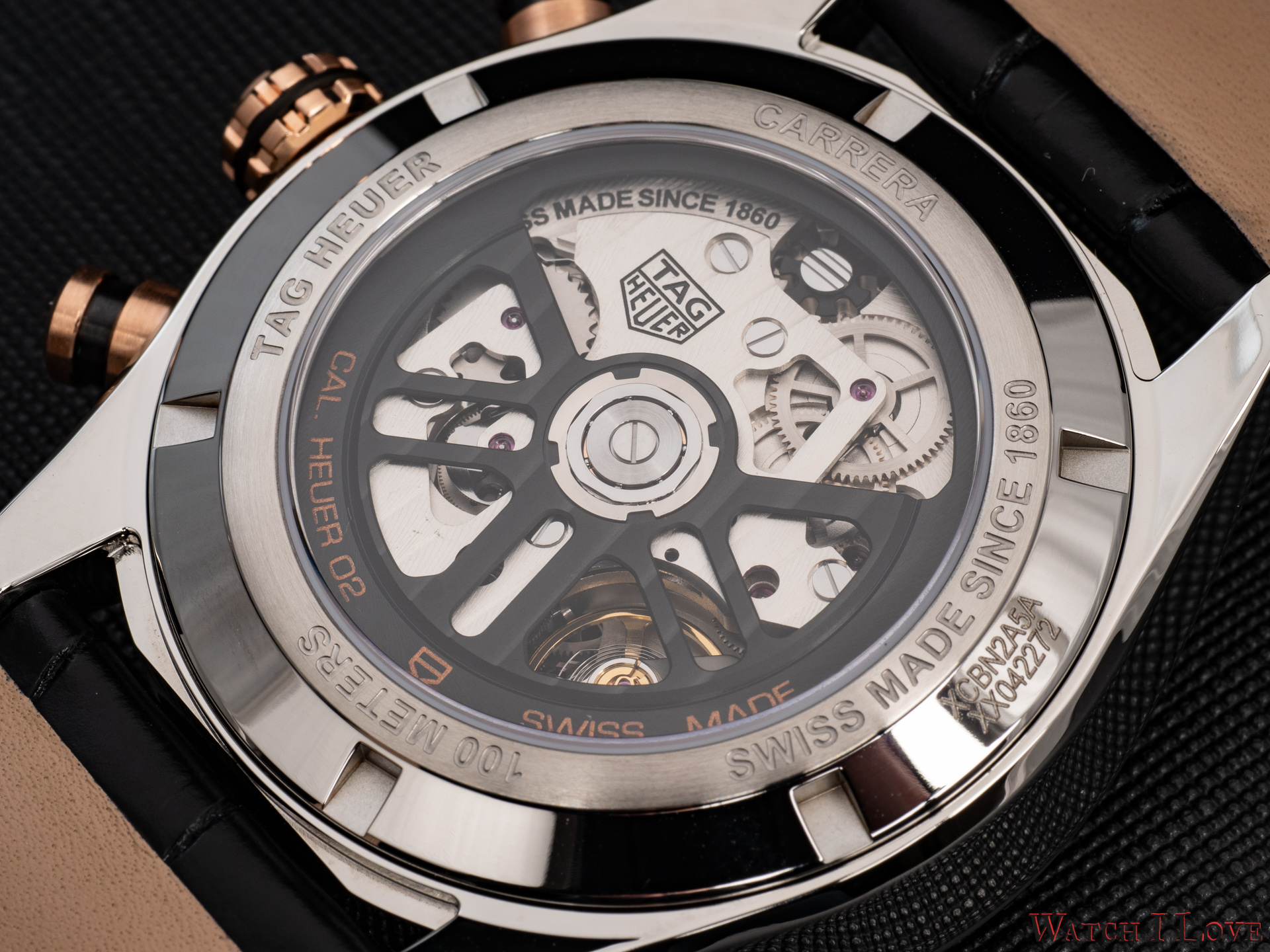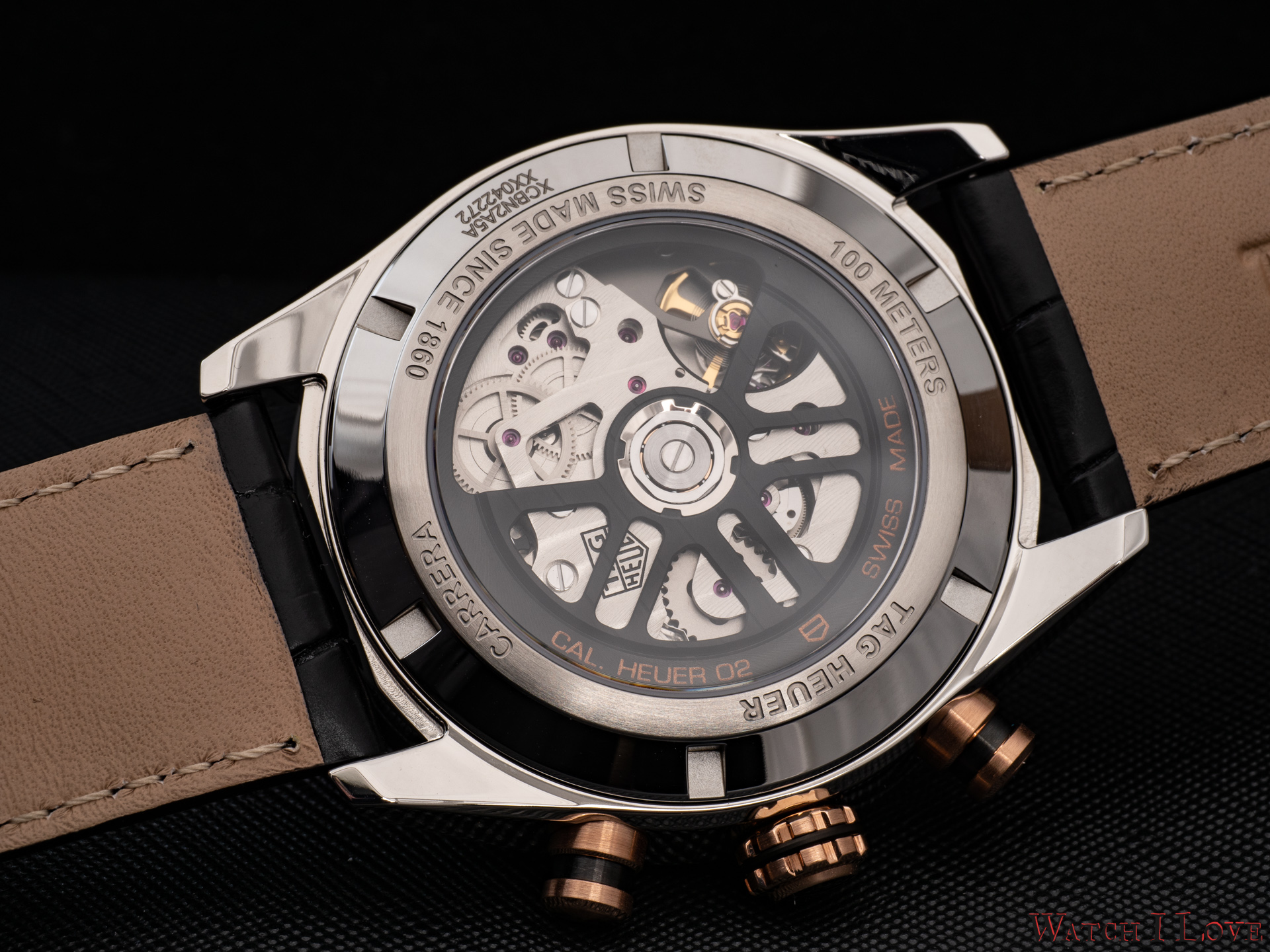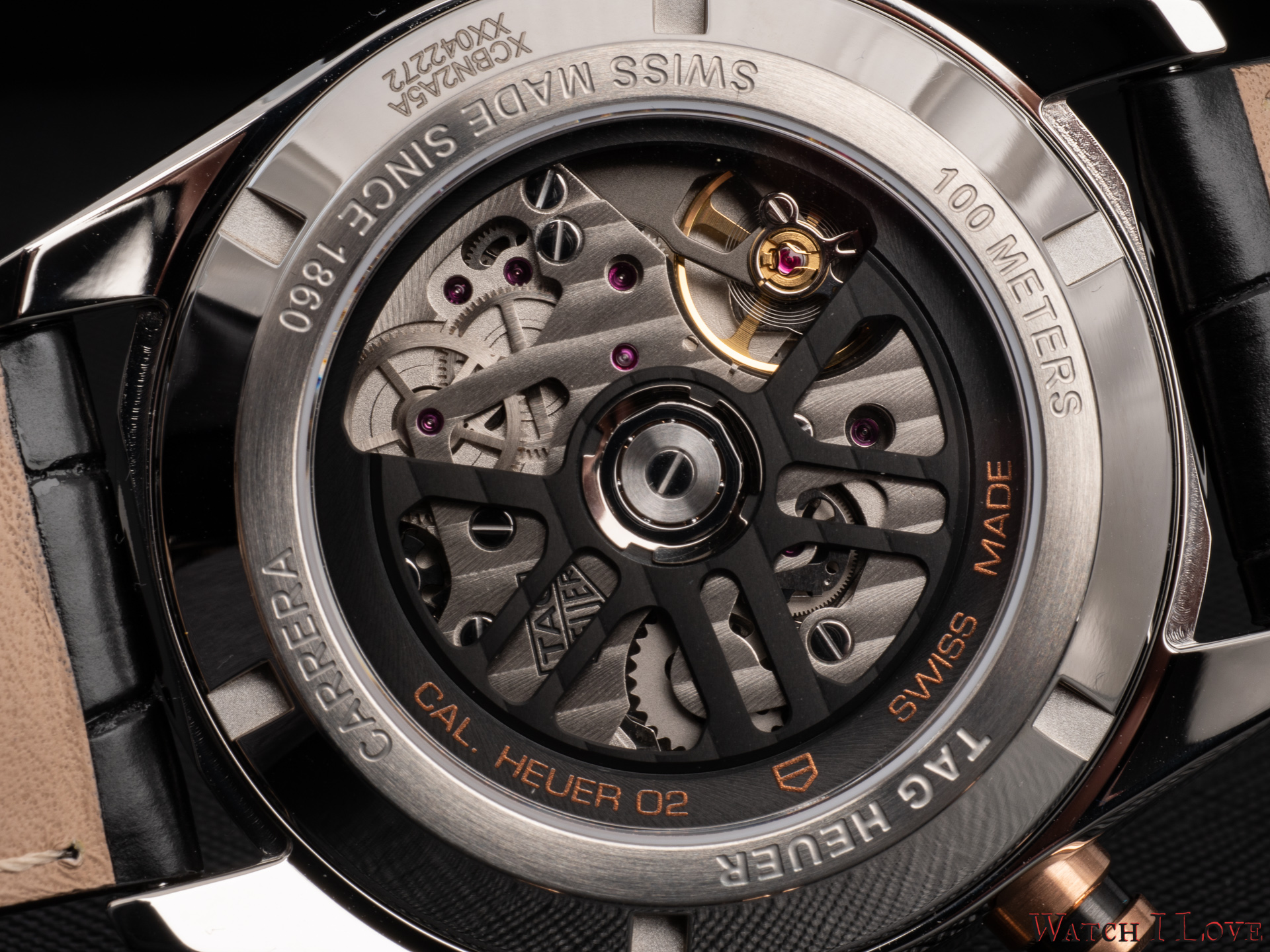 The back of the watch reveals the Calibre Heuer 02 through a screwed-in exhibition steel caseback.
