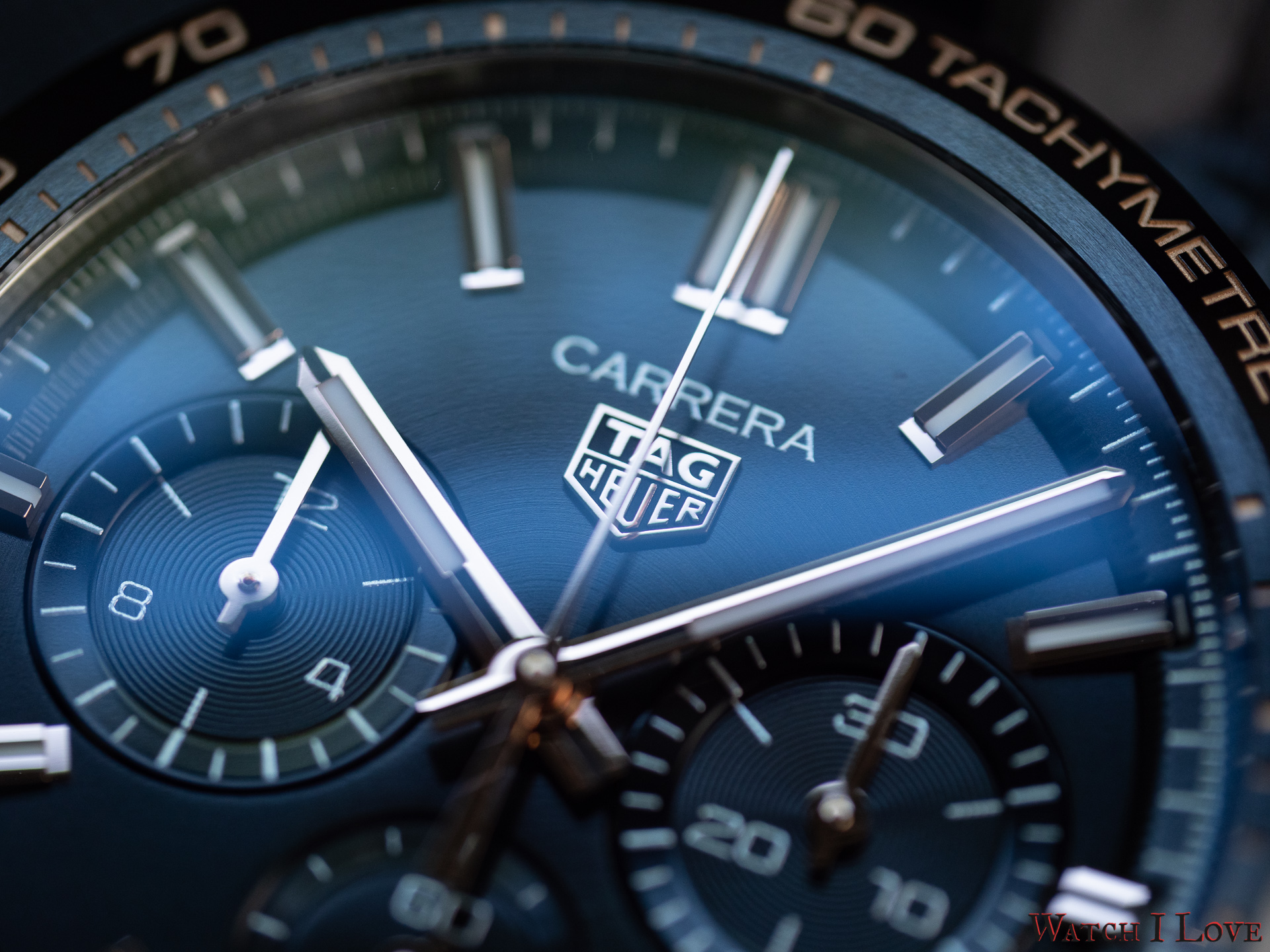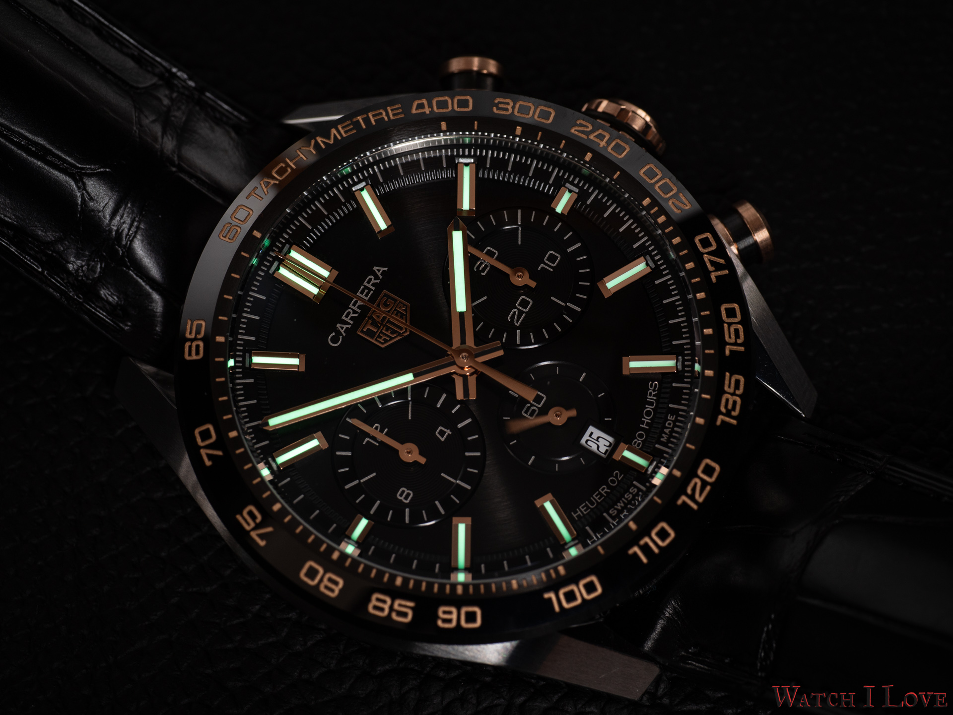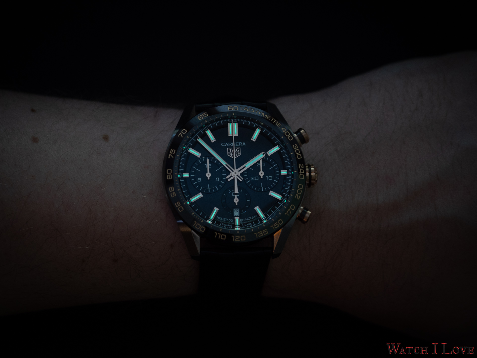 The low light view of the TAG Heuer Carrera Sport Chronograph is superb. The lack of luminescent material on the chrono hands and indexes will prevent the chronograph to be used in complete darkness, but the time legibility is quite good.