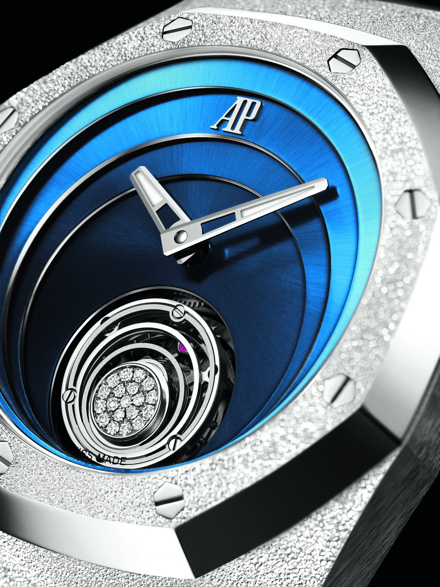 Available in 18-carat pink or white gold, the new Royal Oak Concept Flying Tourbillon combines the case’s shimmering Frosted Gold finish with a contemporary dial composed of multiple layers. For the first time, the Royal Oak Concept’s case is adorned with Frosted Gold—an ancient Florentine jewellery technique revisited by jewellery designer Carolina Bucci and adapted to adorn the Manufacture’s watches. Tiny indentations are created on the gold surface with a diamond-tipped tool, giving a sparkle effect similar to that of precious stones, like diamond dust. Superposed to the bezel’s polished bevels, this finishing highlights the watch’s design codes, while capturing attention from a distance.
